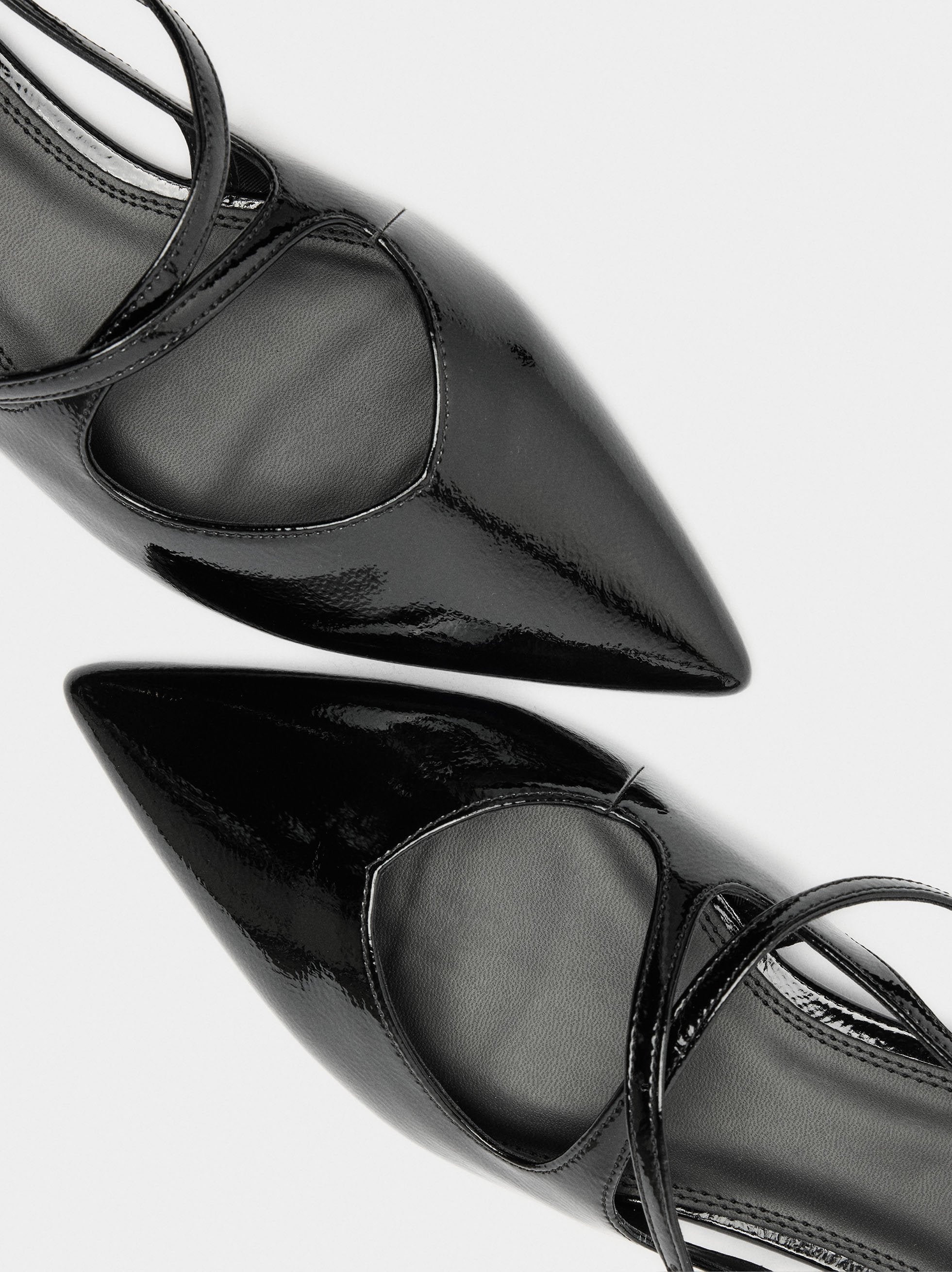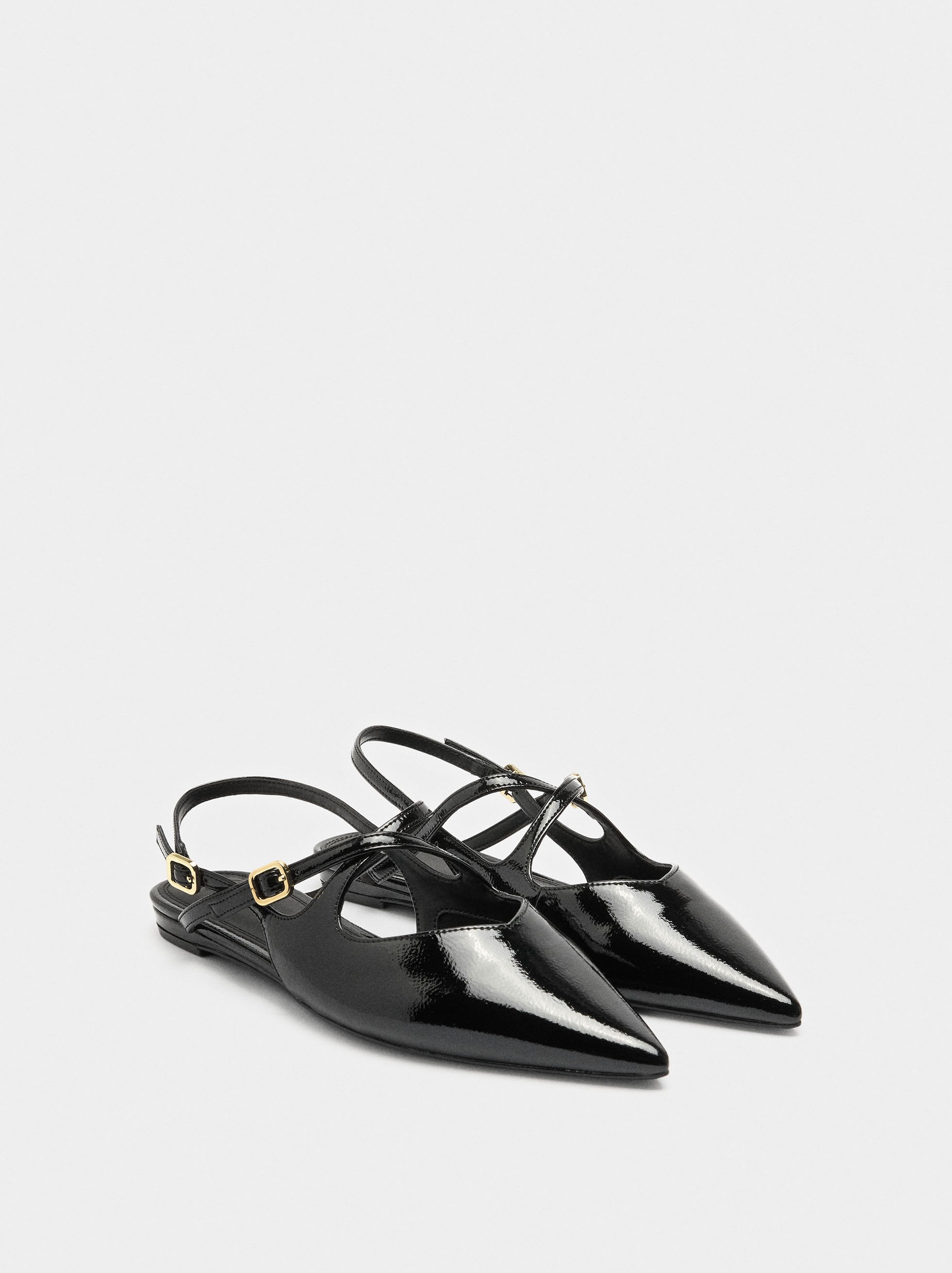 Bailarinas de charol estilo mule. Tiras cruzadas en el empeine y el tobillo, ambas ajustables con hebillas. Punta puntiaguda. Suela de goma.