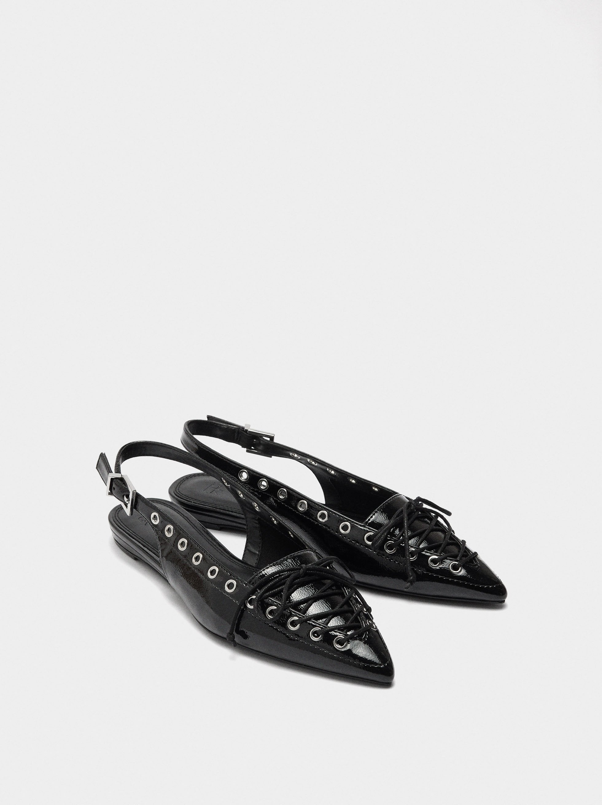 Bailarinas destalonadas de charol, con tachuelas y cordón cruzado en la parte delantera. Tira ajustable en el tobillo con hebilla. Punta afilada. Suela de goma.