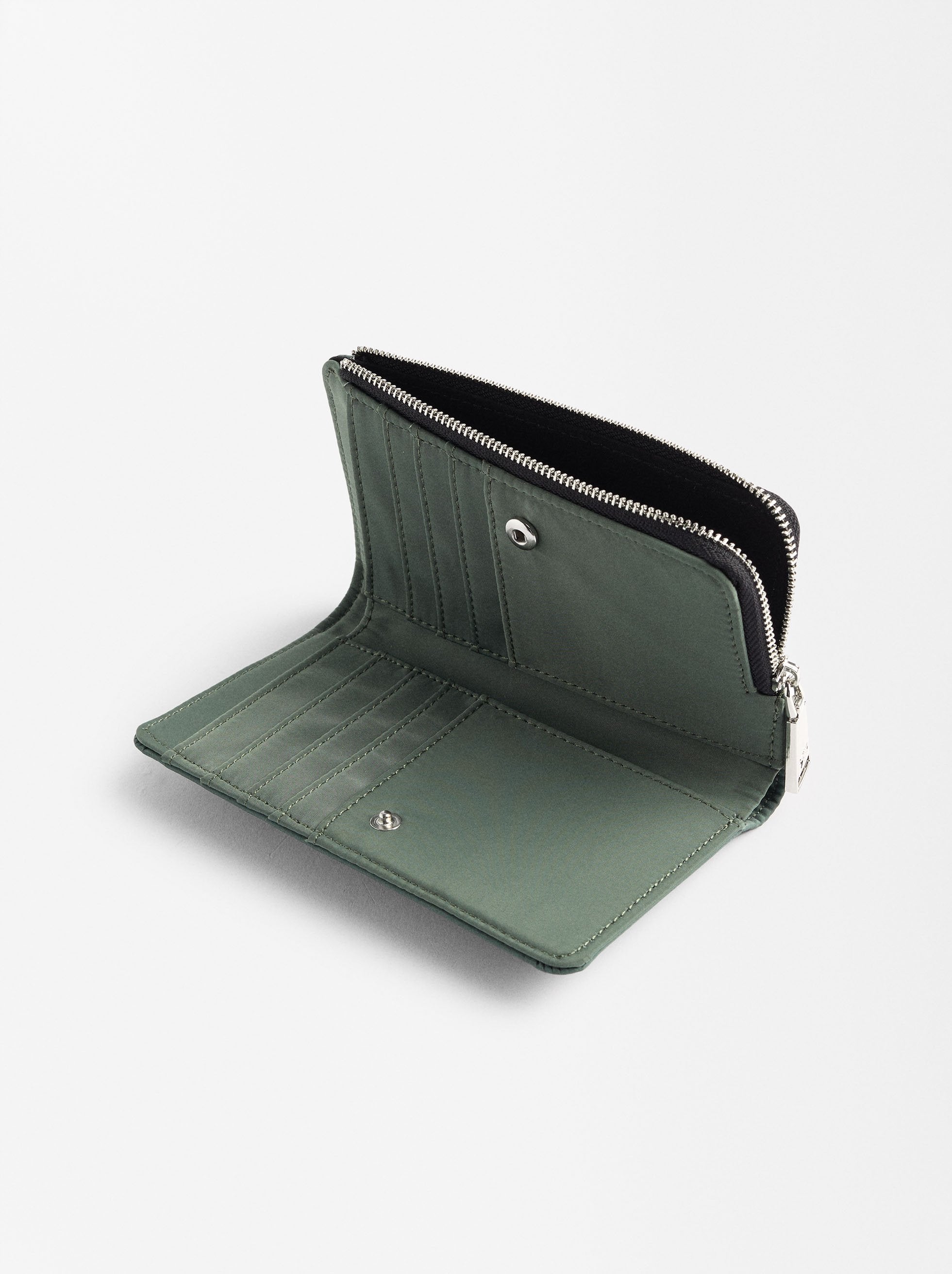 Cartera de nylon estampado de tamaño mediano. Ranuras para tarjetas y billetes. Compartimento con cierre de cremallera para monedas. Cierre con botón a presión.