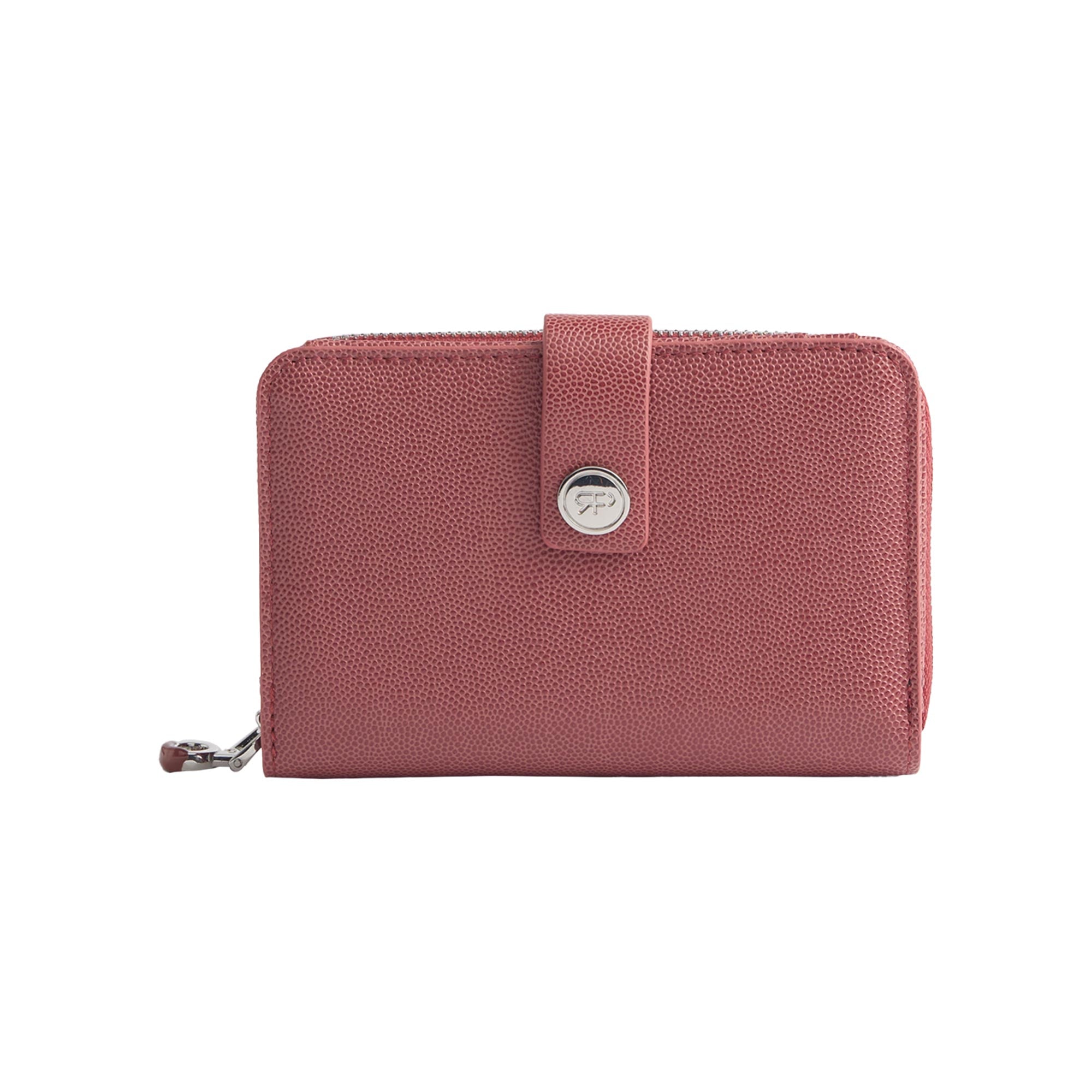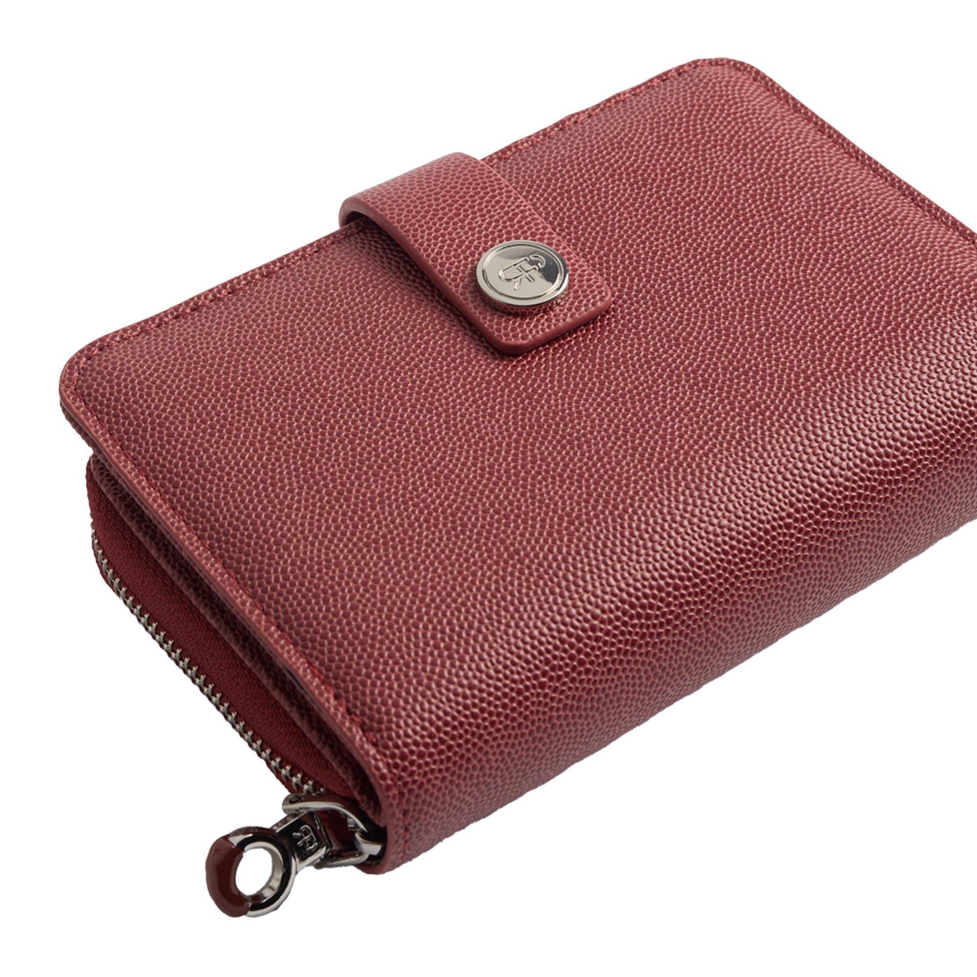 Cartera mediana con textura. Compartimento para tarjetas y billetes con cierre de botón a presión. División con cierre de cremallera para monedas.