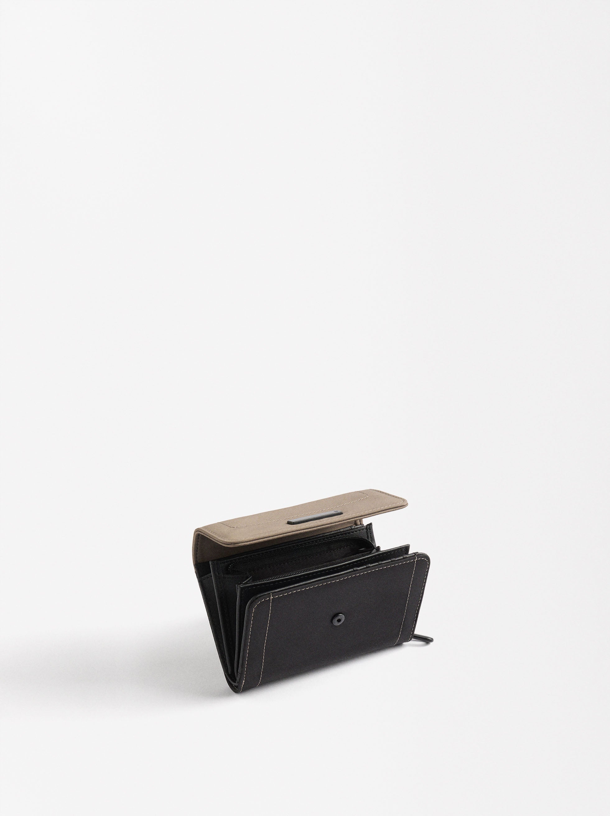 Cartera color block con efecto nylon. Cierre de solapa con botón a presión. Ranuras para tarjetas y billetes. Compartimento con cierre de cremallera para monedas.