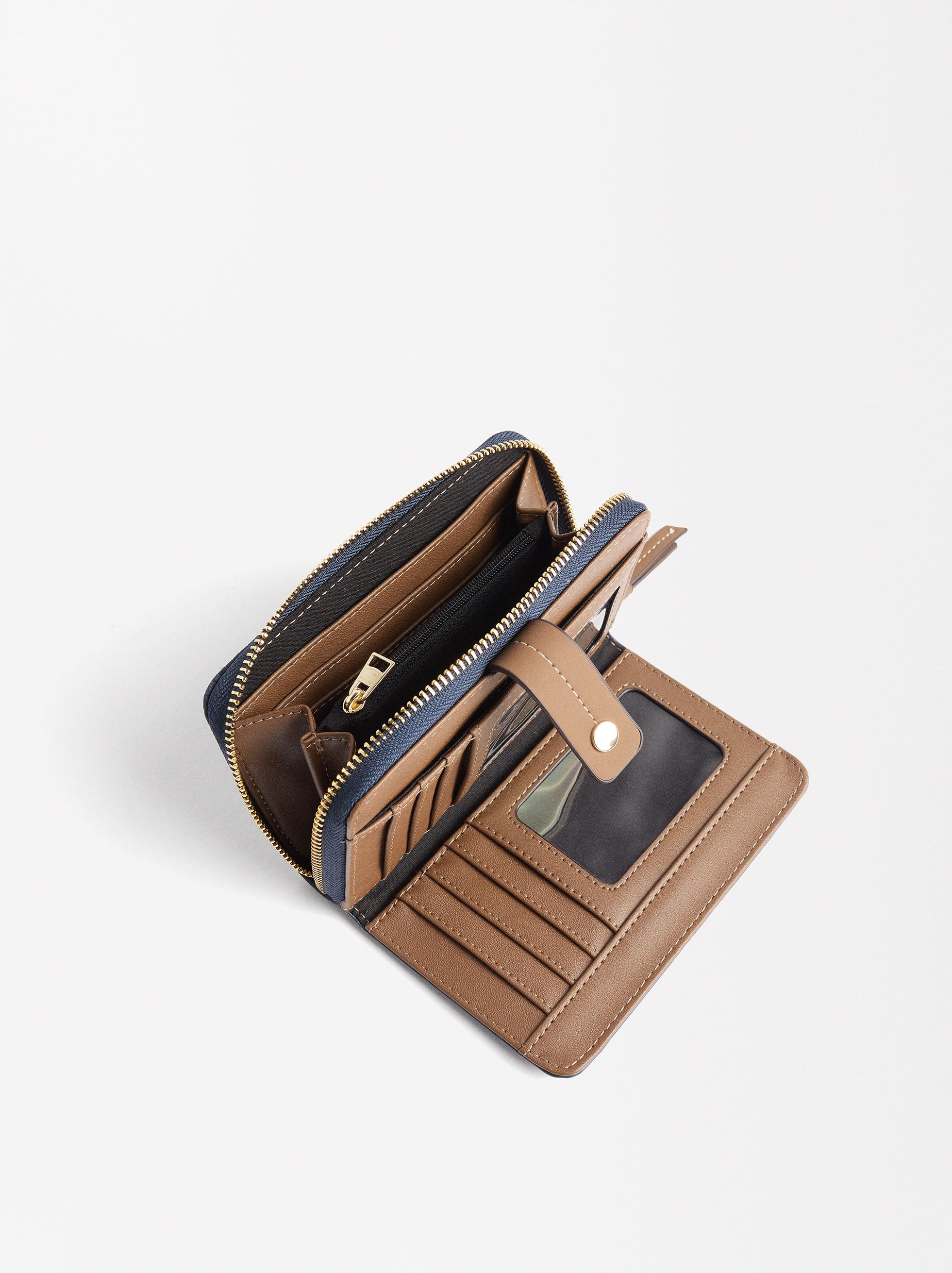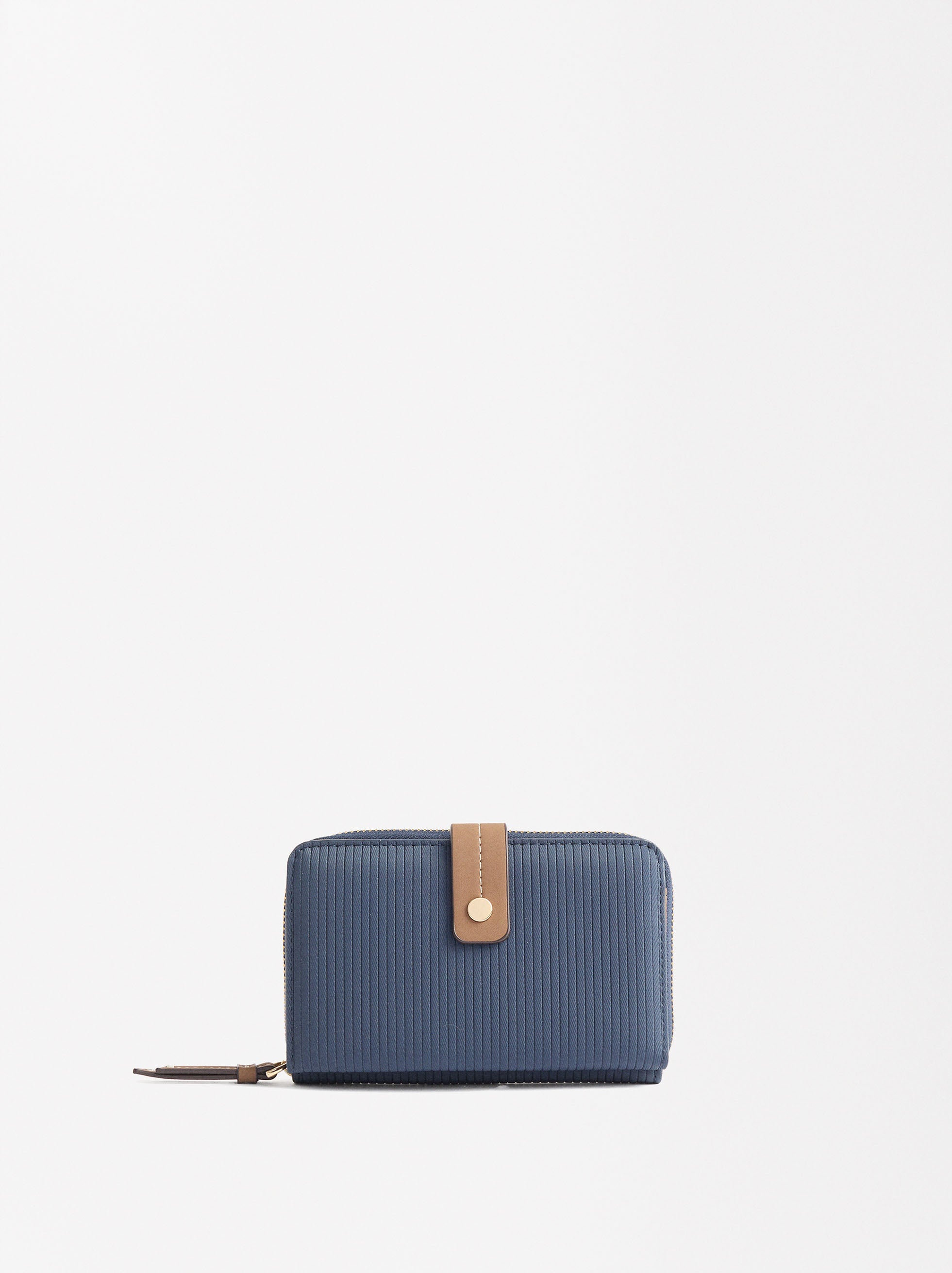 Cartera con textura canalada en dos colores. División con ranuras para tarjetas y billetes con cierre de botón a presión. Compartimento con cierre de cremallera para monedas.