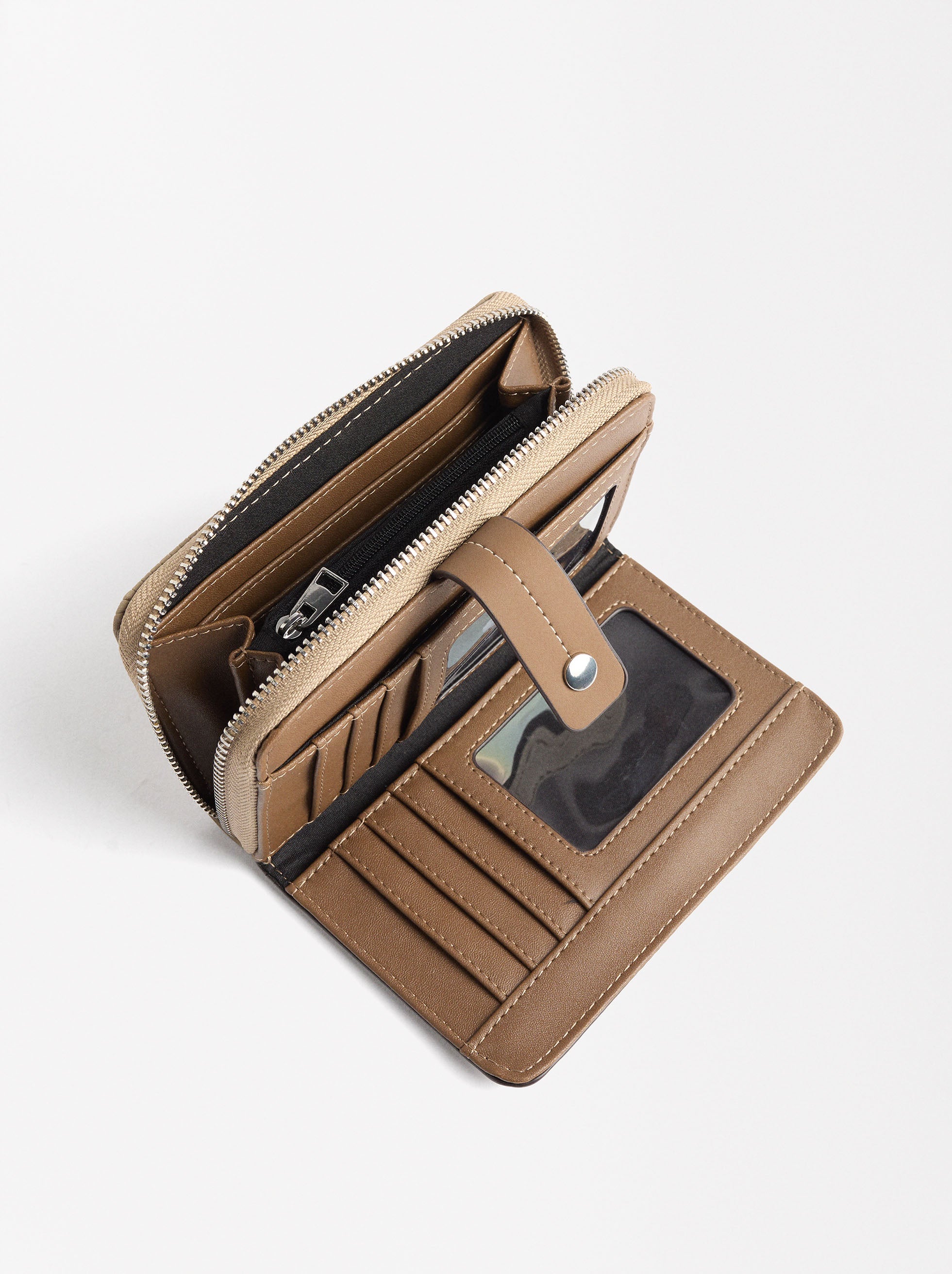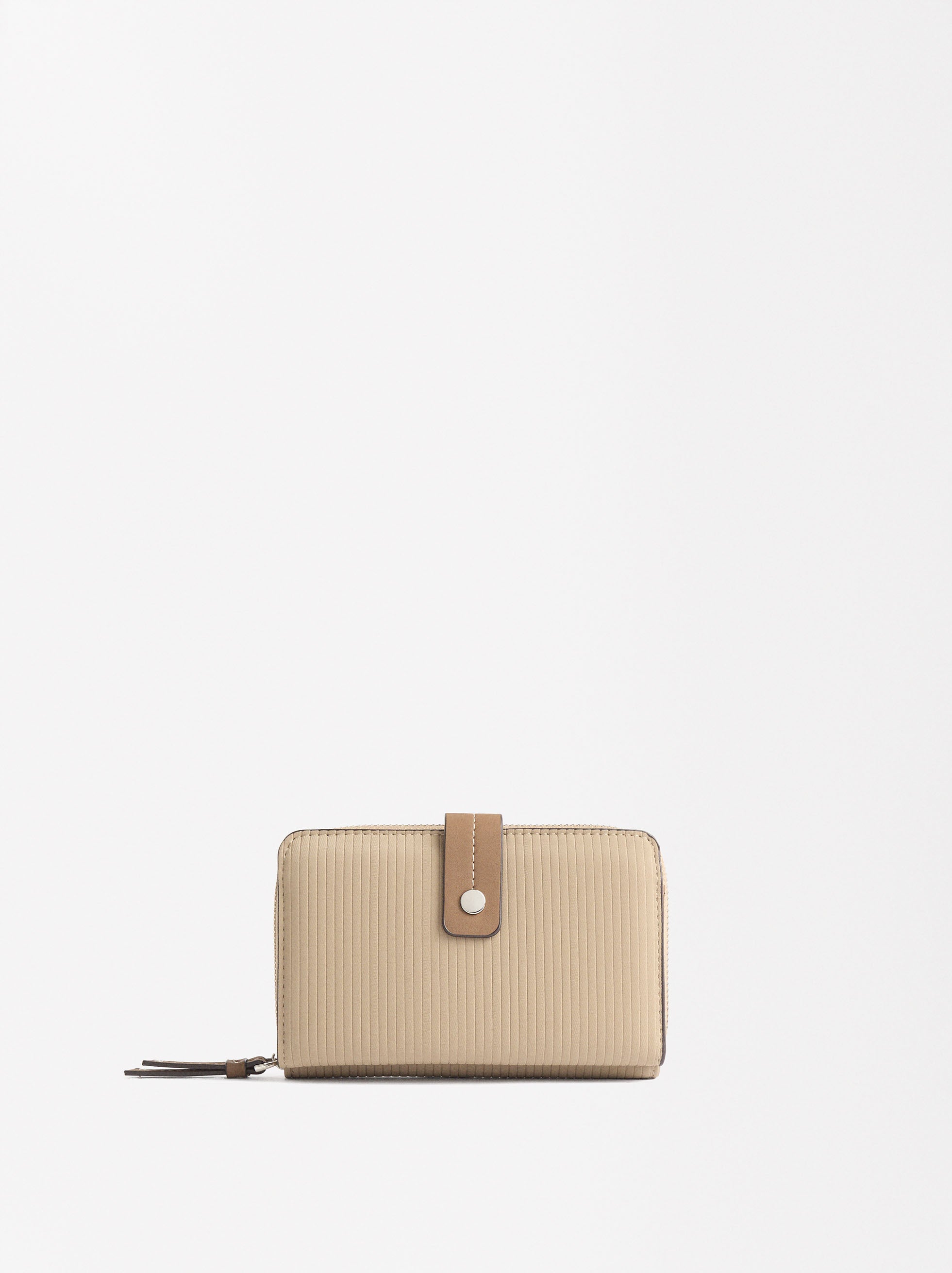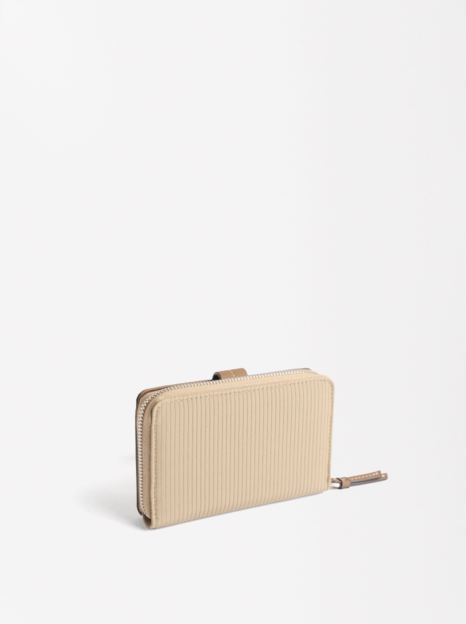 Cartera con textura canalada en dos colores. División con ranuras para tarjetas y billetes con cierre de botón a presión. Compartimento con cierre de cremallera para monedas.