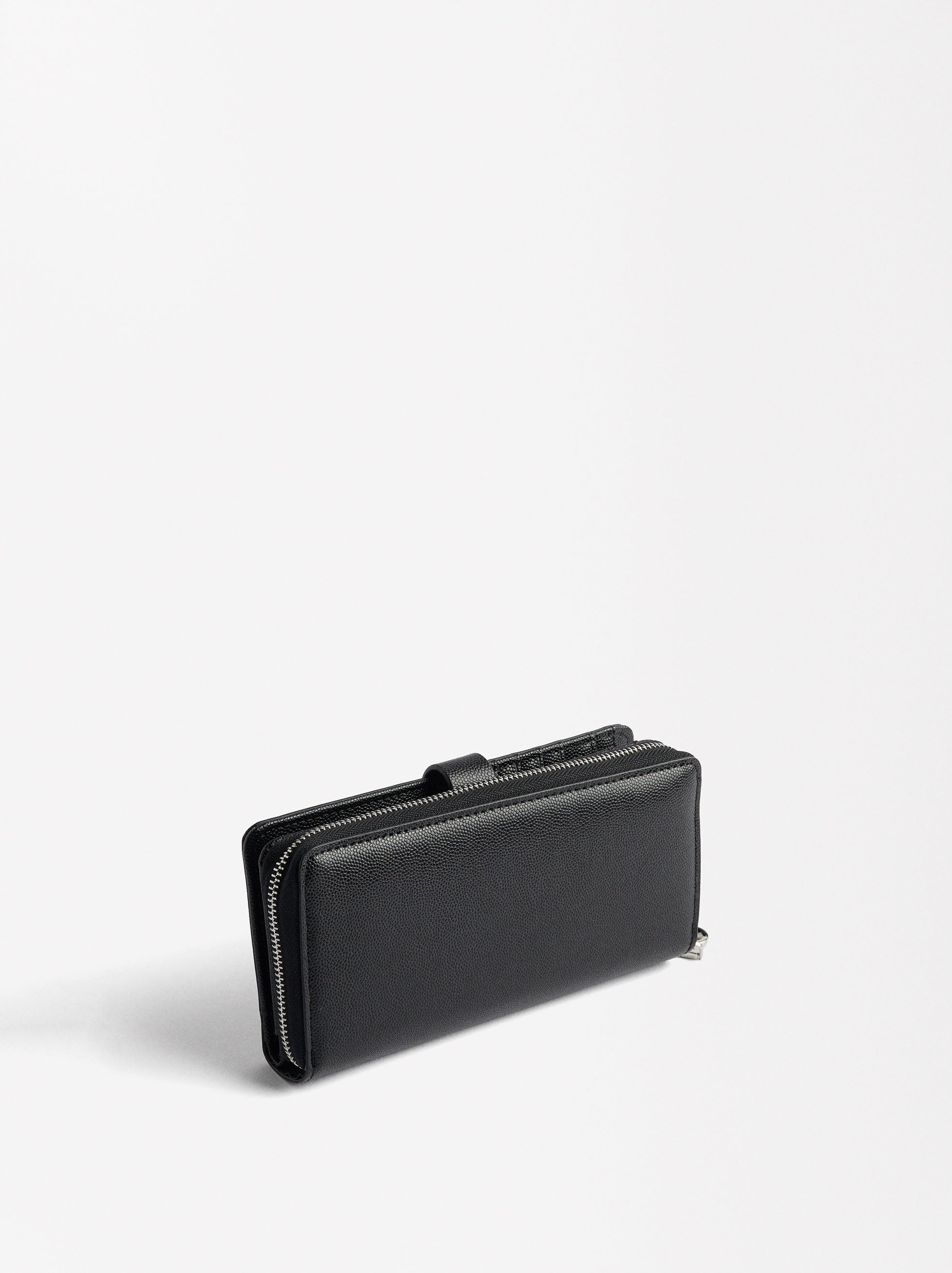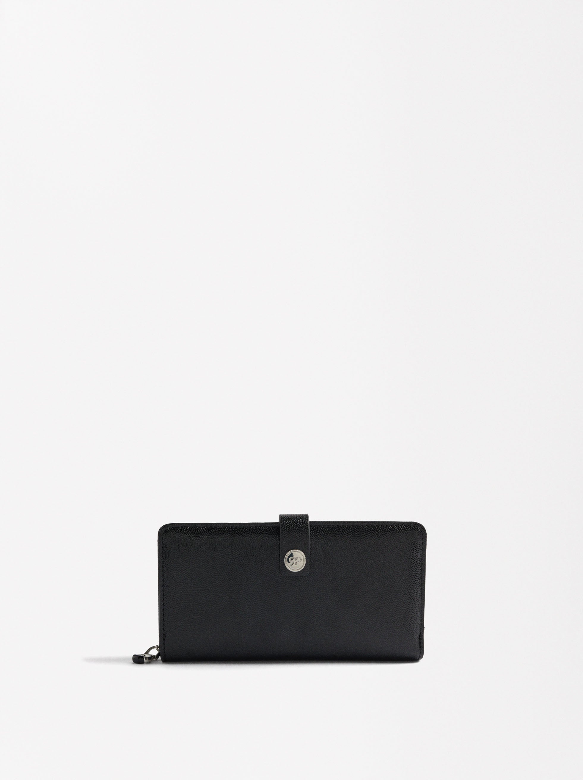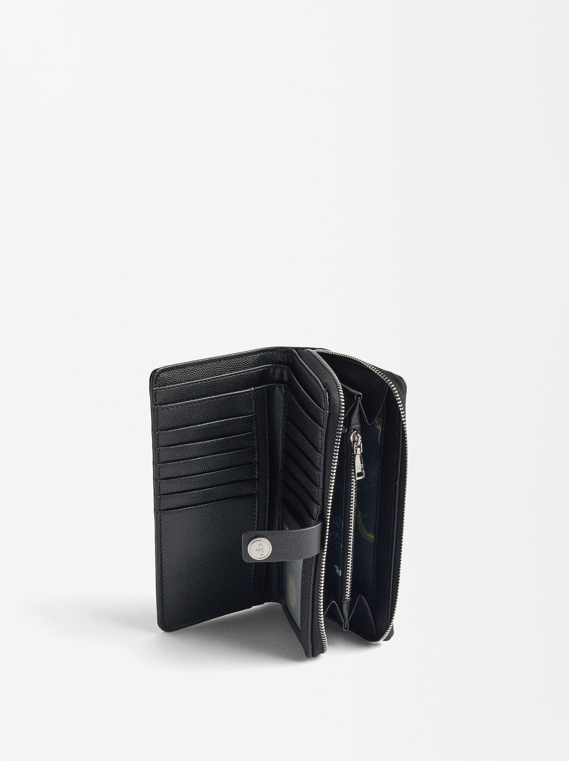 Cartera grande con textura. Compartimento para tarjetas y billetes con cierre de botón a presión. División con cierre de cremallera para monedas.