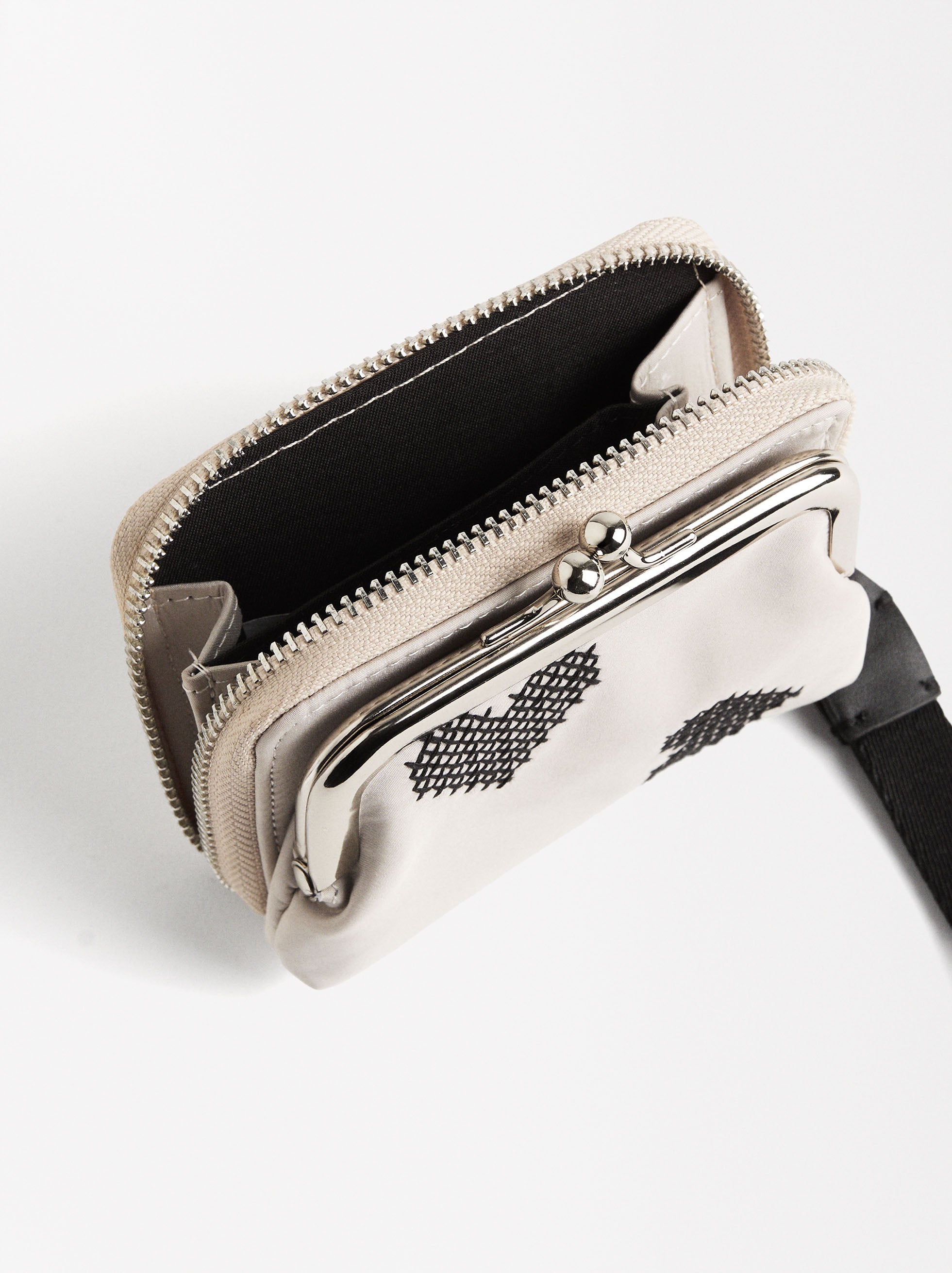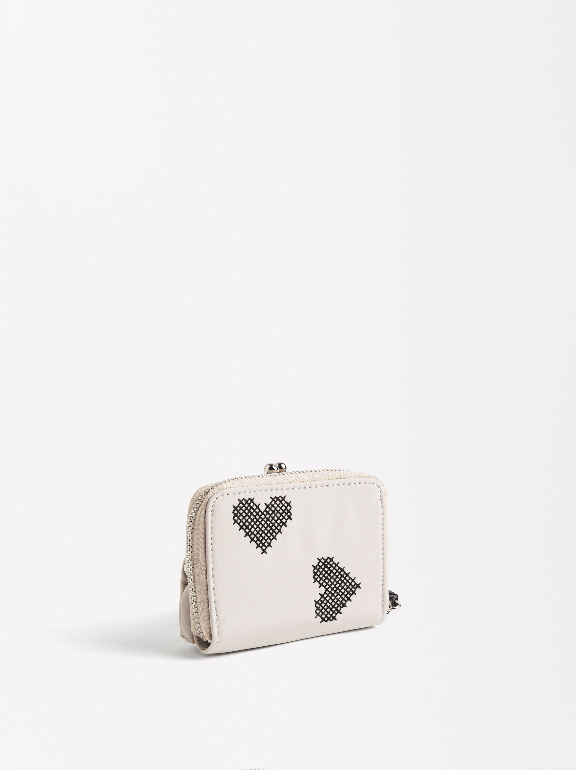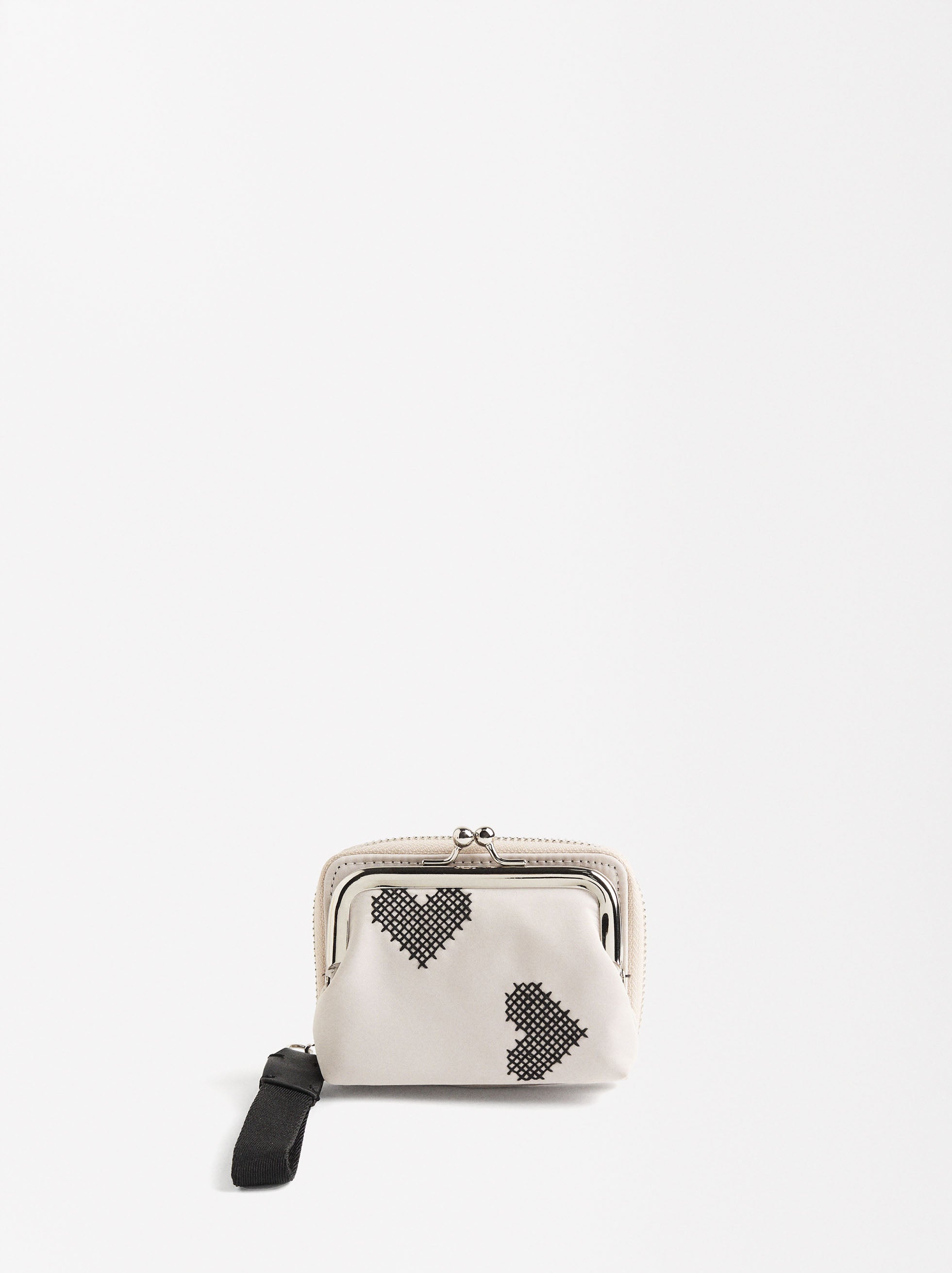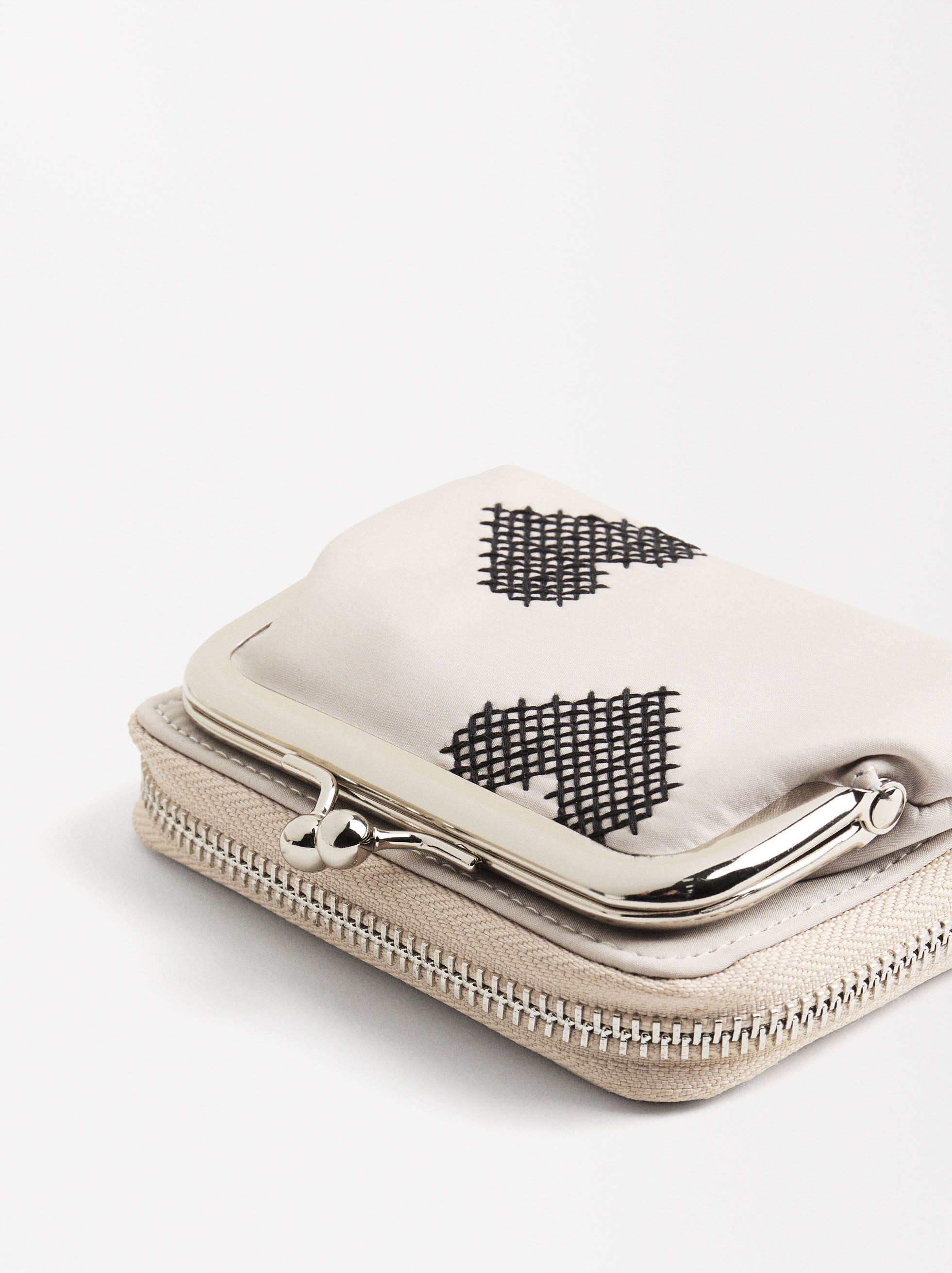 Cartera de nylon con bordado de corazones. Dos compartimentos: uno con cremallera y otro con cierre de boquilla.