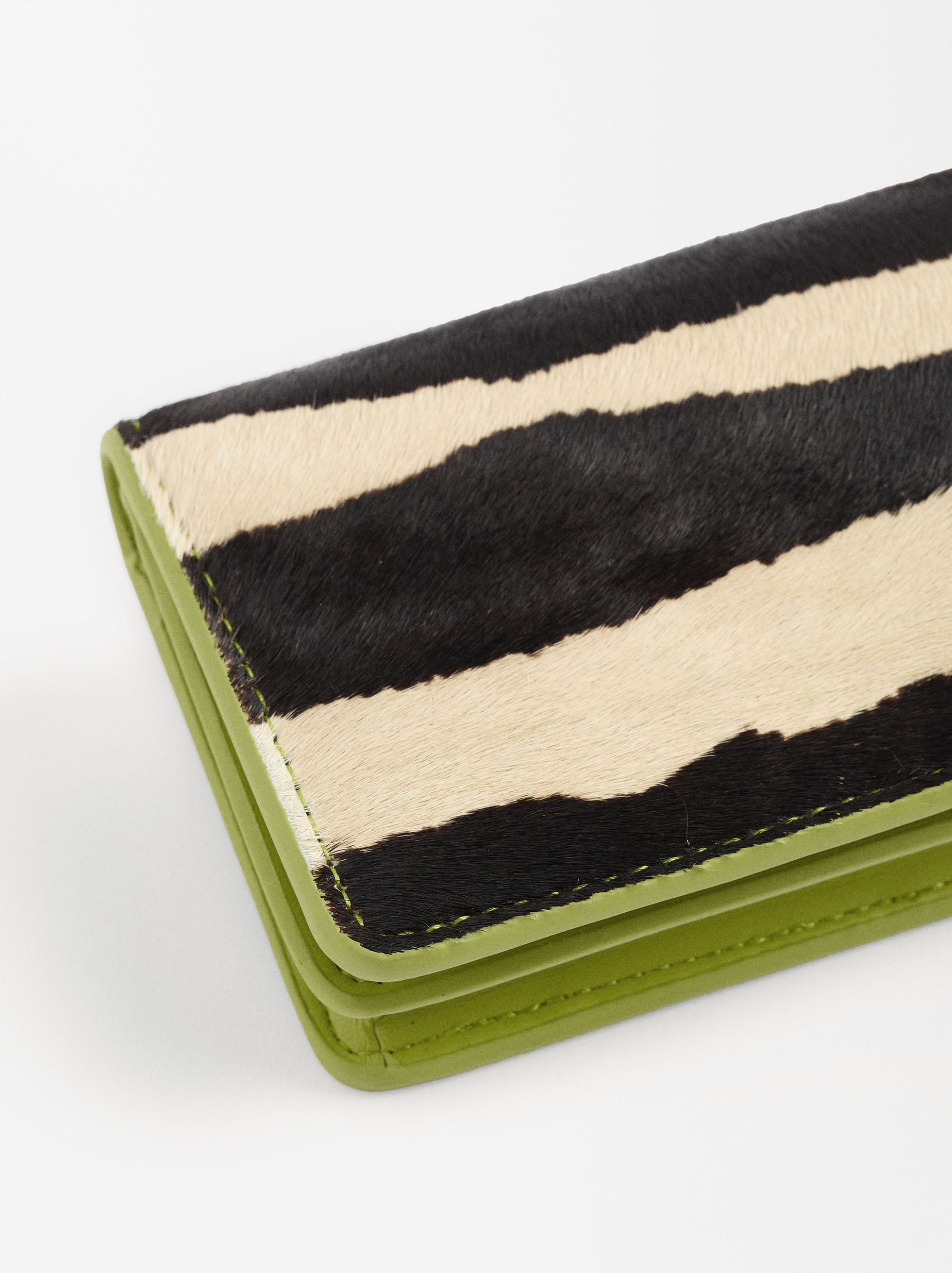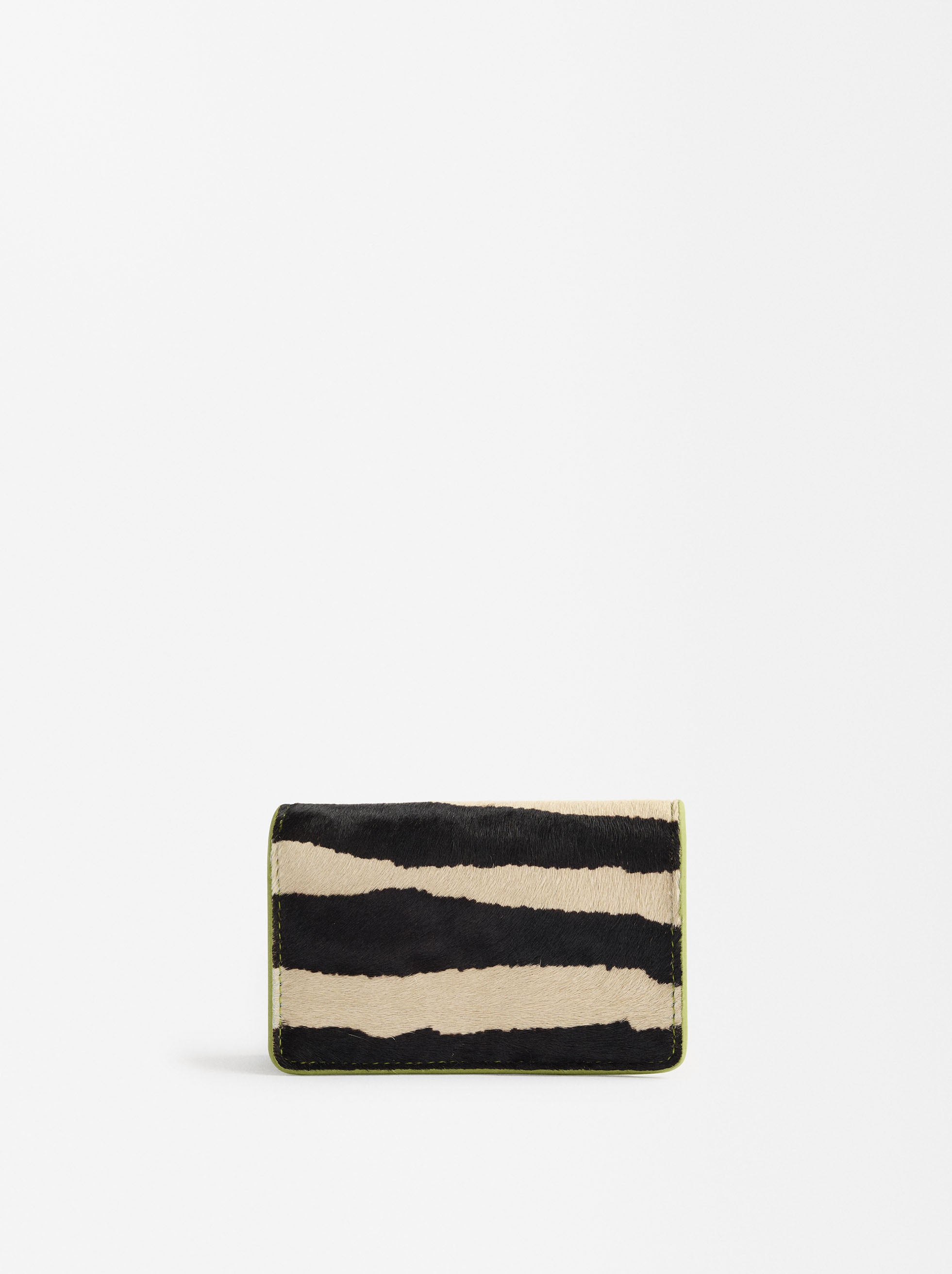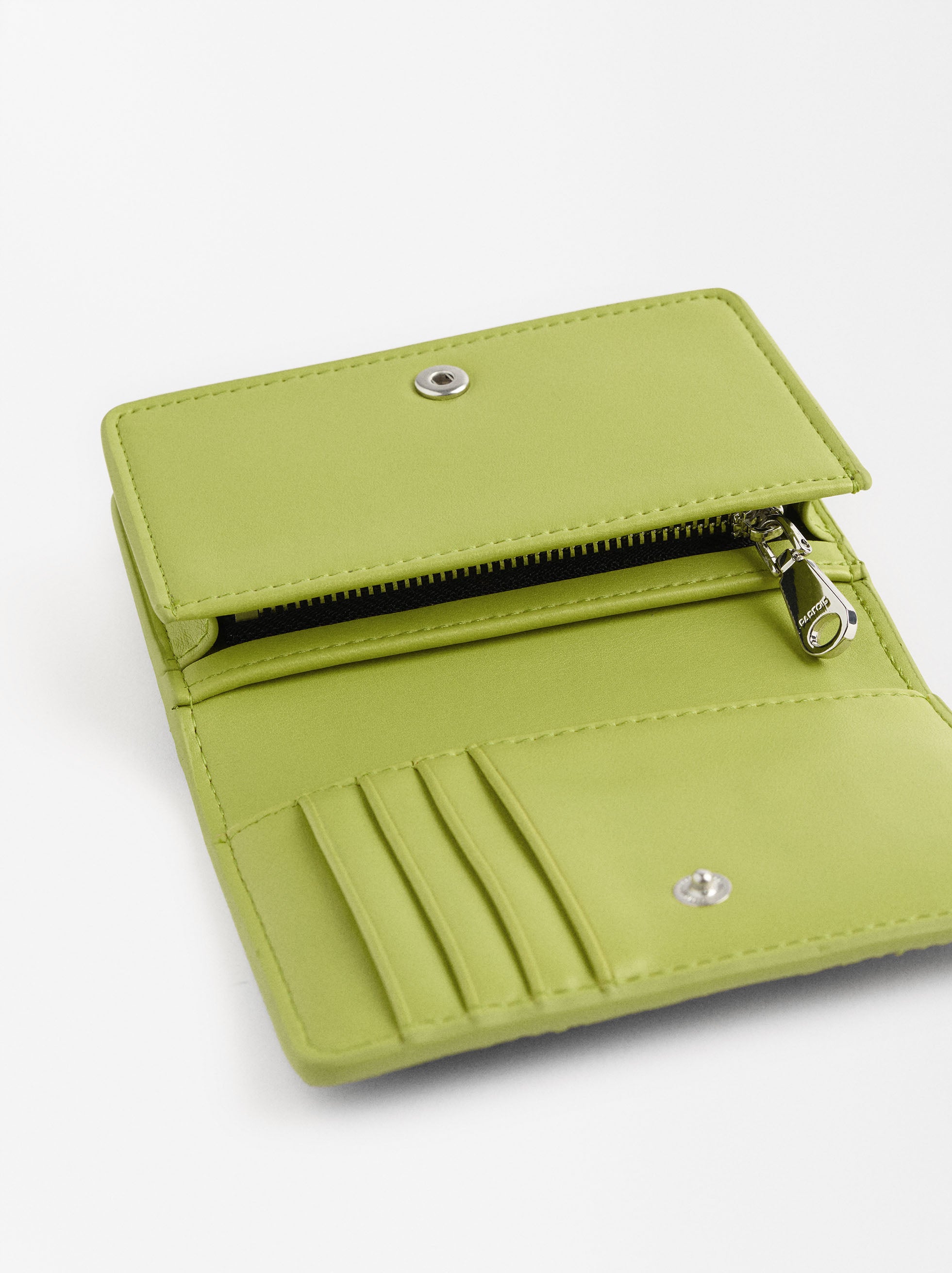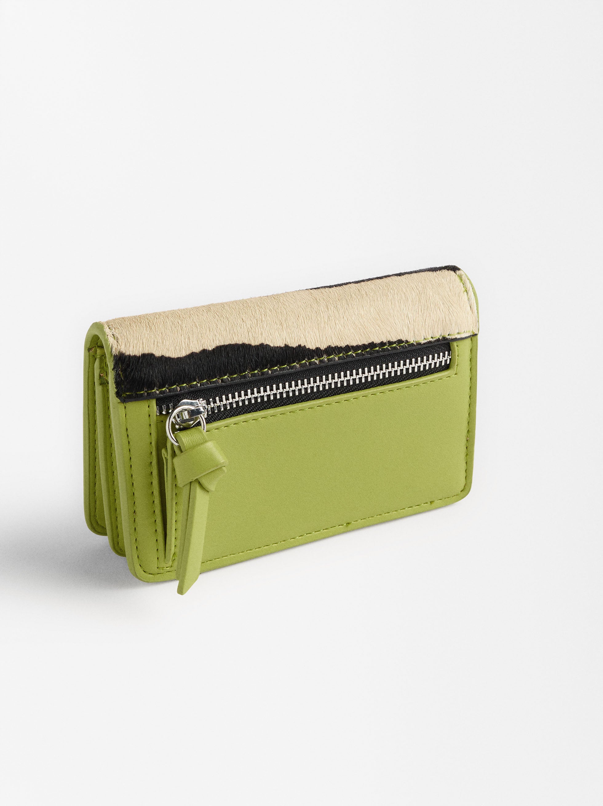 Cartera de piel. Ranuras para tarjetas y billetes. Bolsillo con cierre de cremallera para monedas. Cierre con botón a presión.