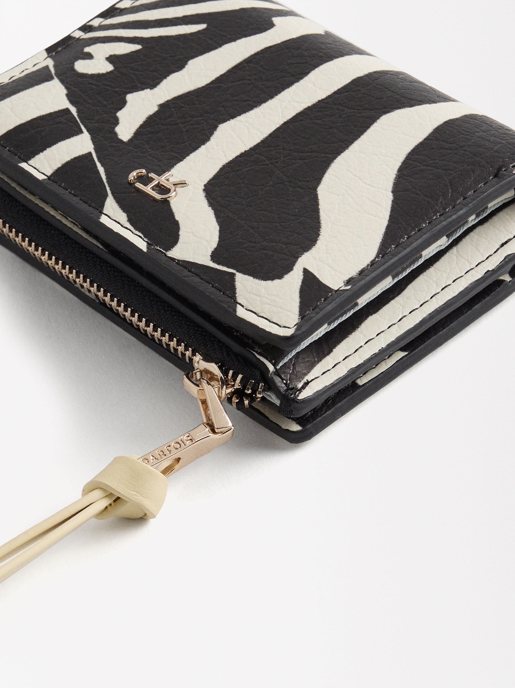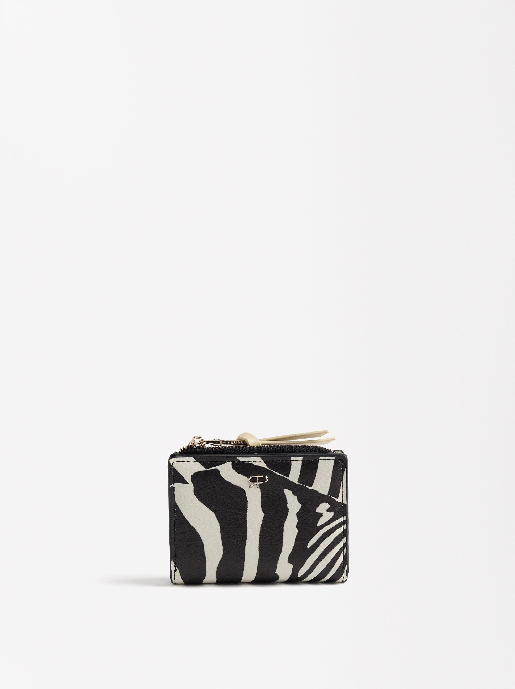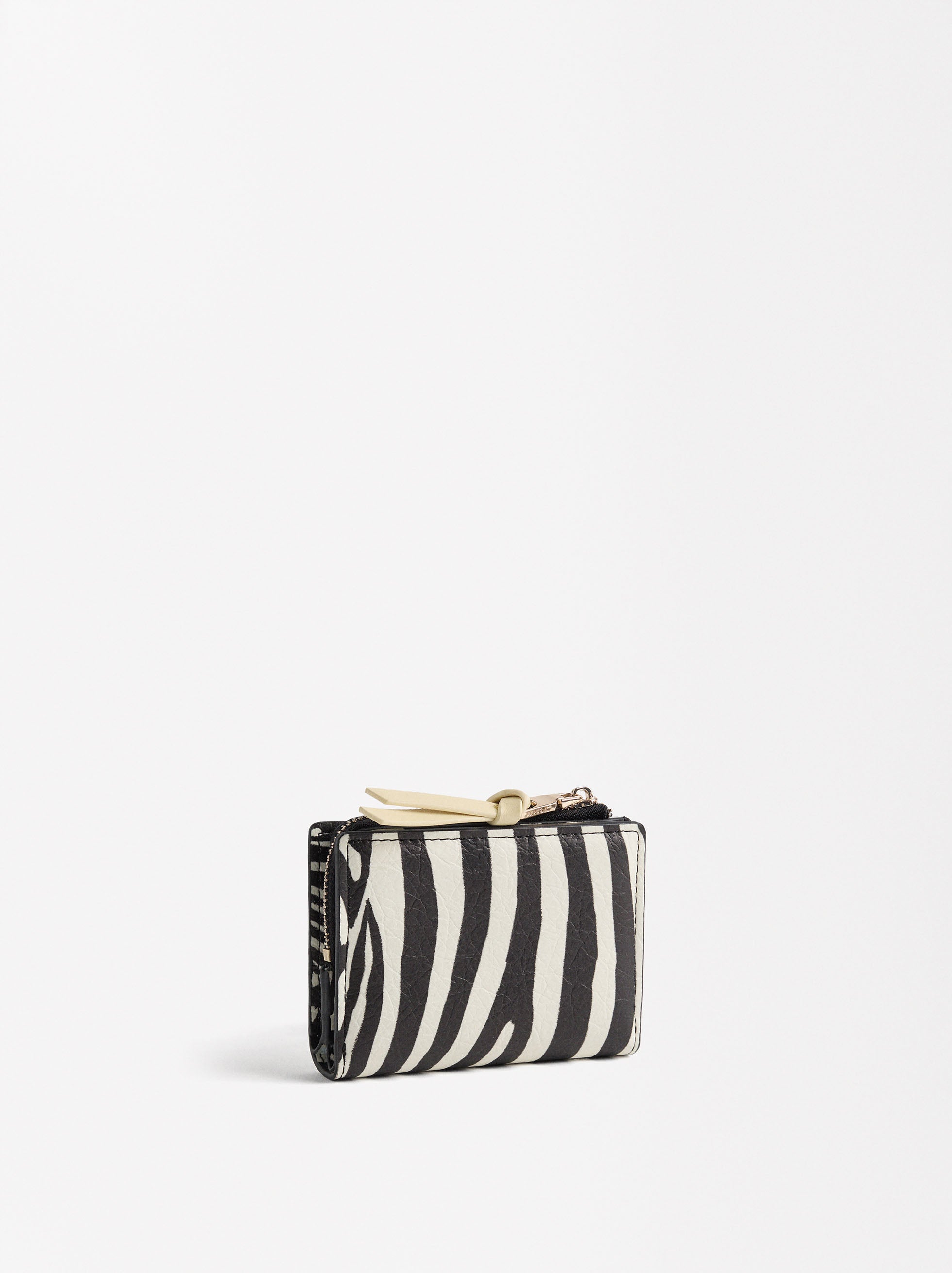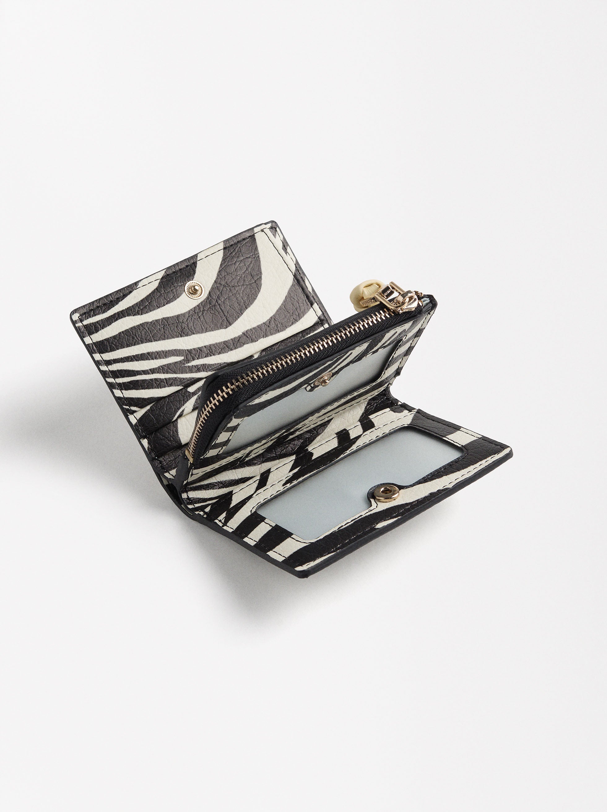 Cartera con estampado animal y textura. Tamaño pequeño. Ranuras para tarjetas y billetes. Cierre con botón de presión. Compartimento central con cremallera para monedas.
