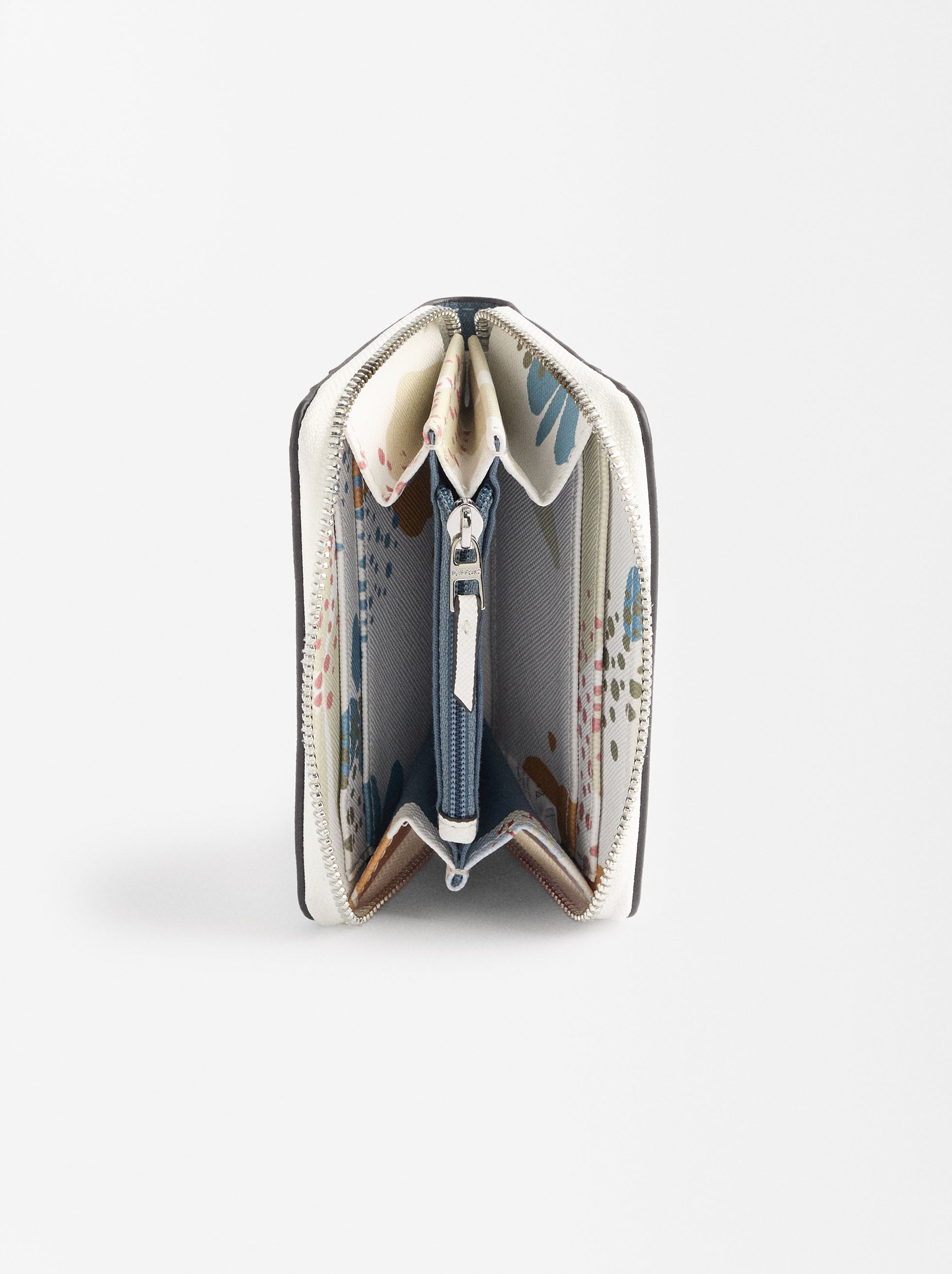 Cartera pequeña con estampado floral y textura. Ranuras para tarjetas y billetes. Compartimento para monedas con cierre de cremallera. Cierre principal con cremallera.