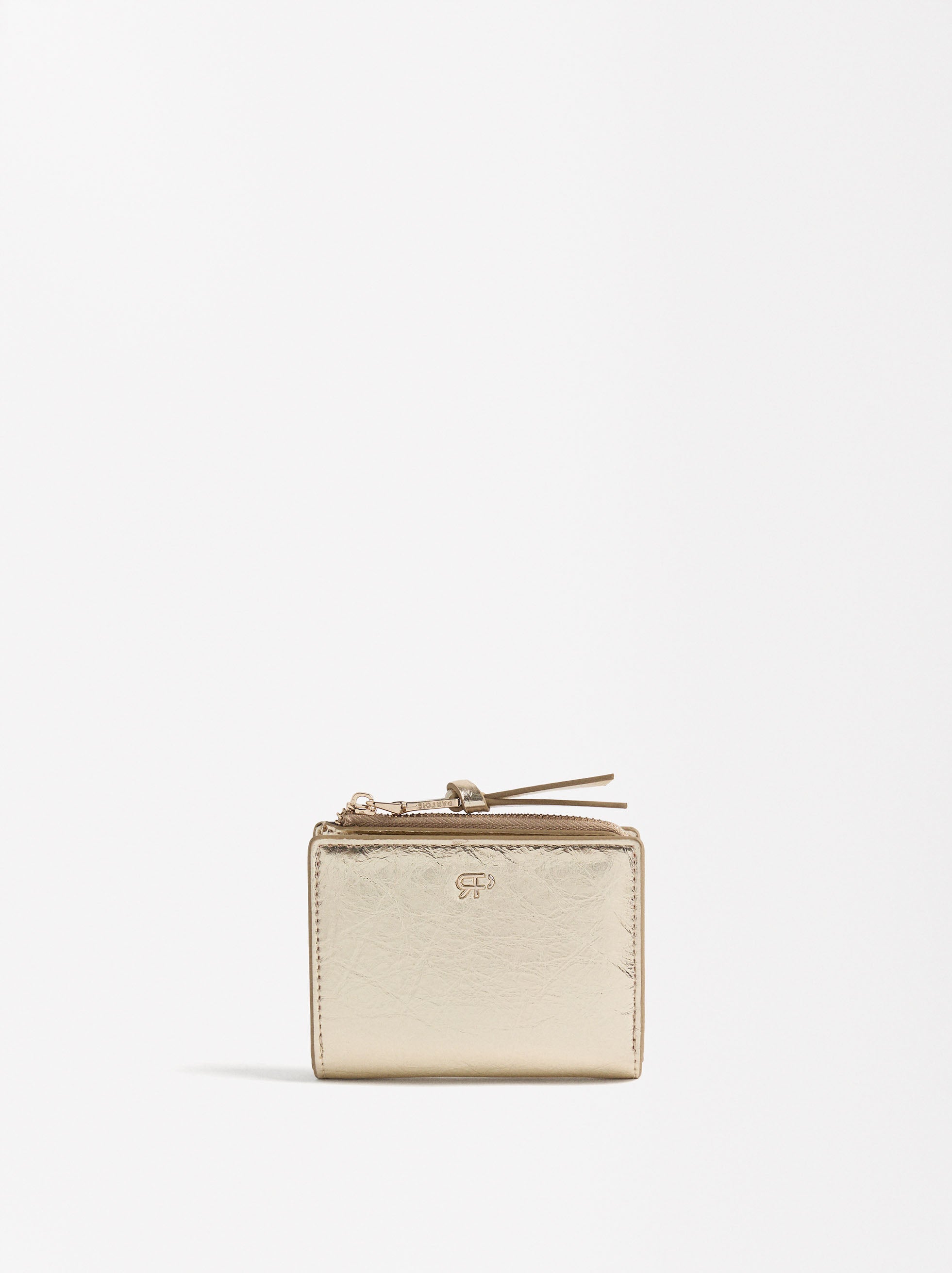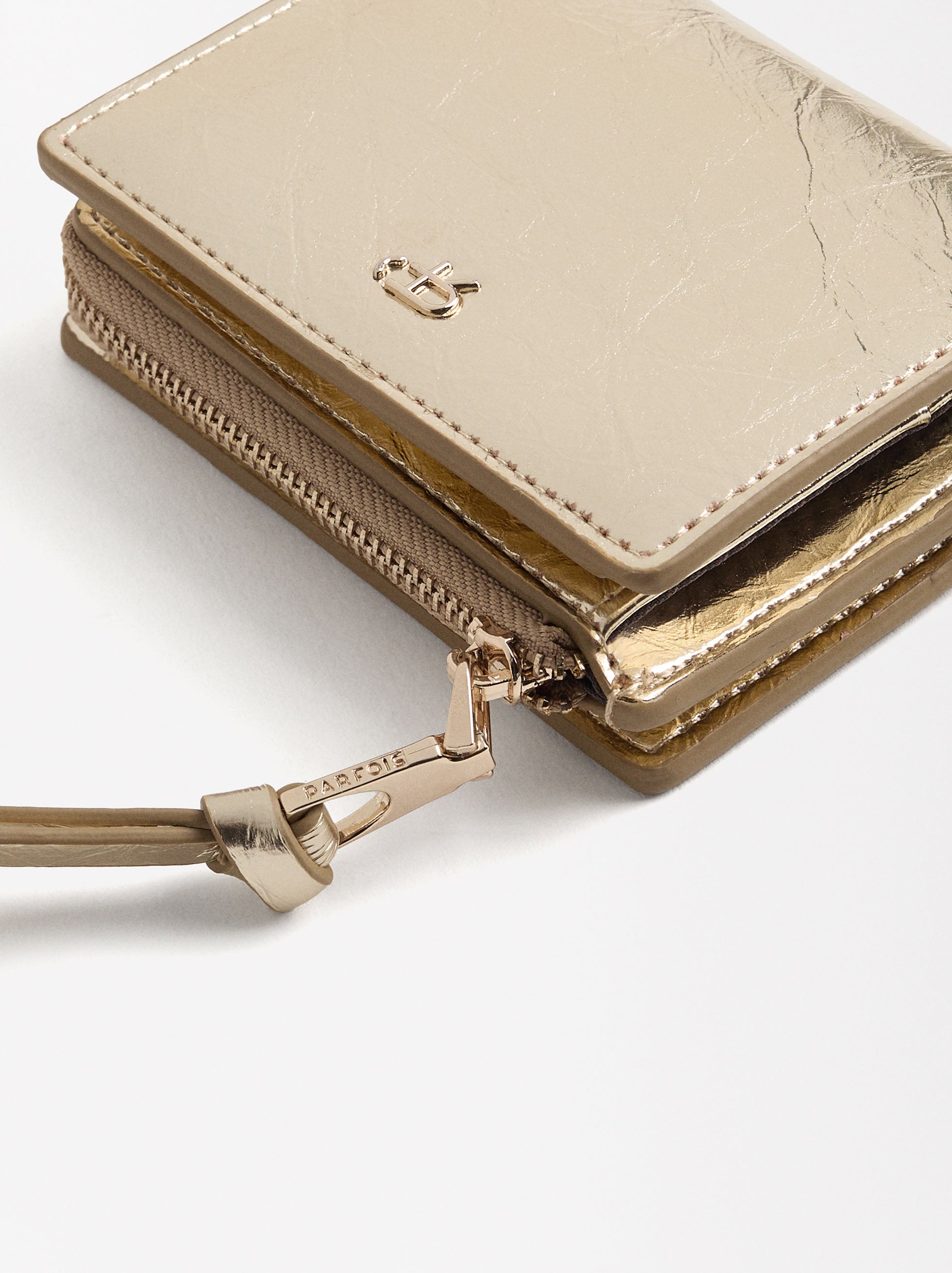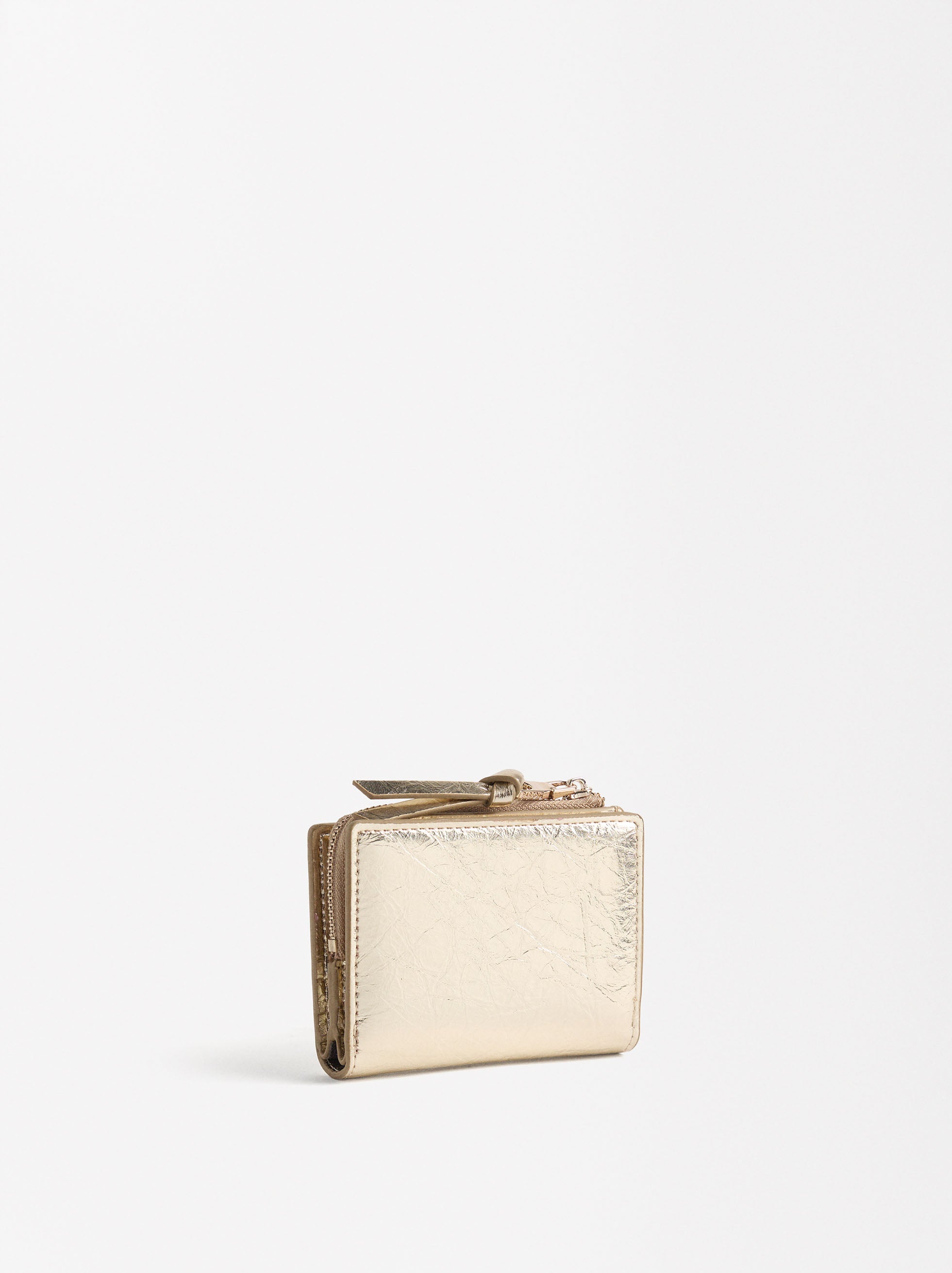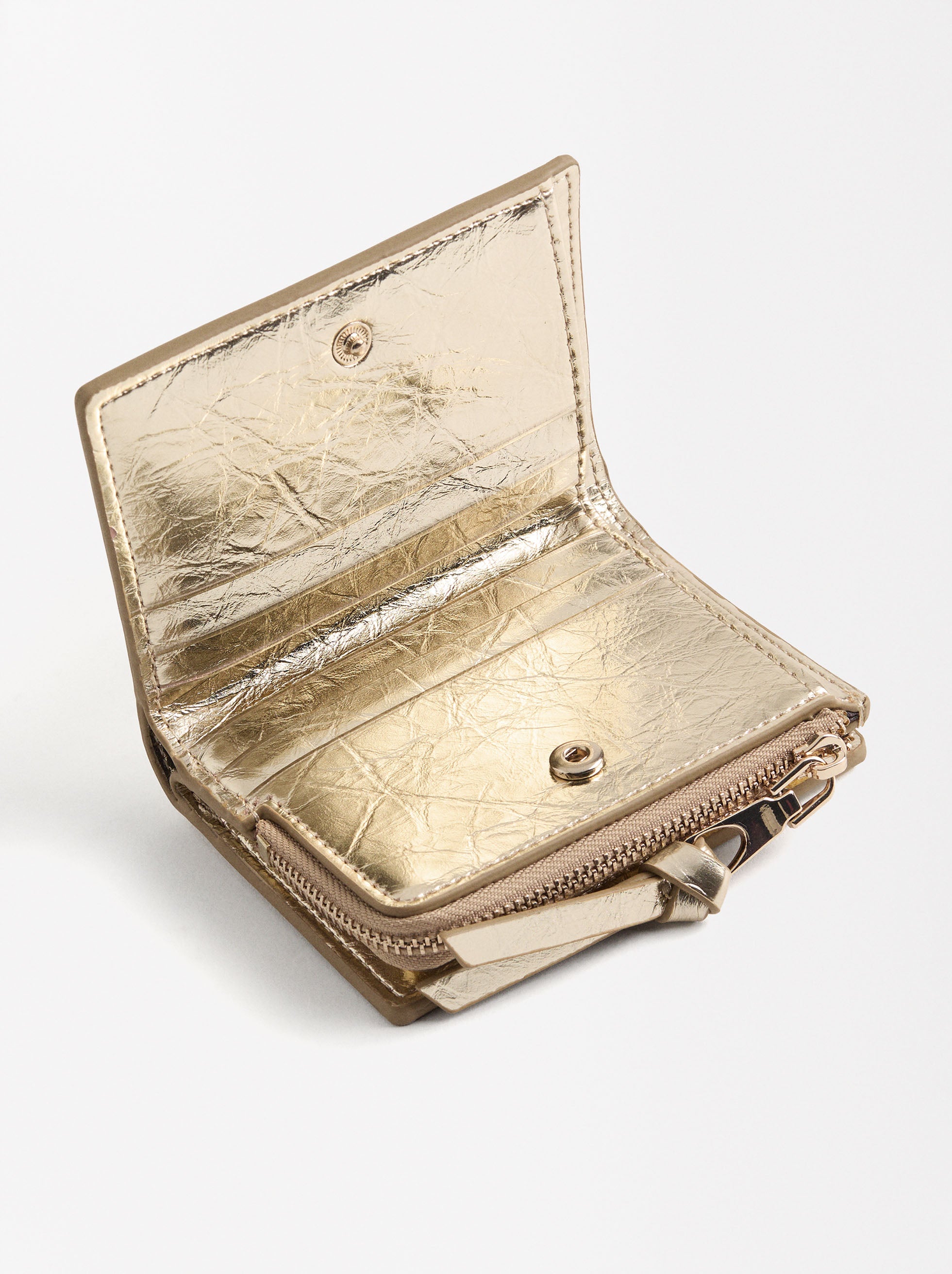 Cartera metalizada de tamaño mediano. Efecto craquelado. Ranuras para tarjetas y billetes. Cierre con botón de presión. Compartimento con cremallera para monedas.