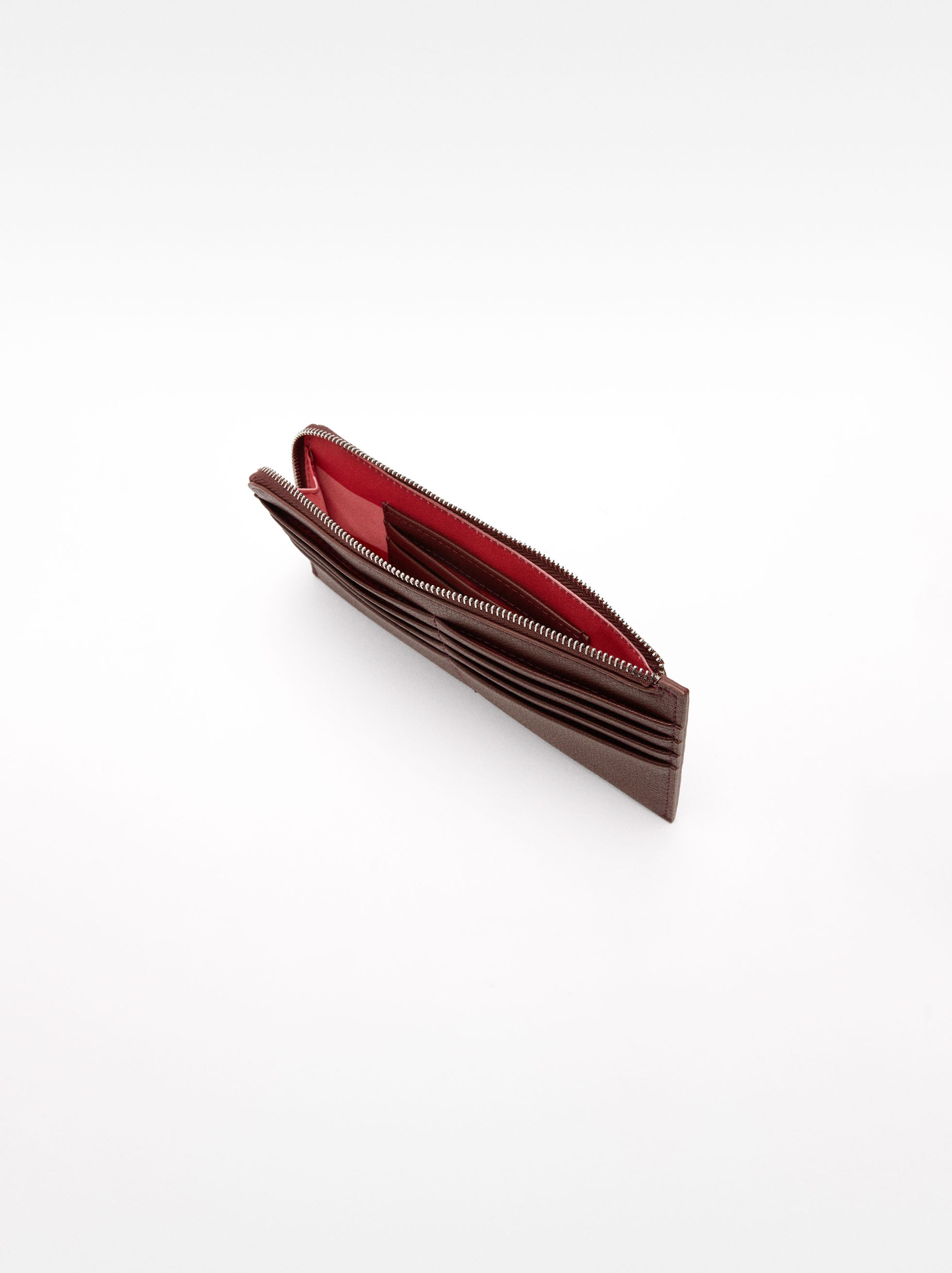 Bolsa multiusos rectangular con textura y flor estampada. Forro interior en color contrastante con ranuras para tarjetas. Cierre de cremallera. Ranuras exteriores para tarjetas.