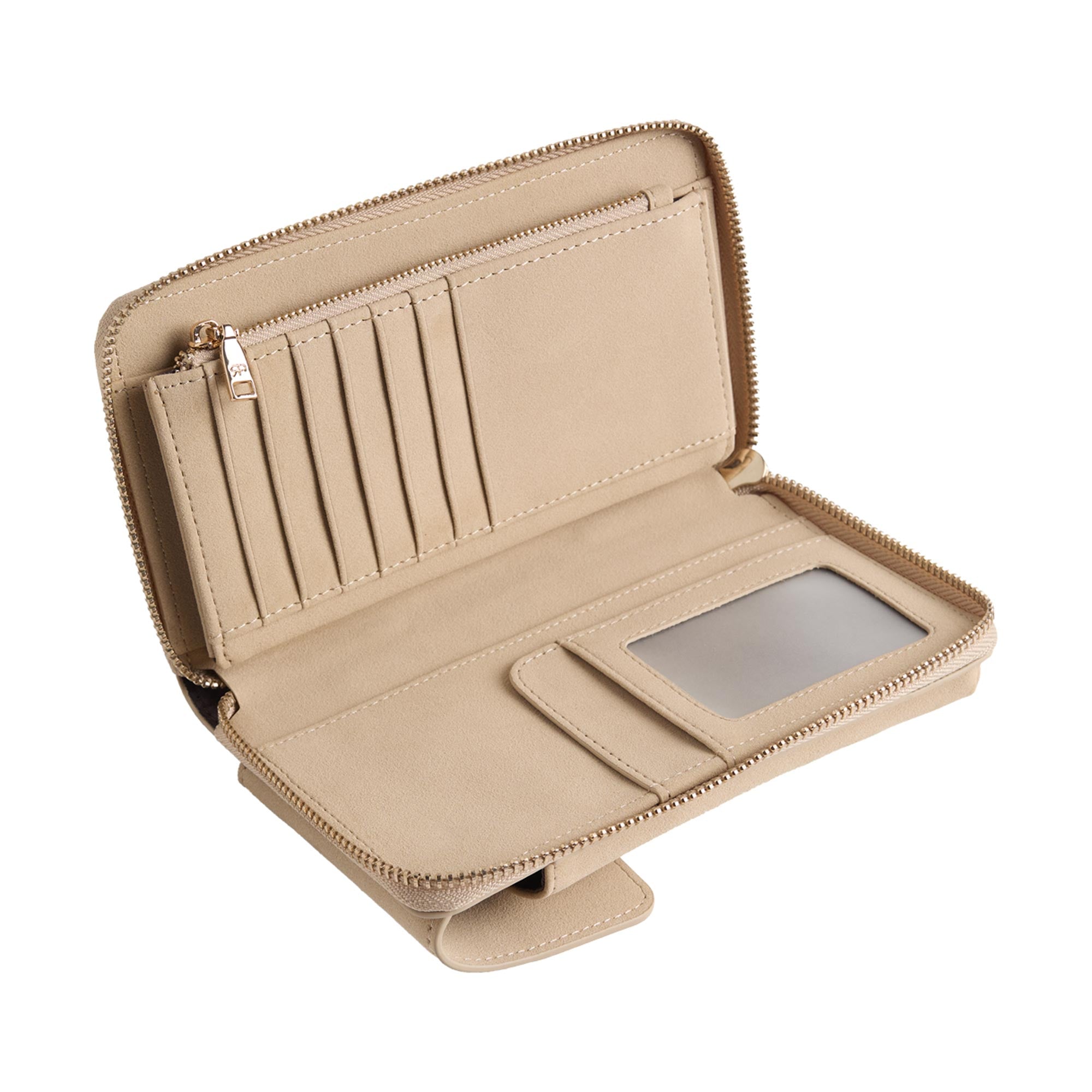 Bolsa para móvil con efecto piel. Compartimento con solapa imantada. División con cierre de cremallera con ranuras para tarjetas y billetes; compartimento interior con cierre de cremallera para monedas. Ranuras exteriores en la parte posterior. Asa ajusta