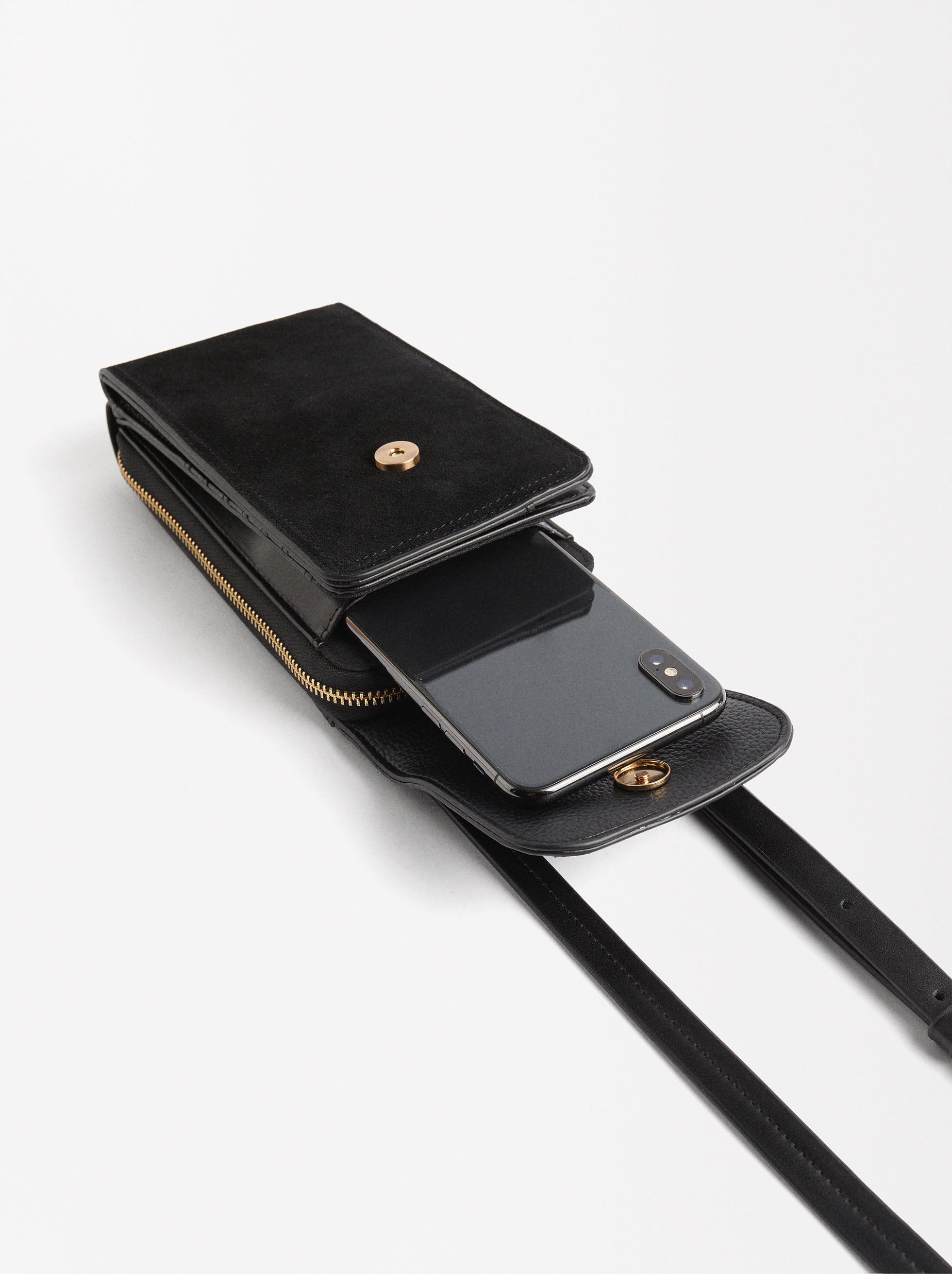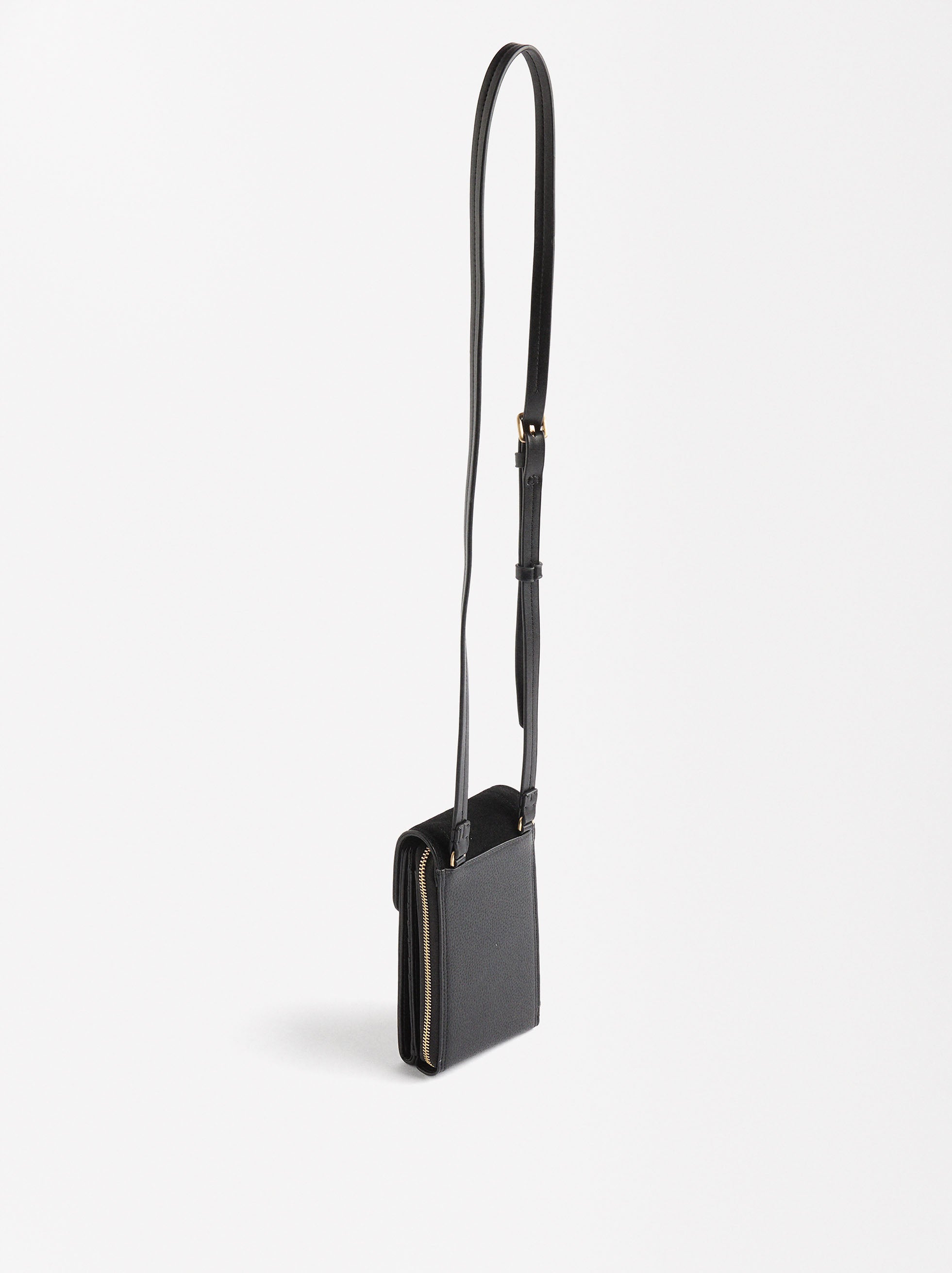 Bolso para móvil de piel con cierre de solapa imantado. Compartimento con ranuras para tarjetas. Asa bandolera fija y ajustable.