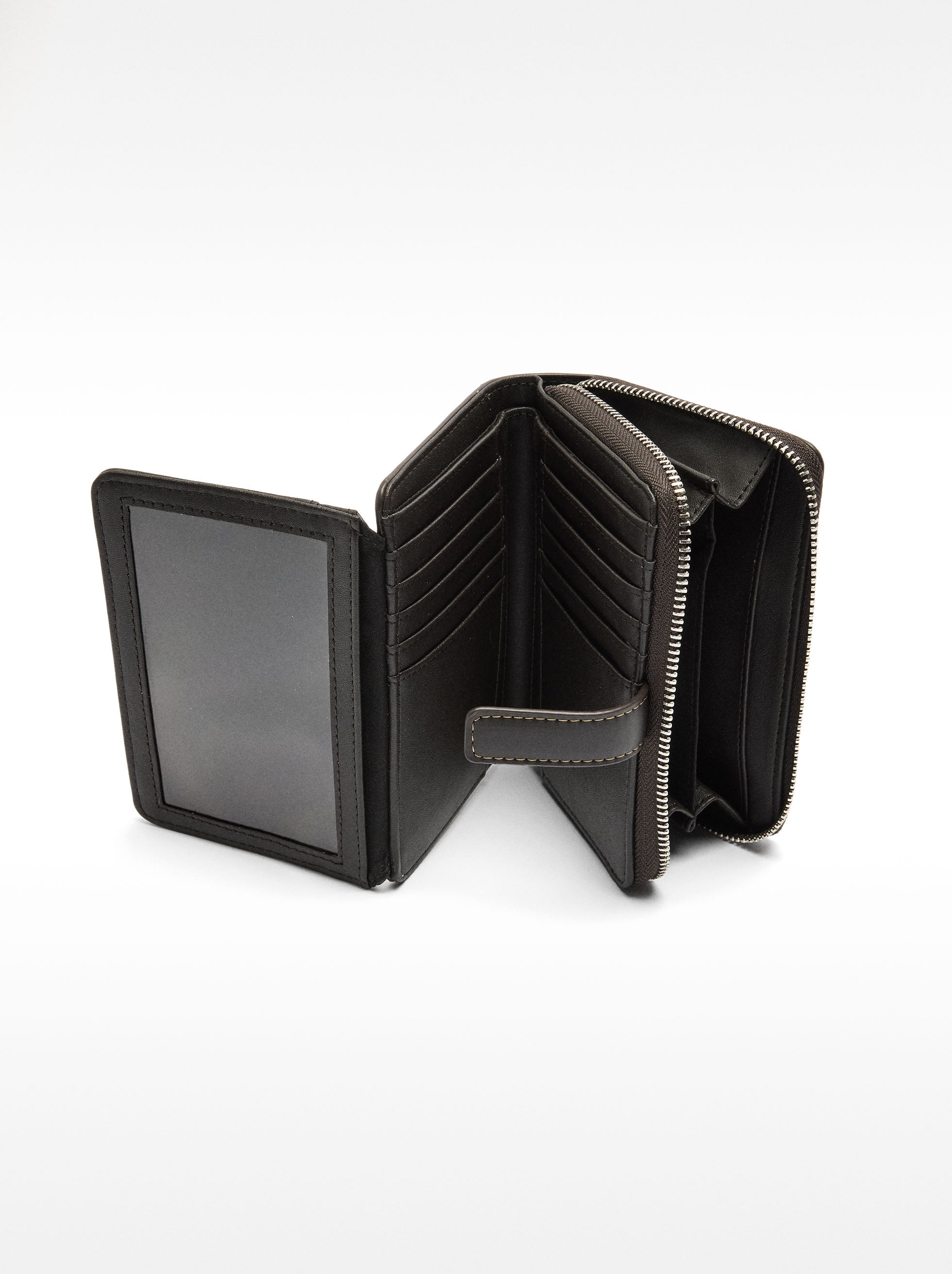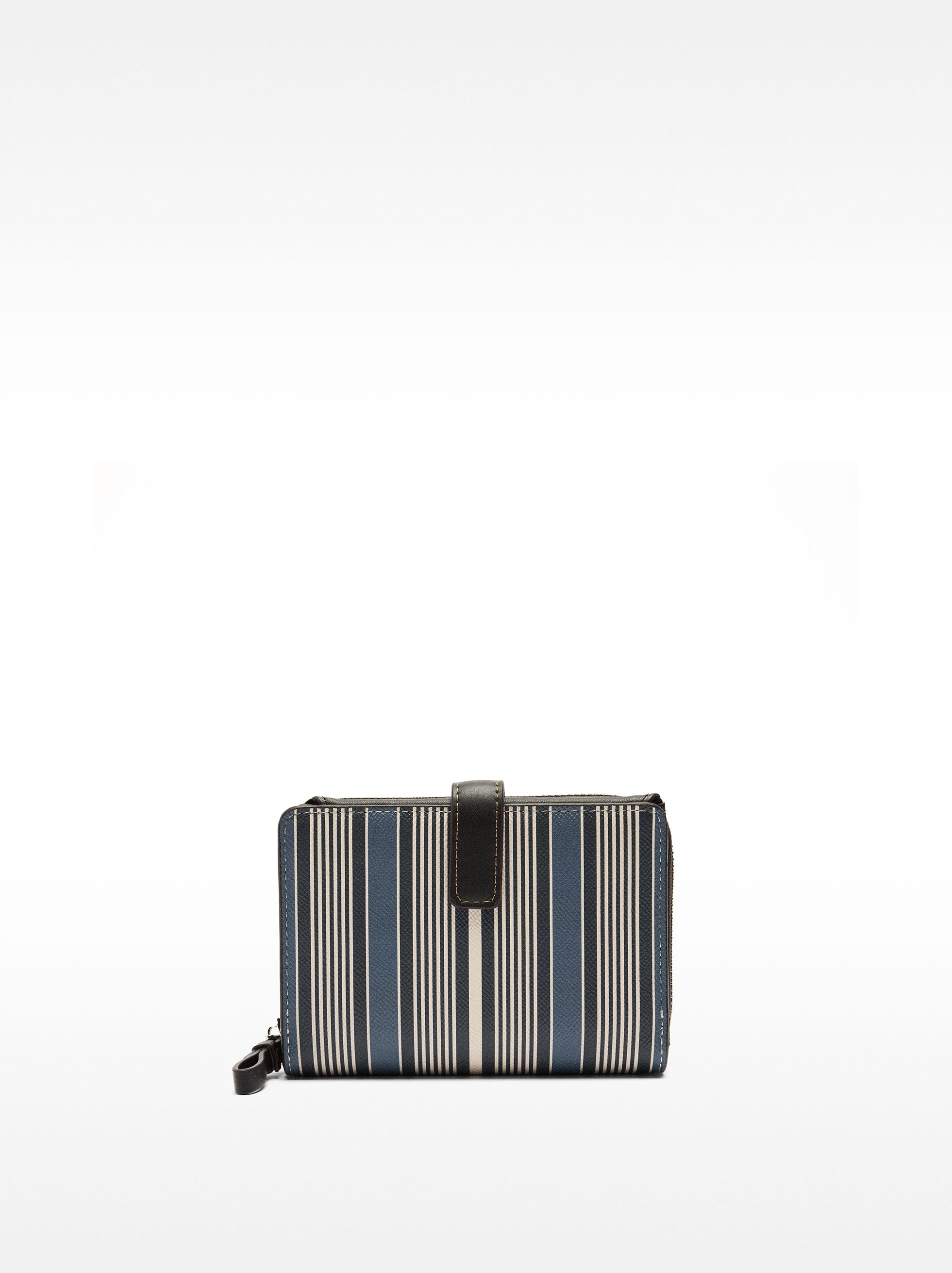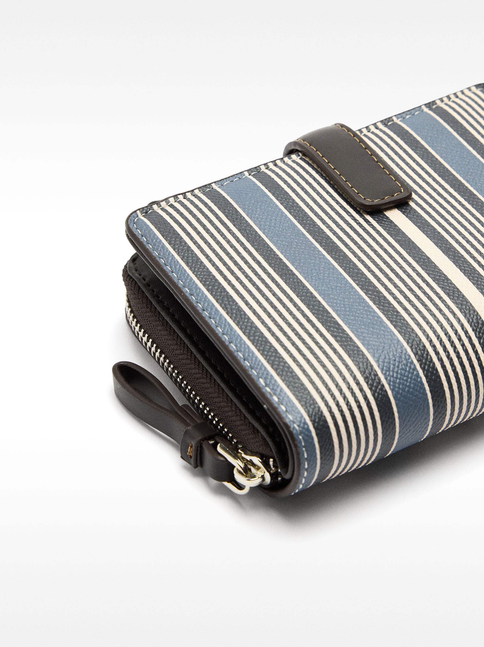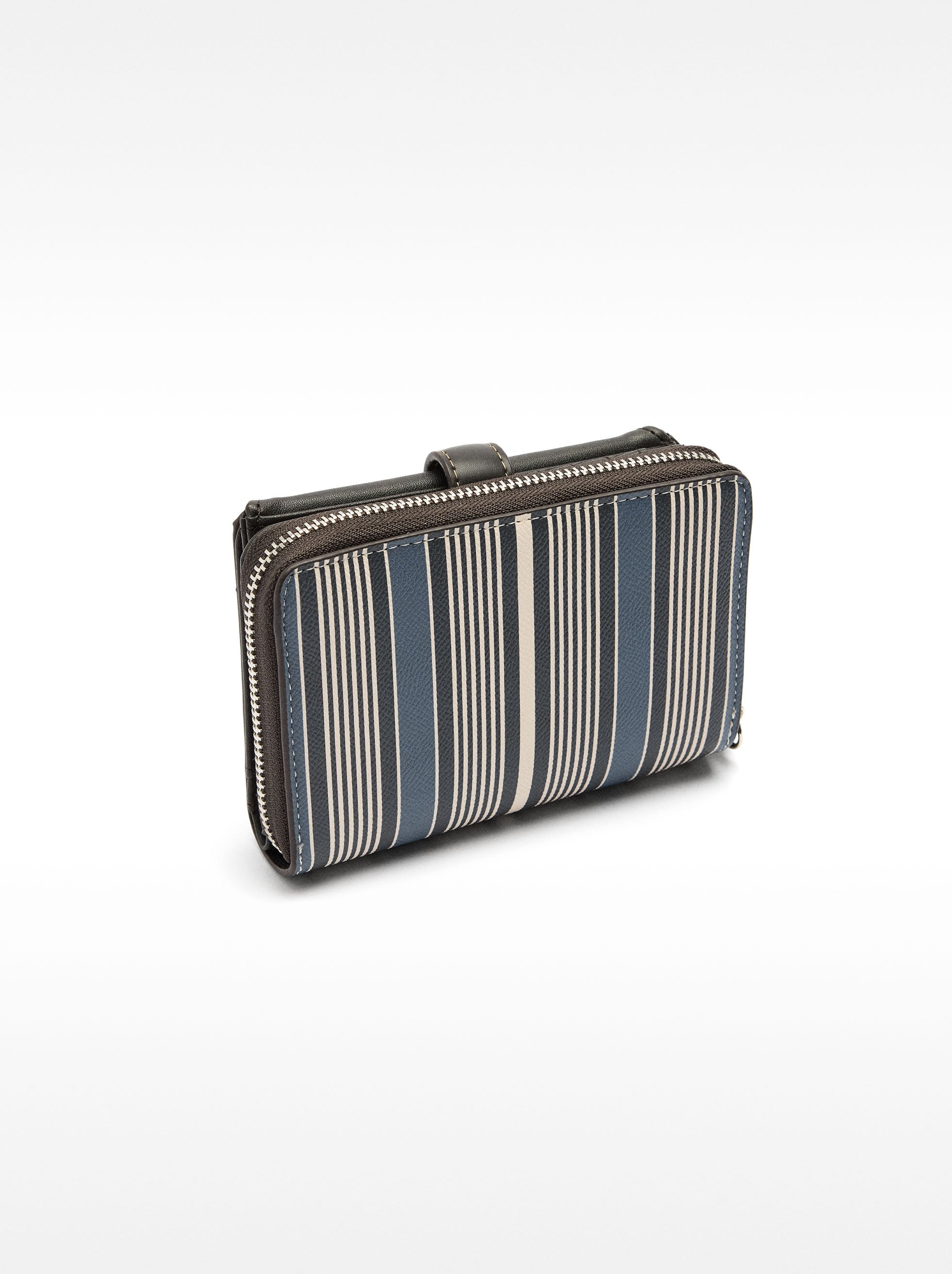 Cartera a rayas con textura. Tamaño mediano. Compartimento con ranuras para tarjetas y cierre con botón de presión. Compartimento para monedas con cierre de cremallera.