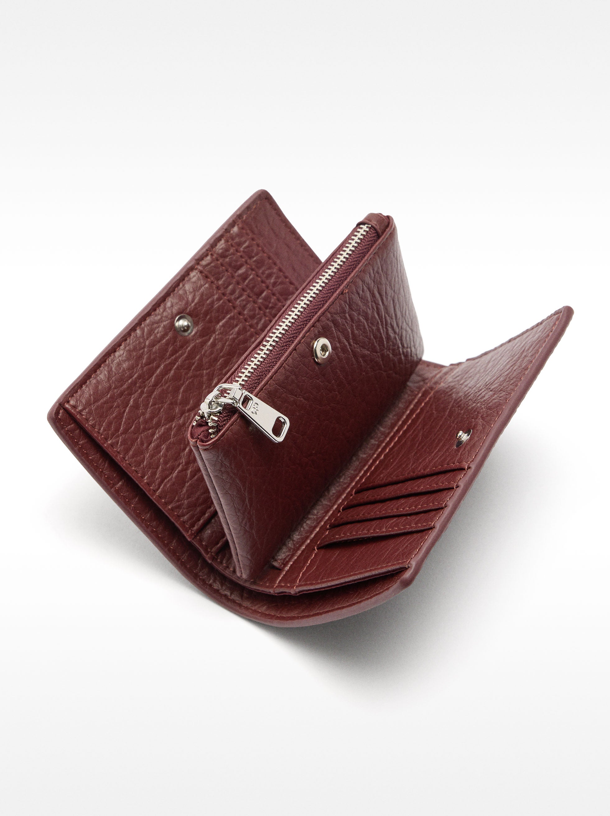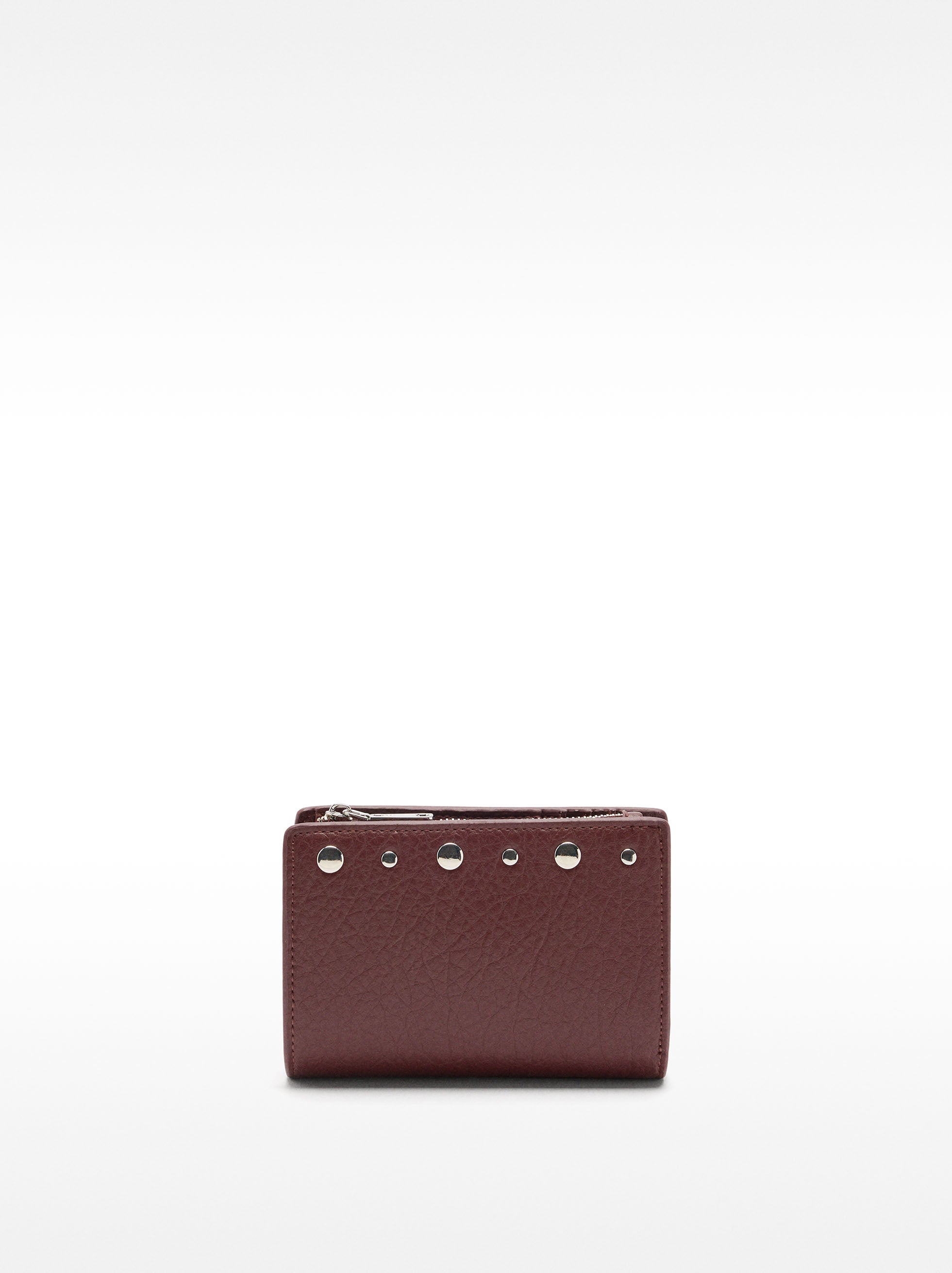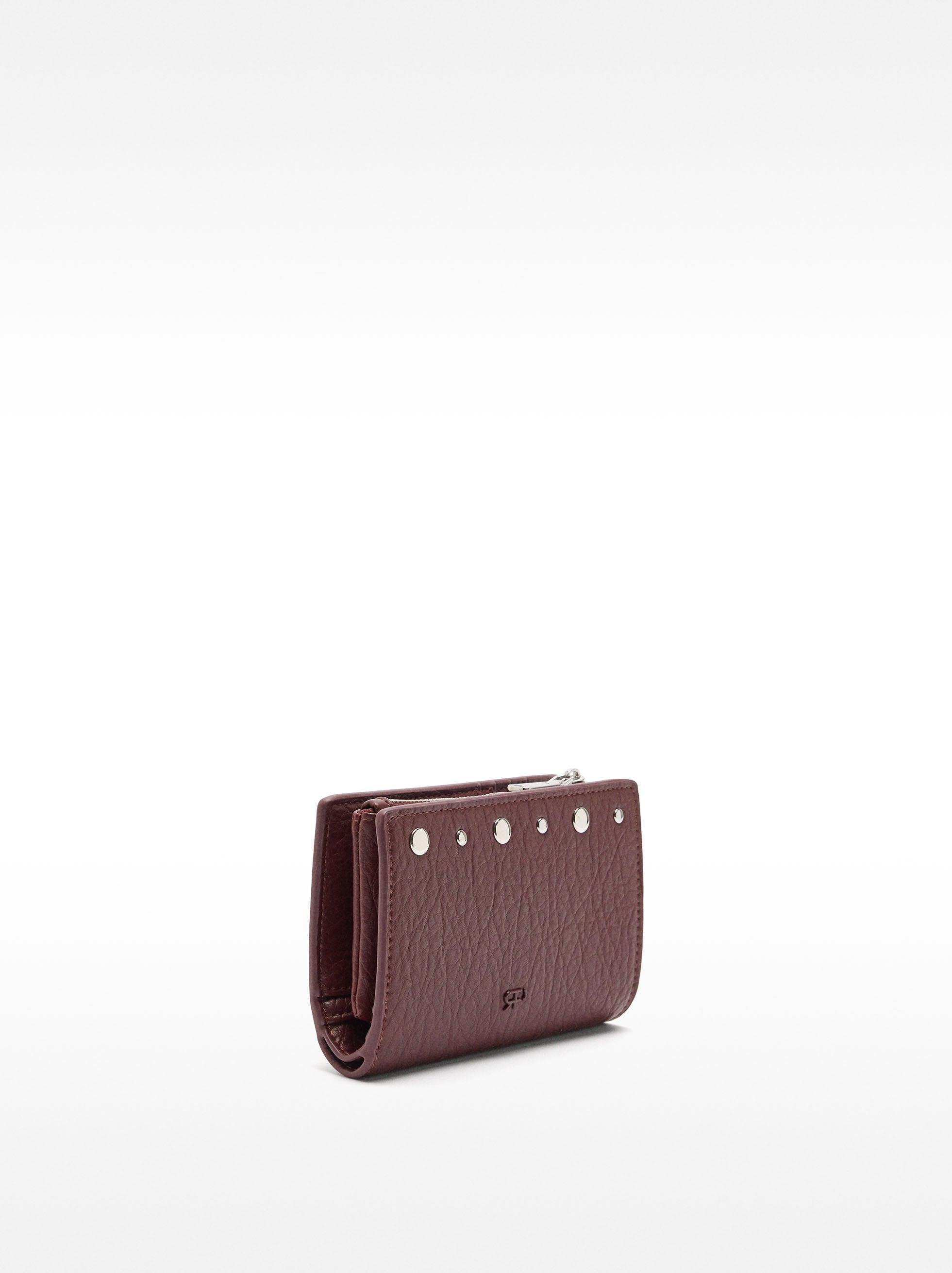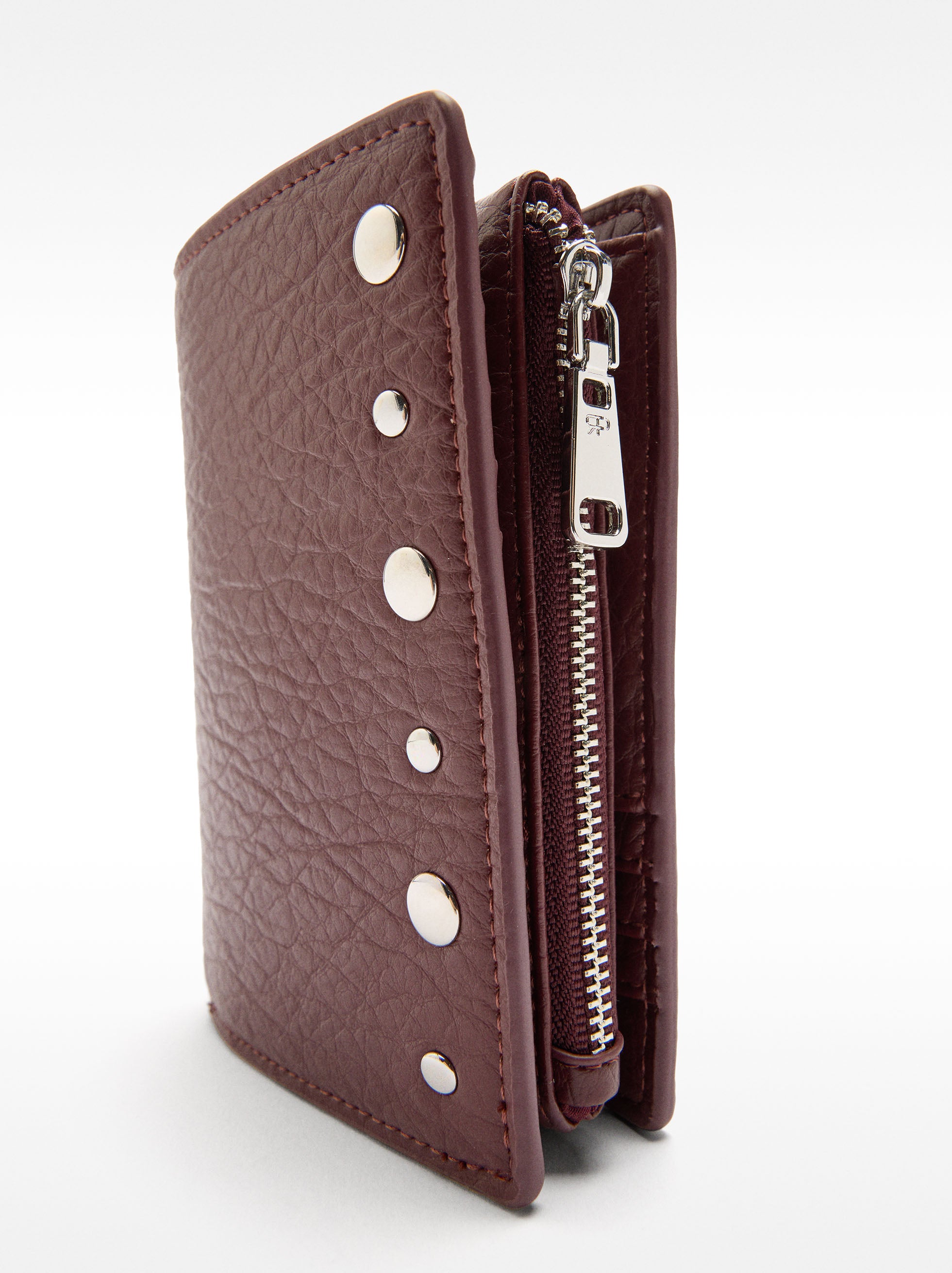 Cartera con textura. Tachuelas en un borde. Ranuras para tarjetas y billetes. Compartimento con cierre de cremallera para monedas. Cierre con botones a presión.