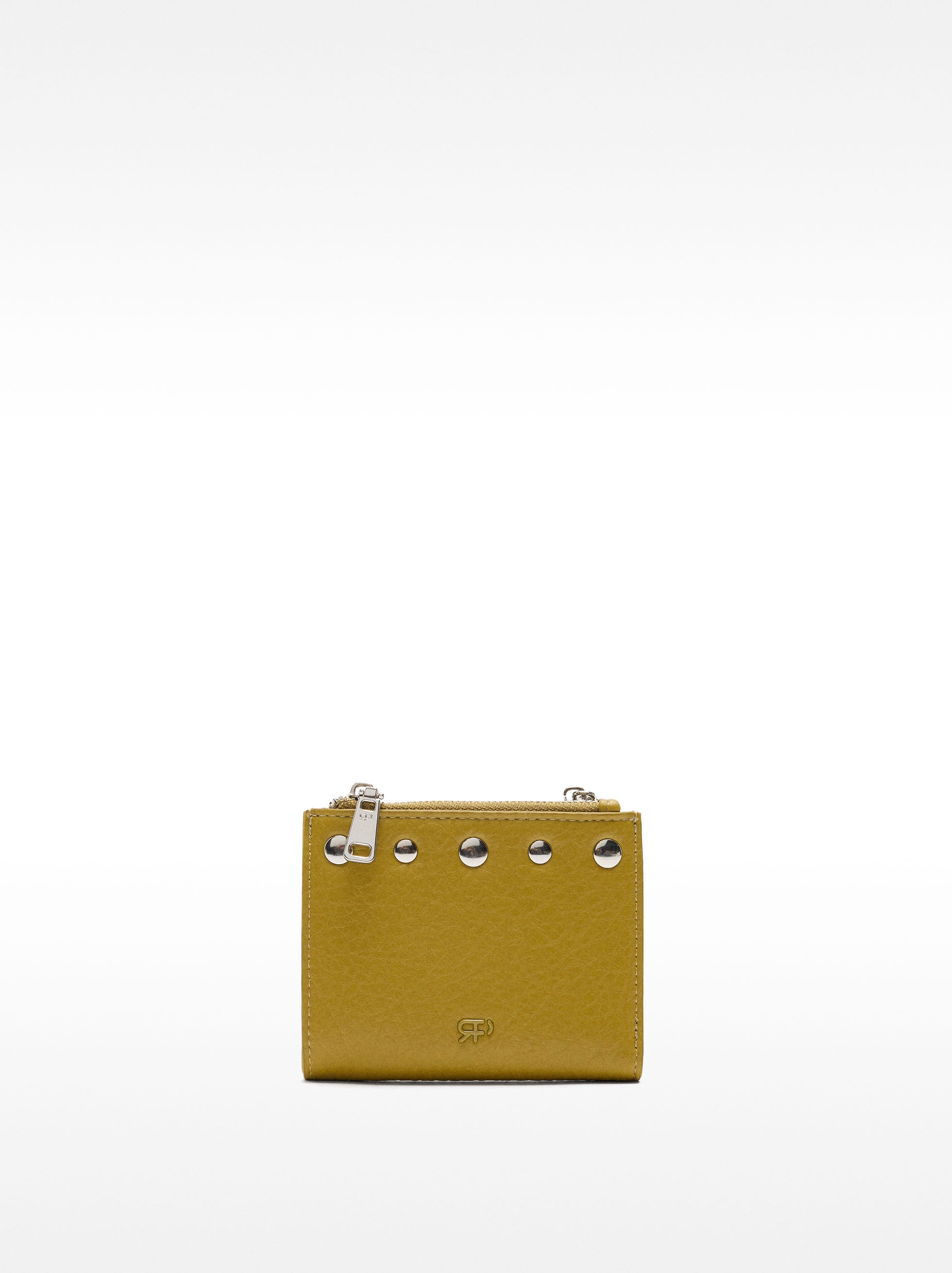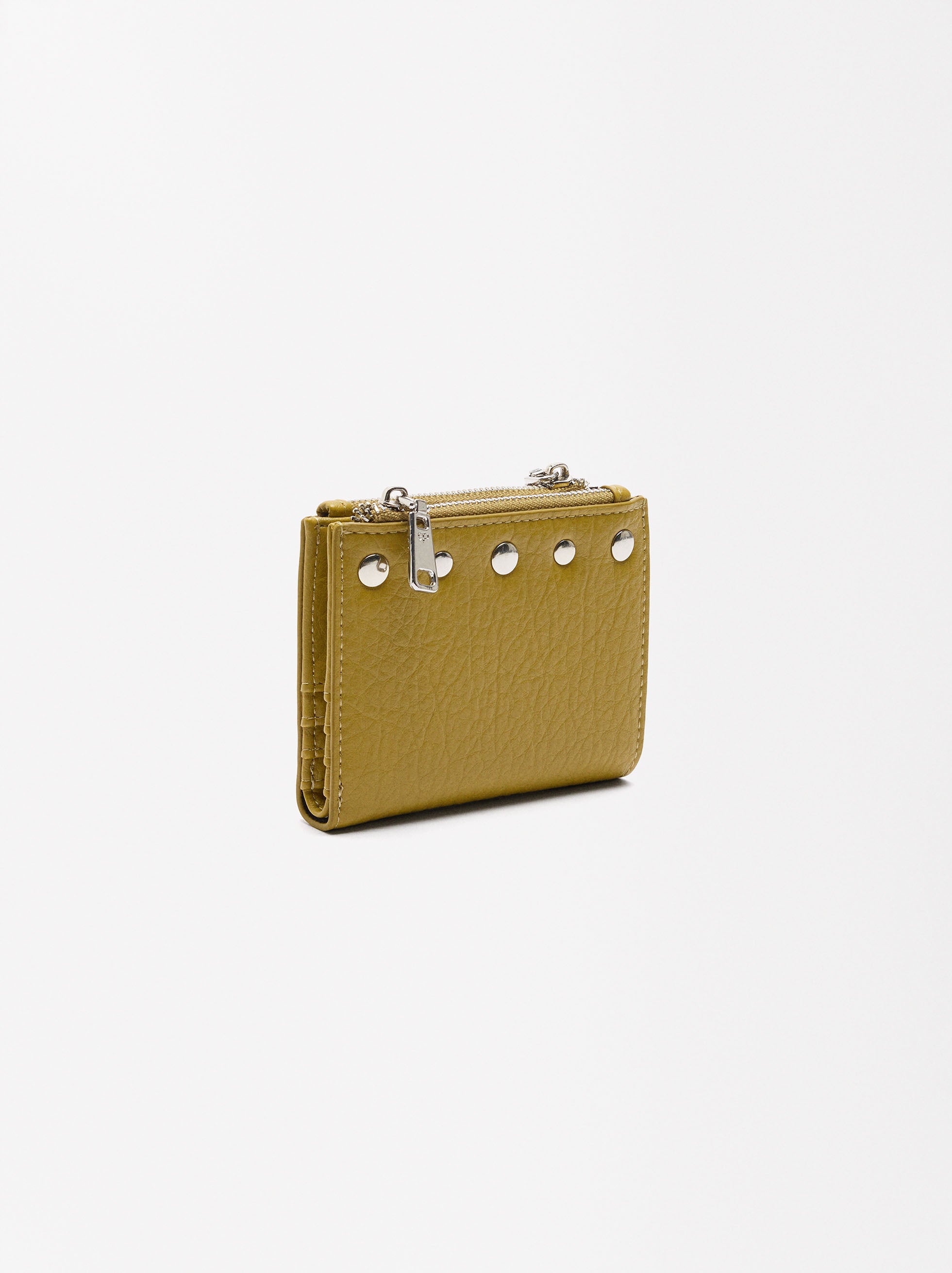 Cartera con textura. Tachuelas en un borde. Ranuras para tarjetas y billetes. Compartimentos con cierre de cremallera para monedas. Cierre con botón a presión.