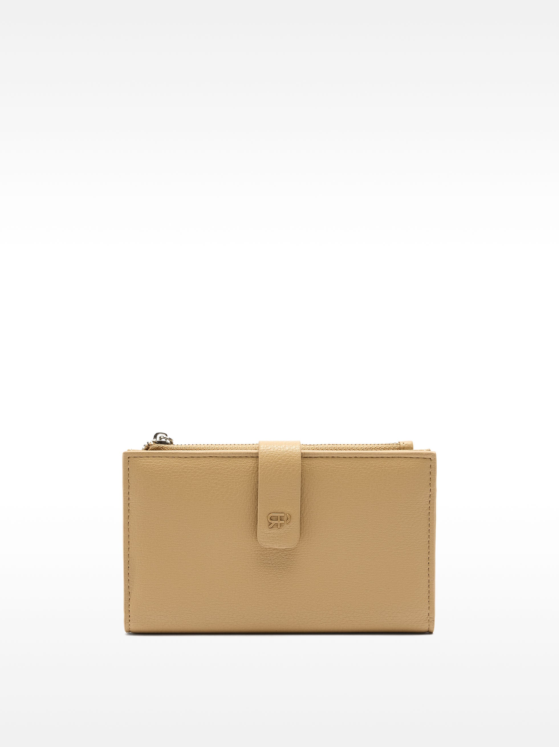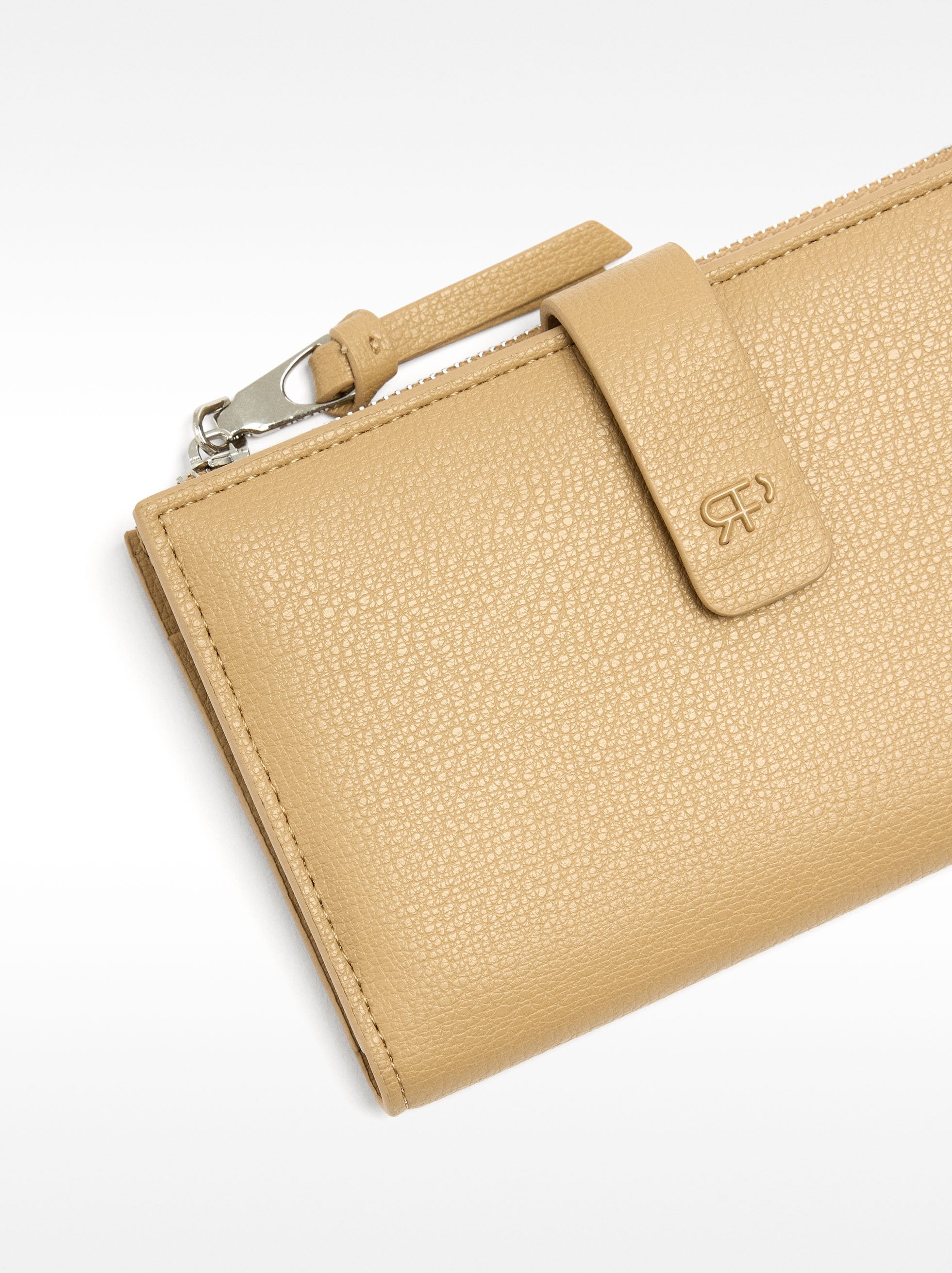 Cartera de tamaño mediano con textura. Ranuras para tarjetas y billetes. Compartimento con cierre de cremallera para monedas. Cierre con botón de presión.