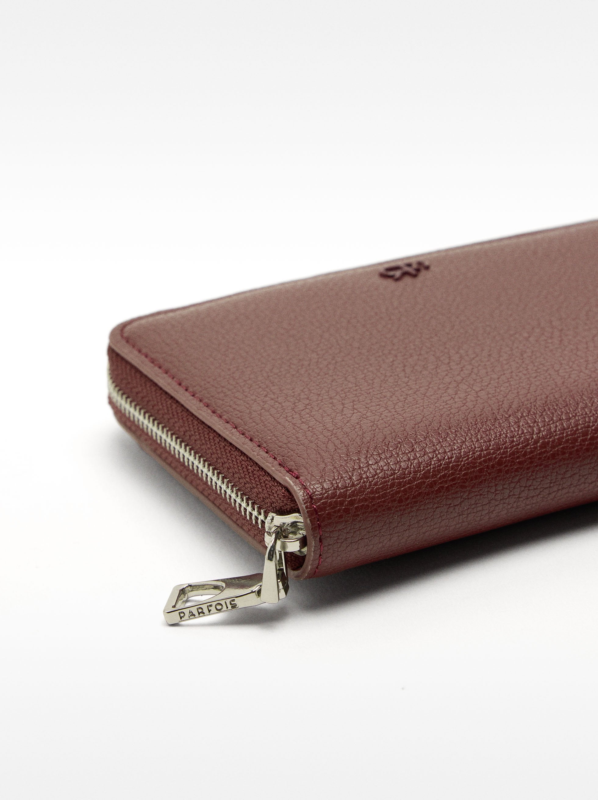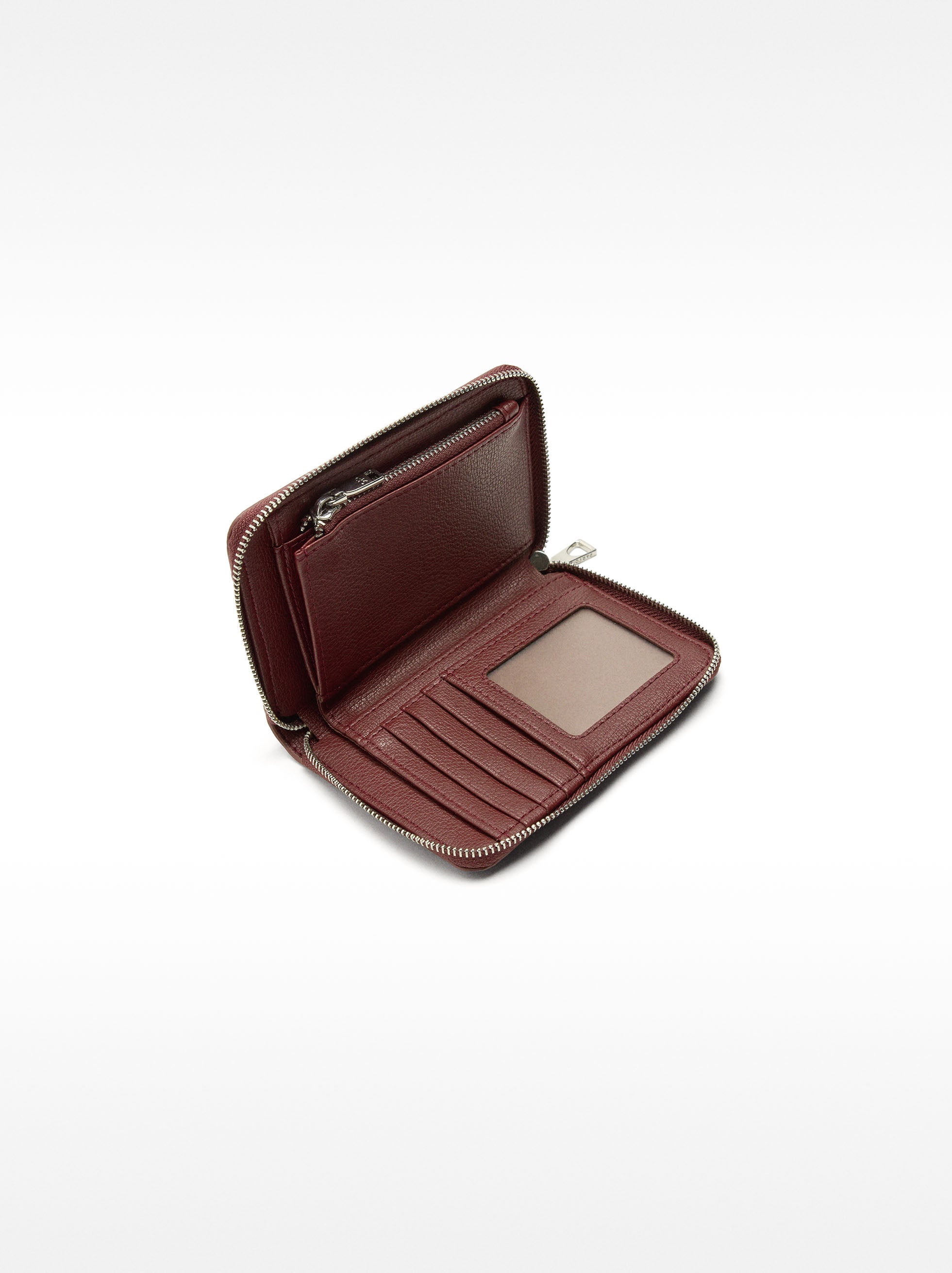 Cartera con textura. Cierre de cremallera. Ranuras para tarjetas y billetes. Compartimento con cierre de cremallera para monedas.