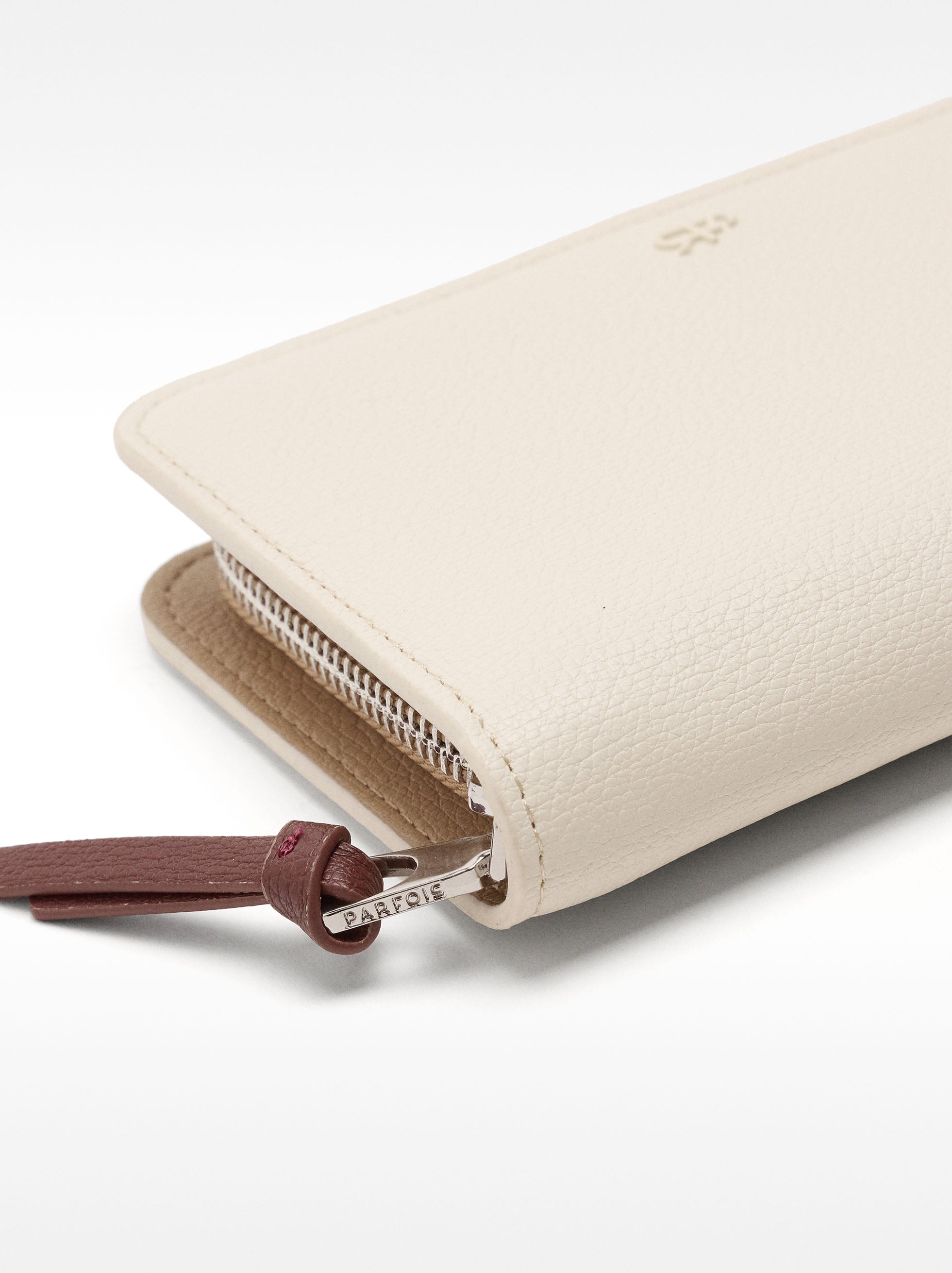 Cartera con textura y cierre de cremallera. Ranuras para tarjetas y billetes. Compartimento con cierre de cremallera para monedas.
