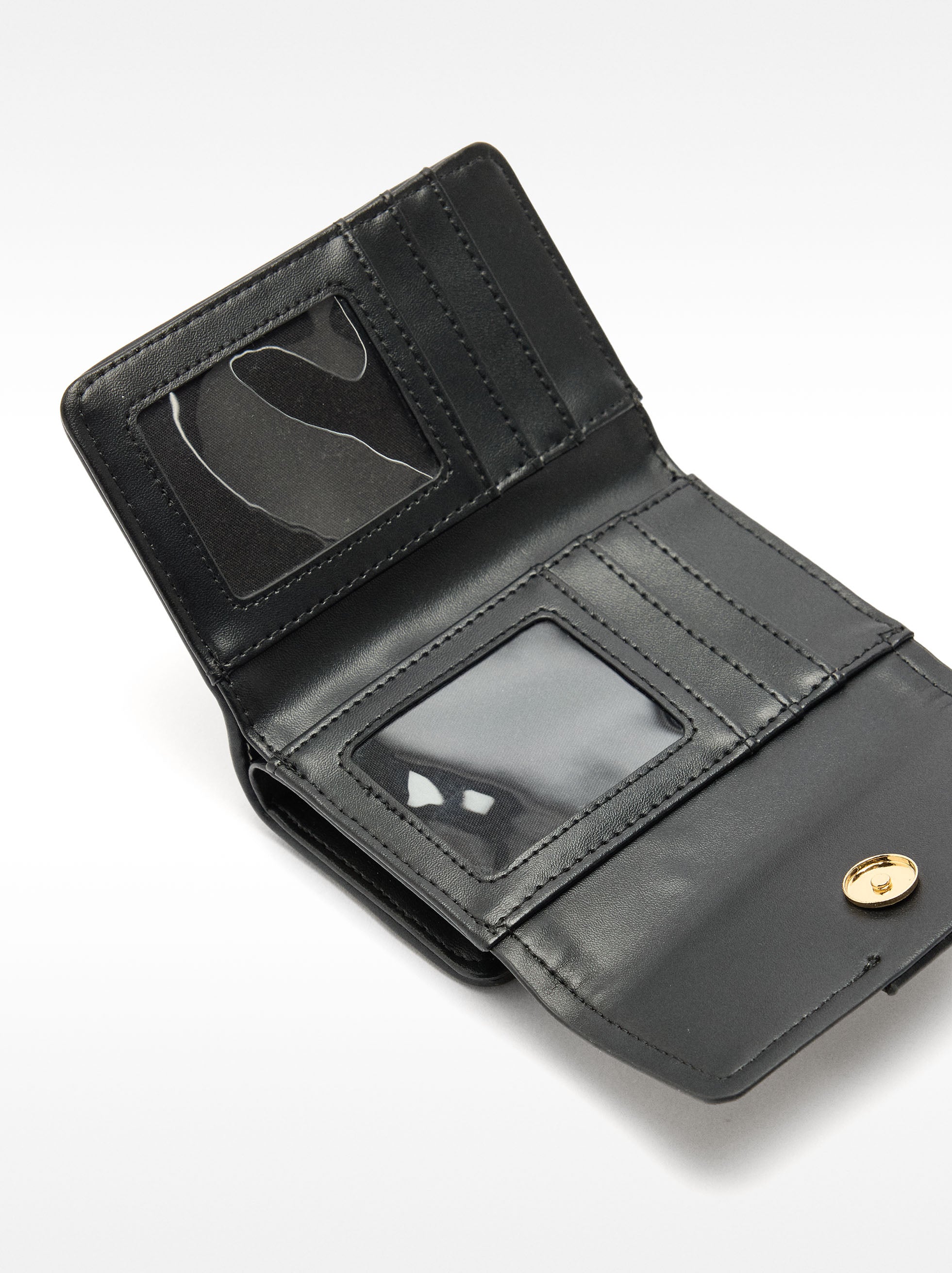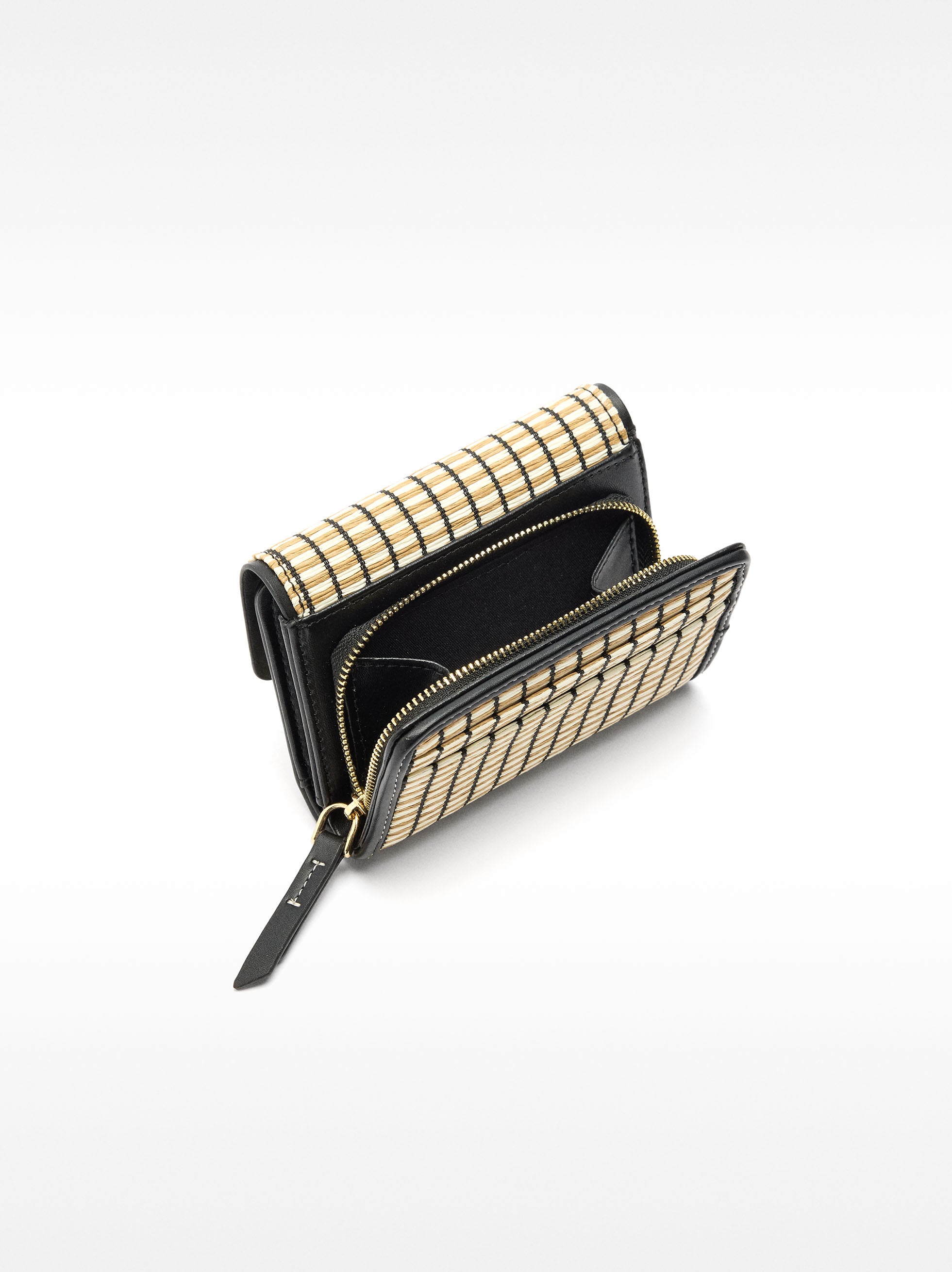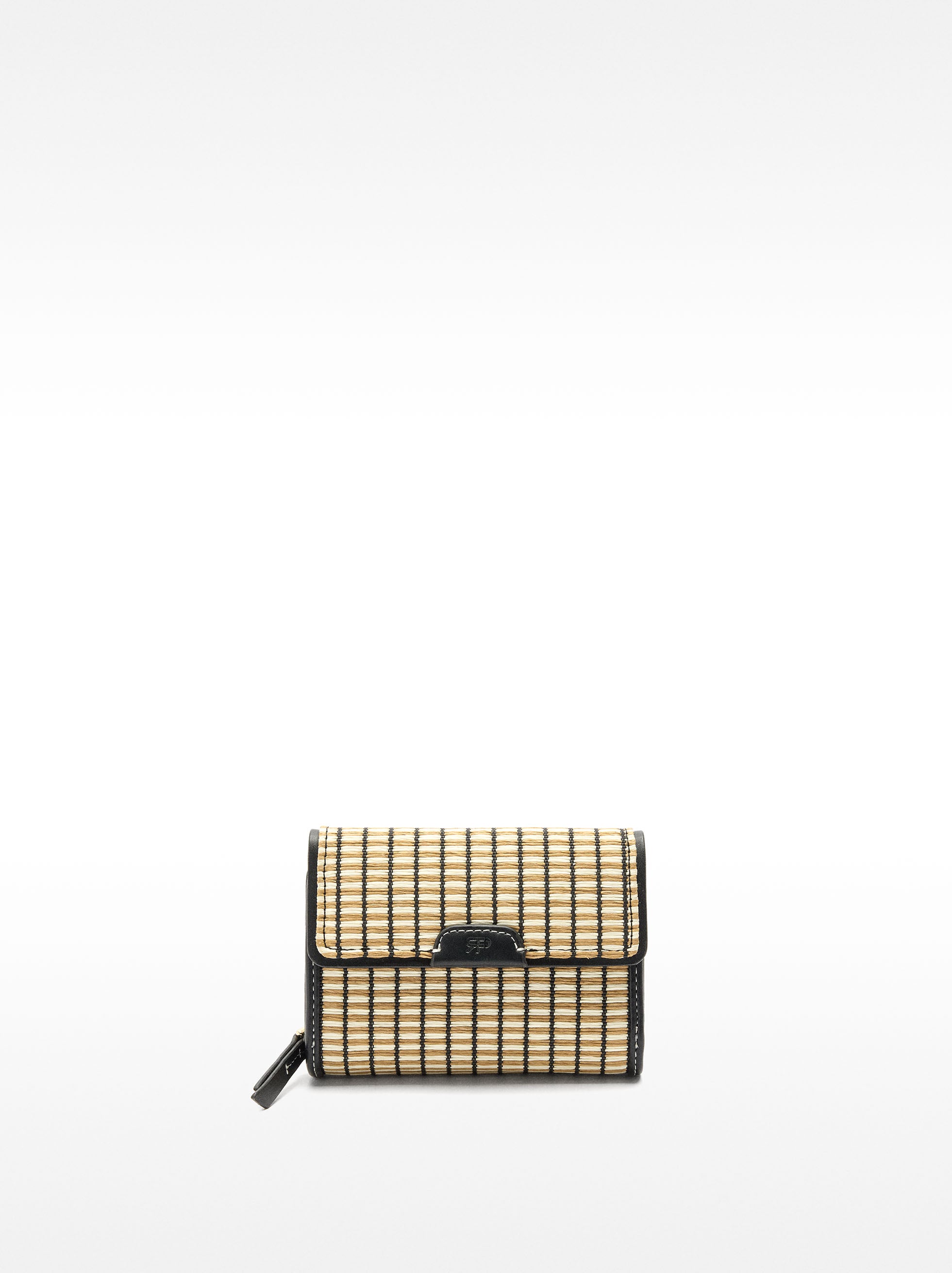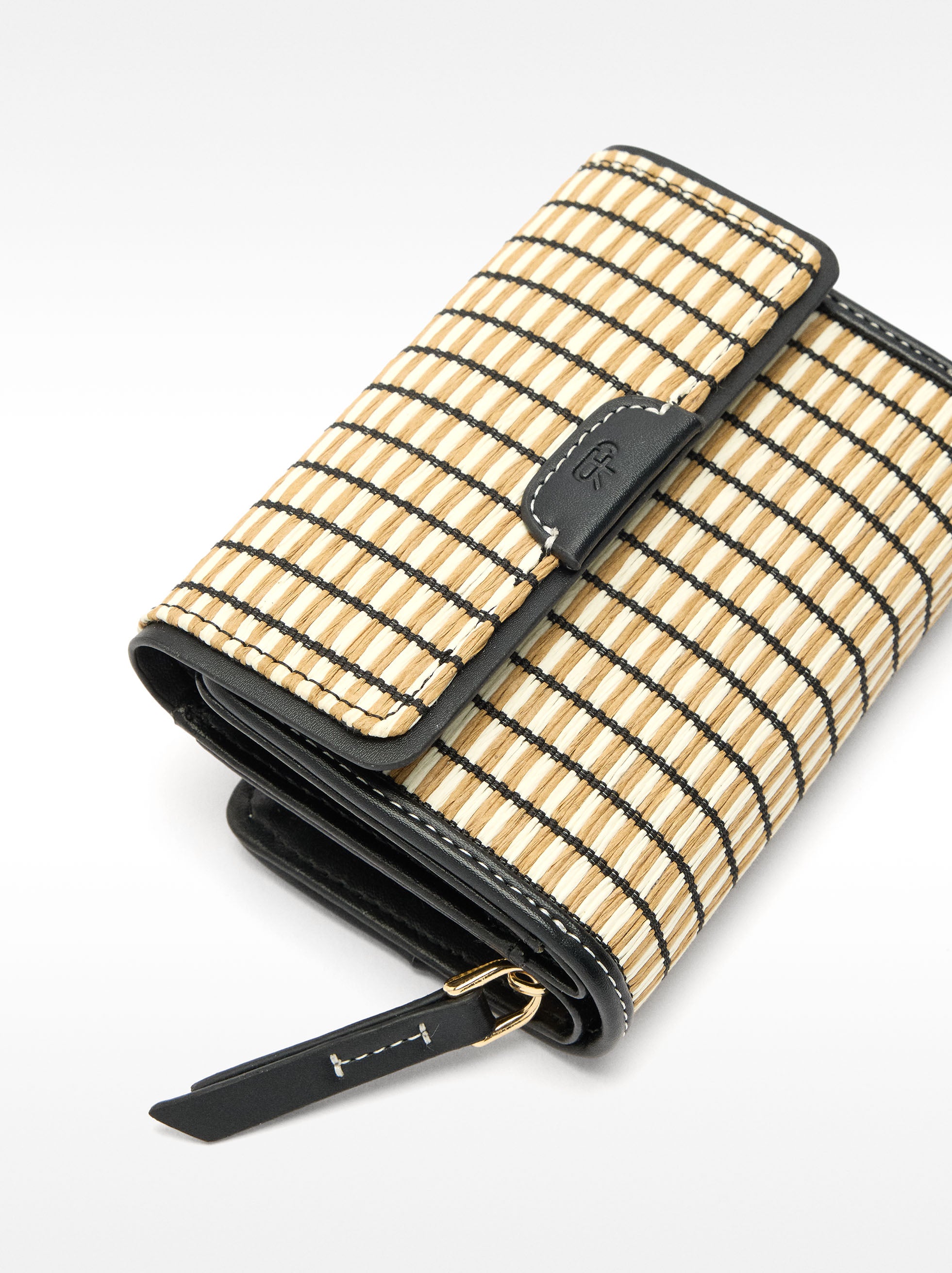 Cartera efecto rafia. División con ranuras para tarjetas y billetes con cierre de solapa imantado. Compartimento con cremallera para monedas.