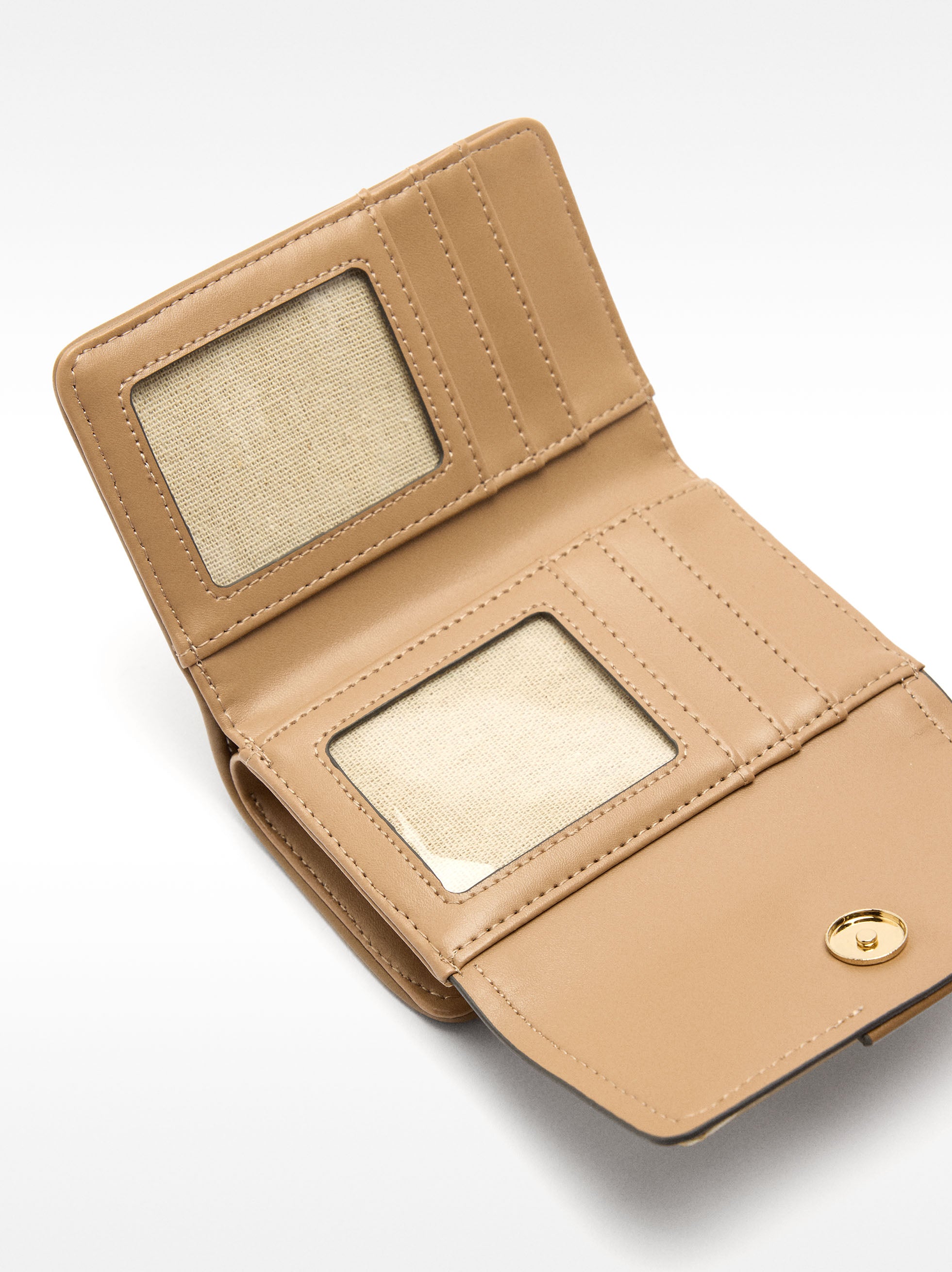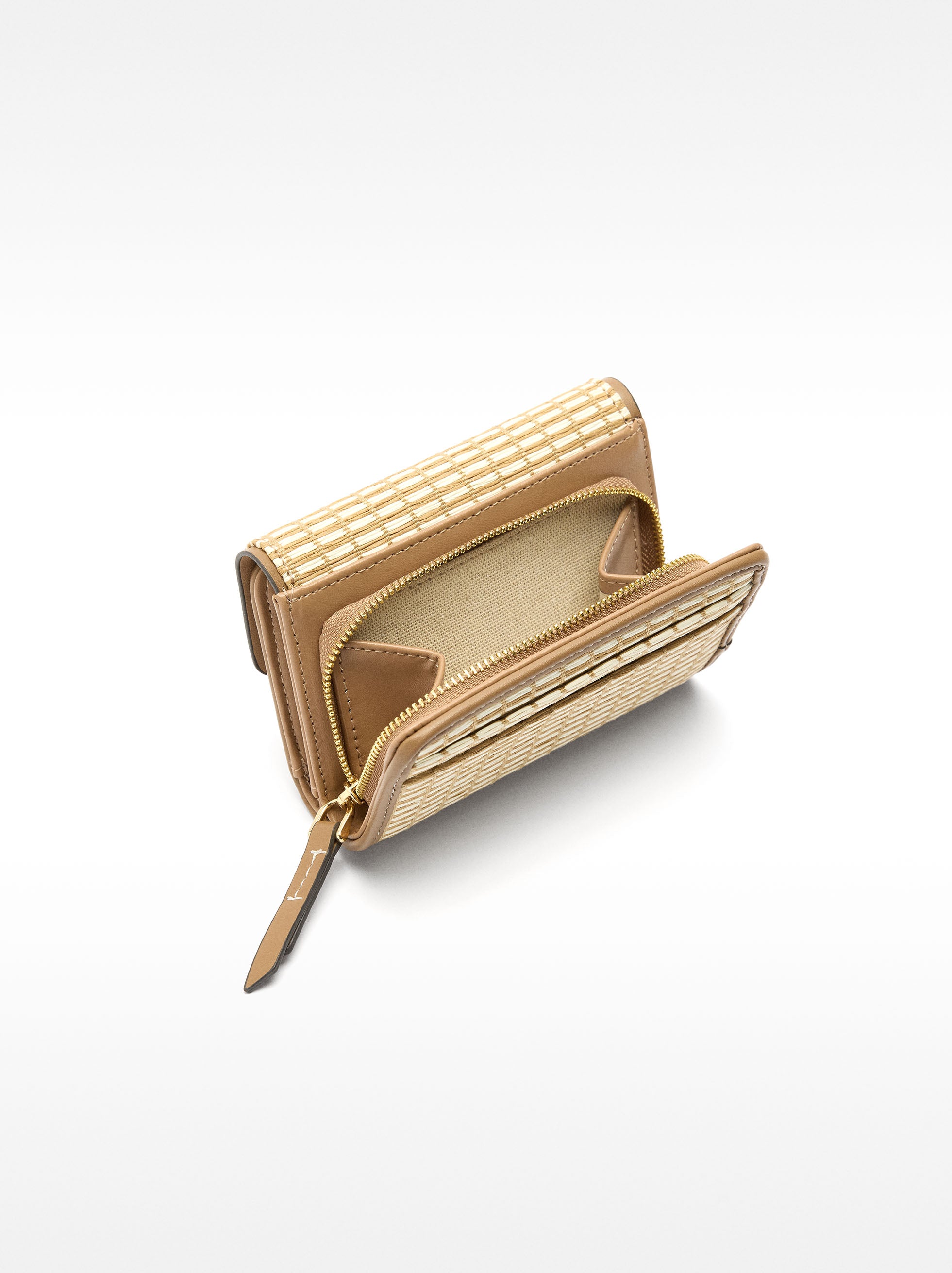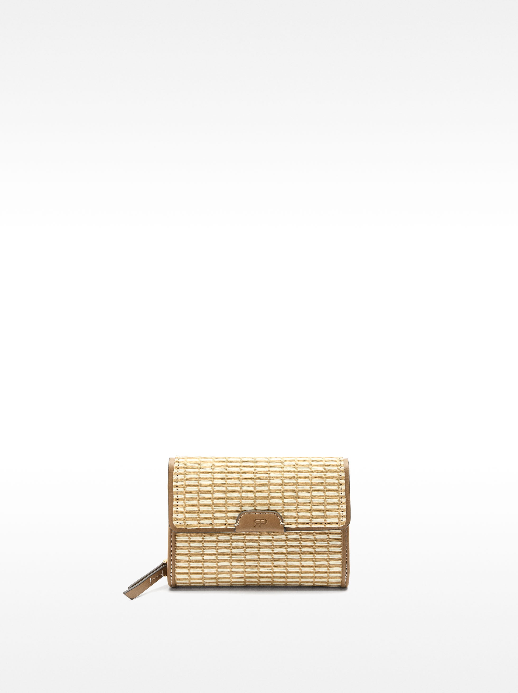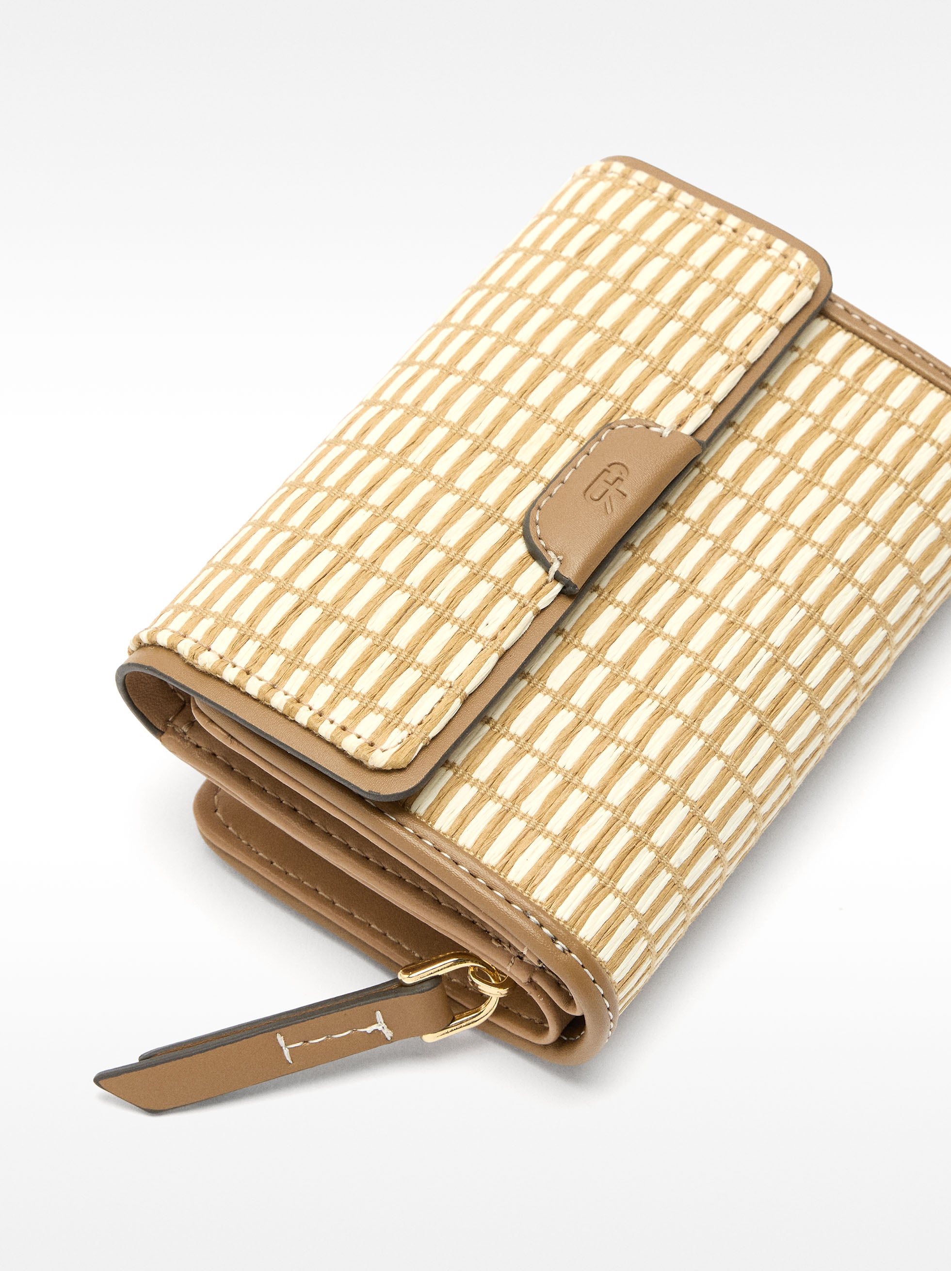 Cartera efecto rafia. División con ranuras para tarjetas y billetes con cierre de solapa imantado. Compartimento con cremallera para monedas.