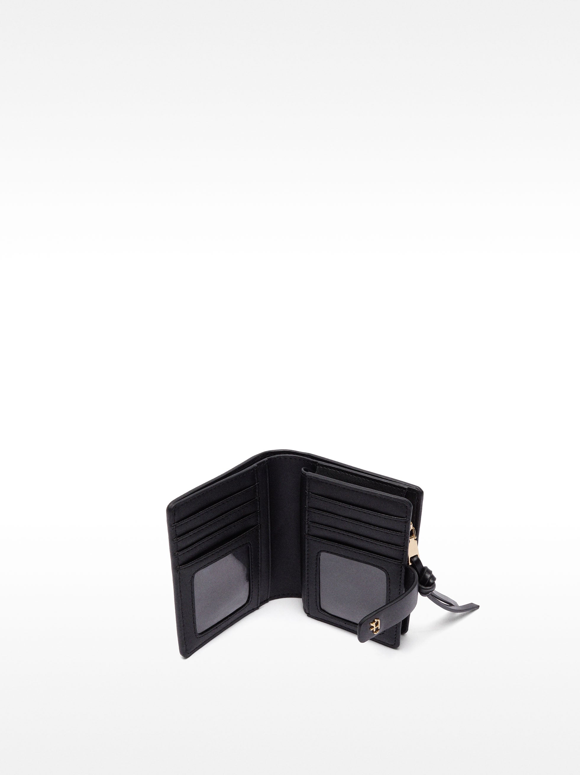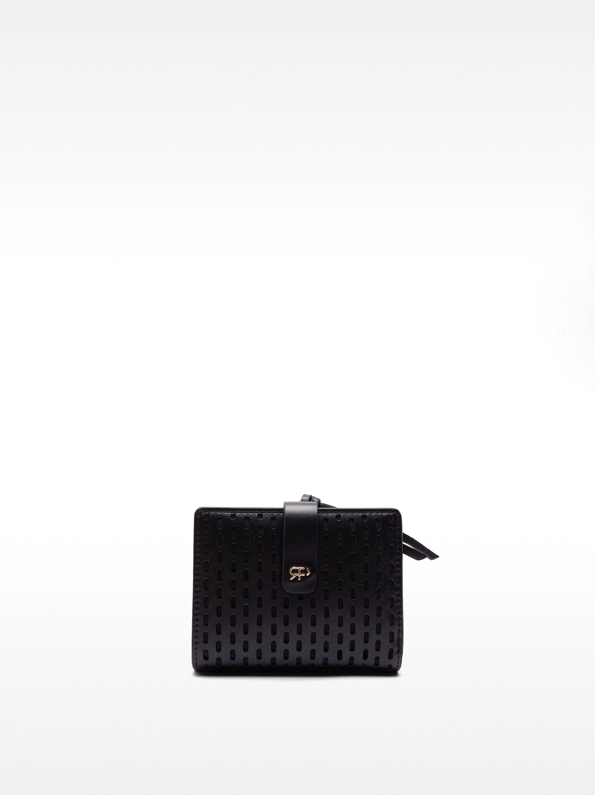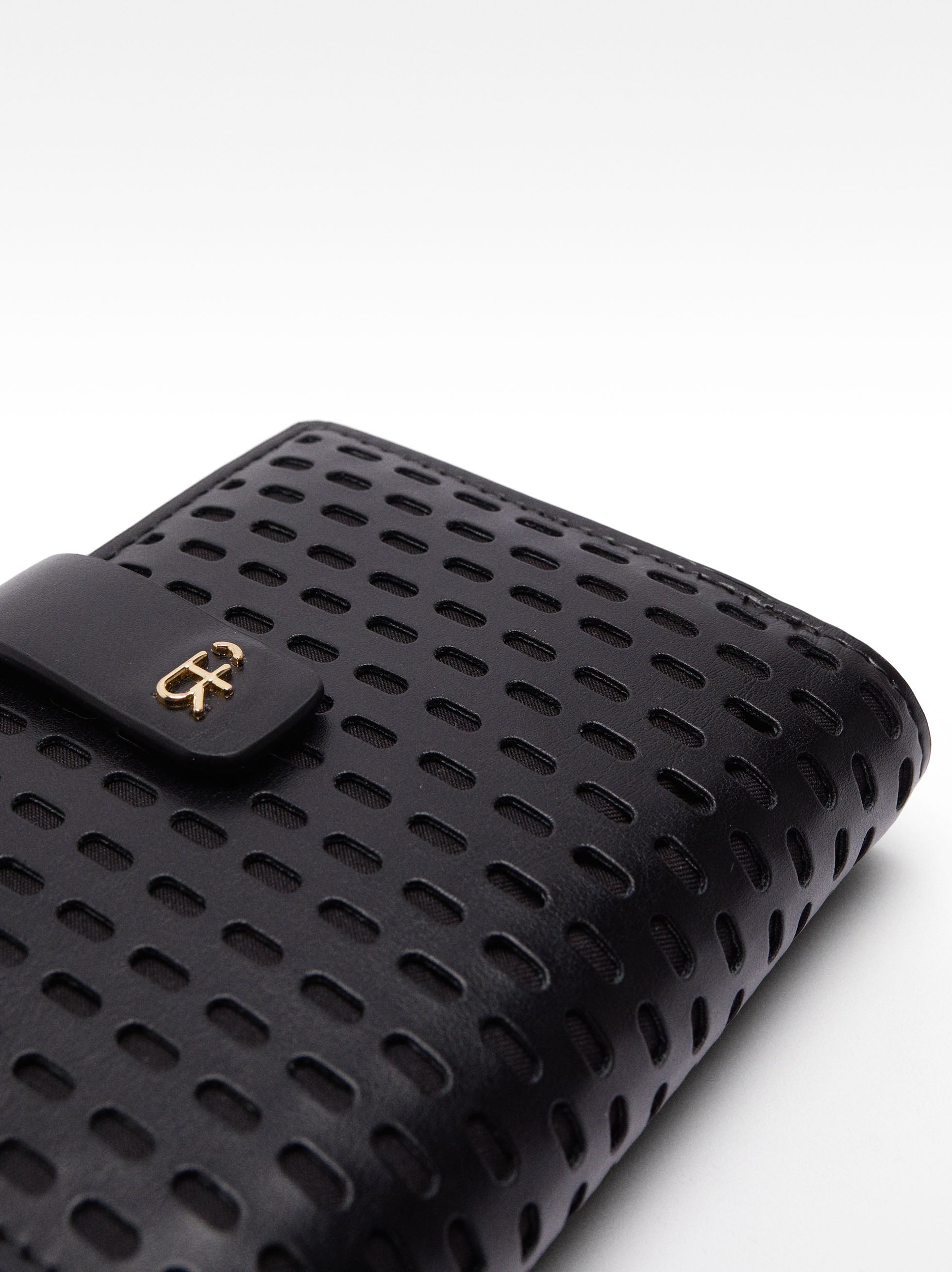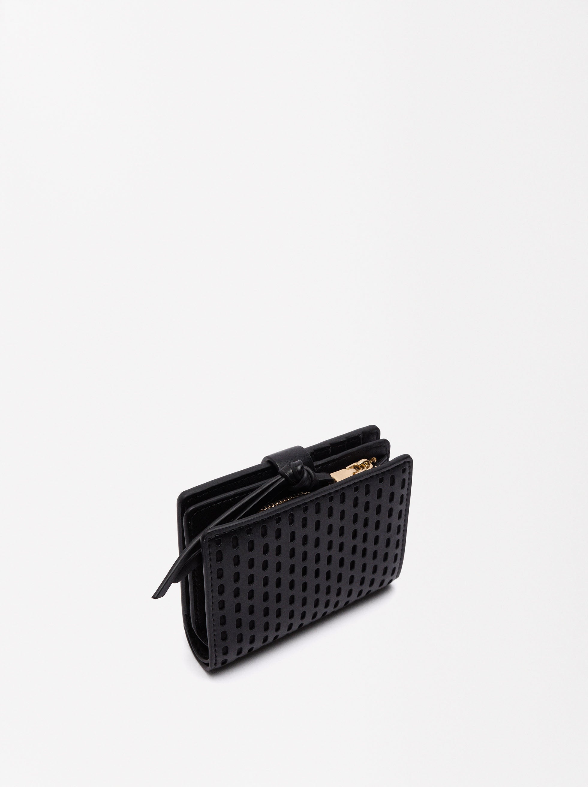 Cartera perforada. División con ranuras para tarjetas y billetes. Compartimento con cierre de cremallera para monedas. Cierre con botón a presión.