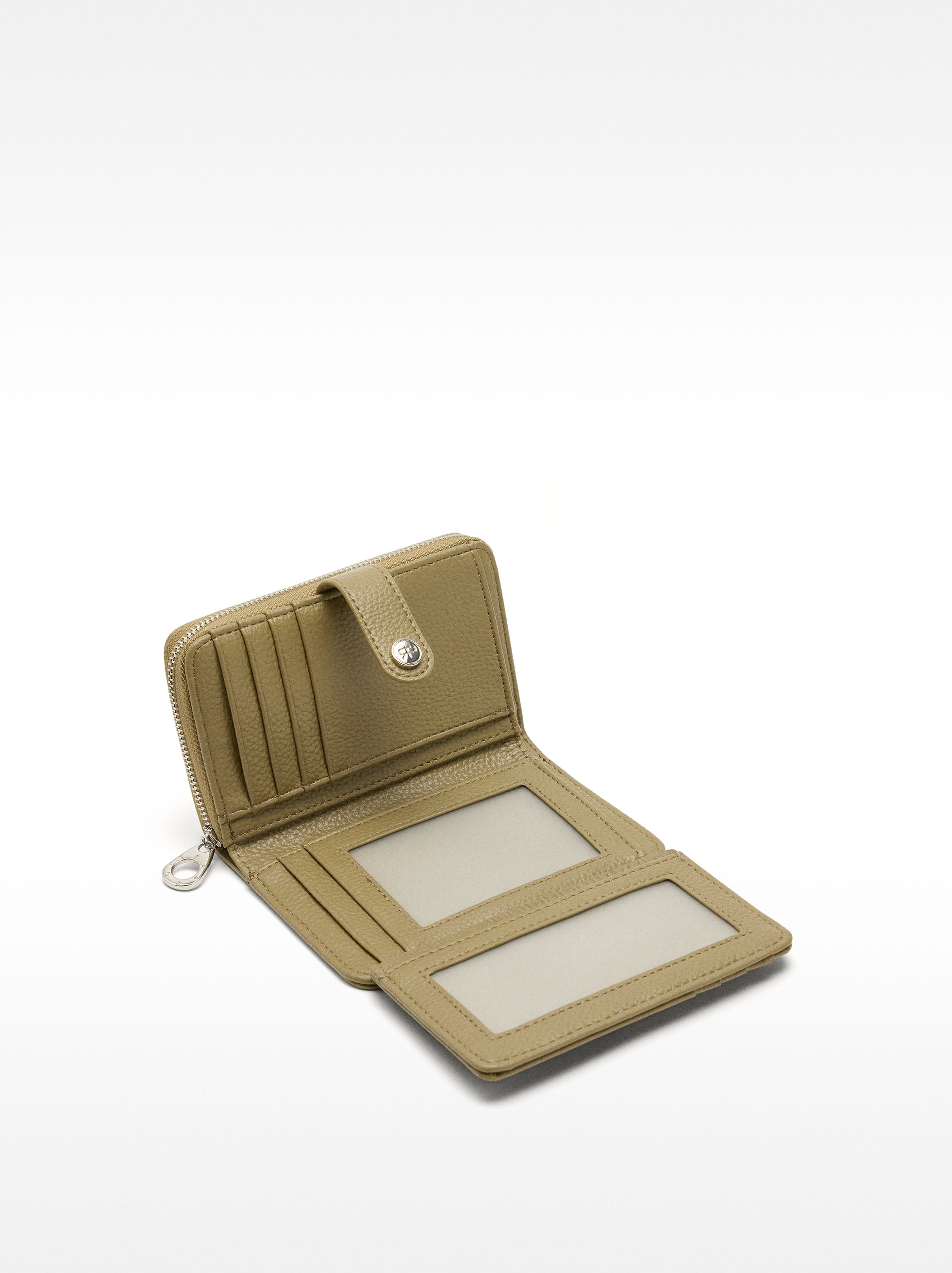 Billetera texturada. Tamaño mediano. Ranuras para tarjetas y billetes. Compartimento con cremallera para monedas. Cierre con botón de presión.