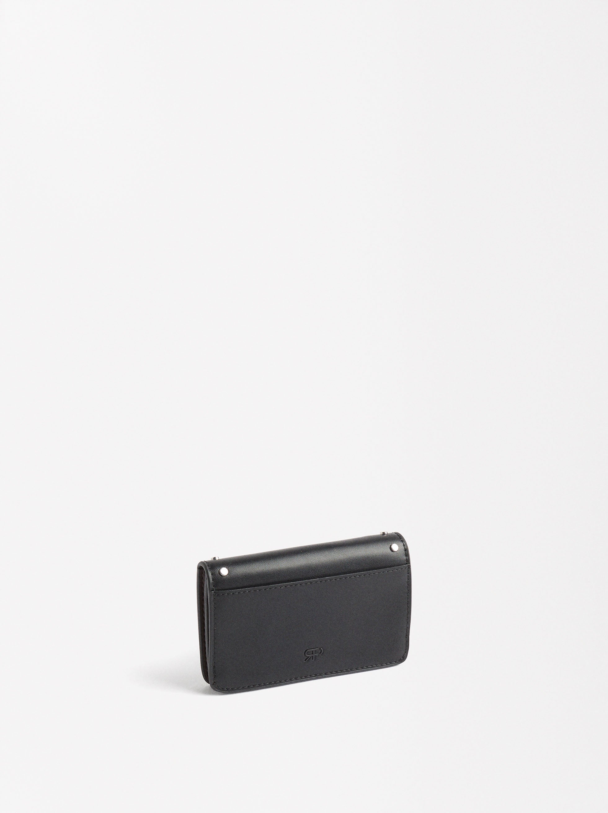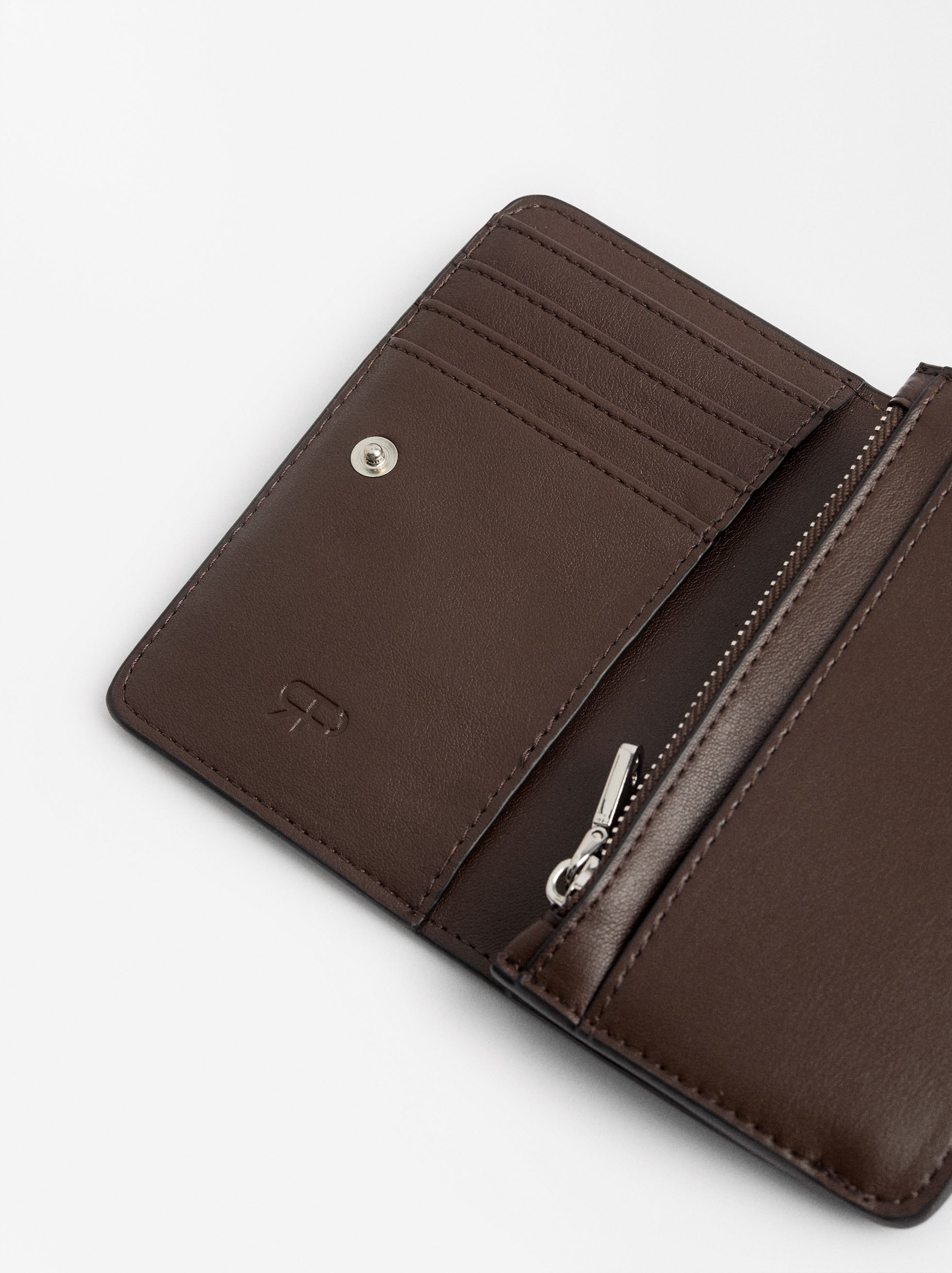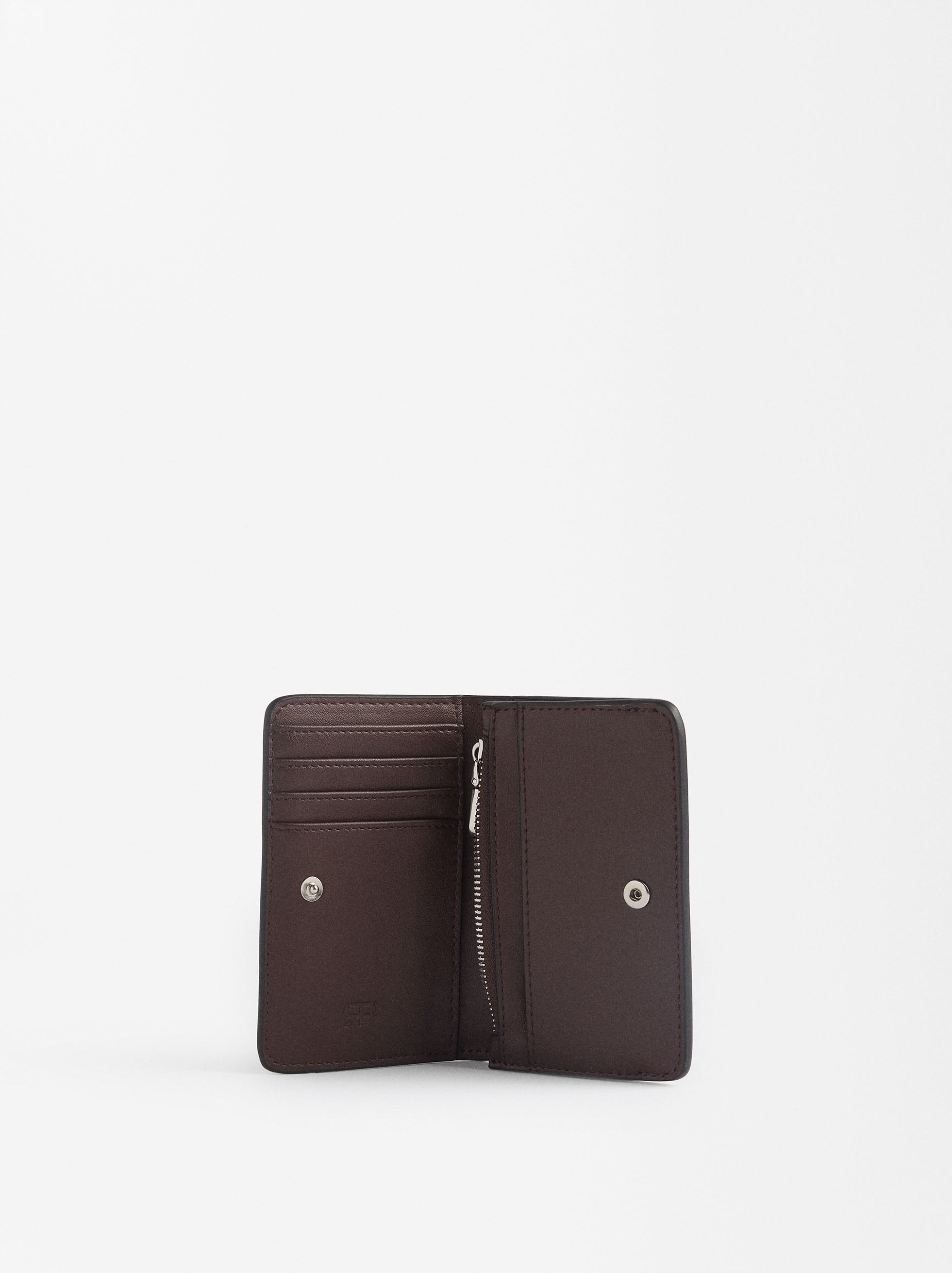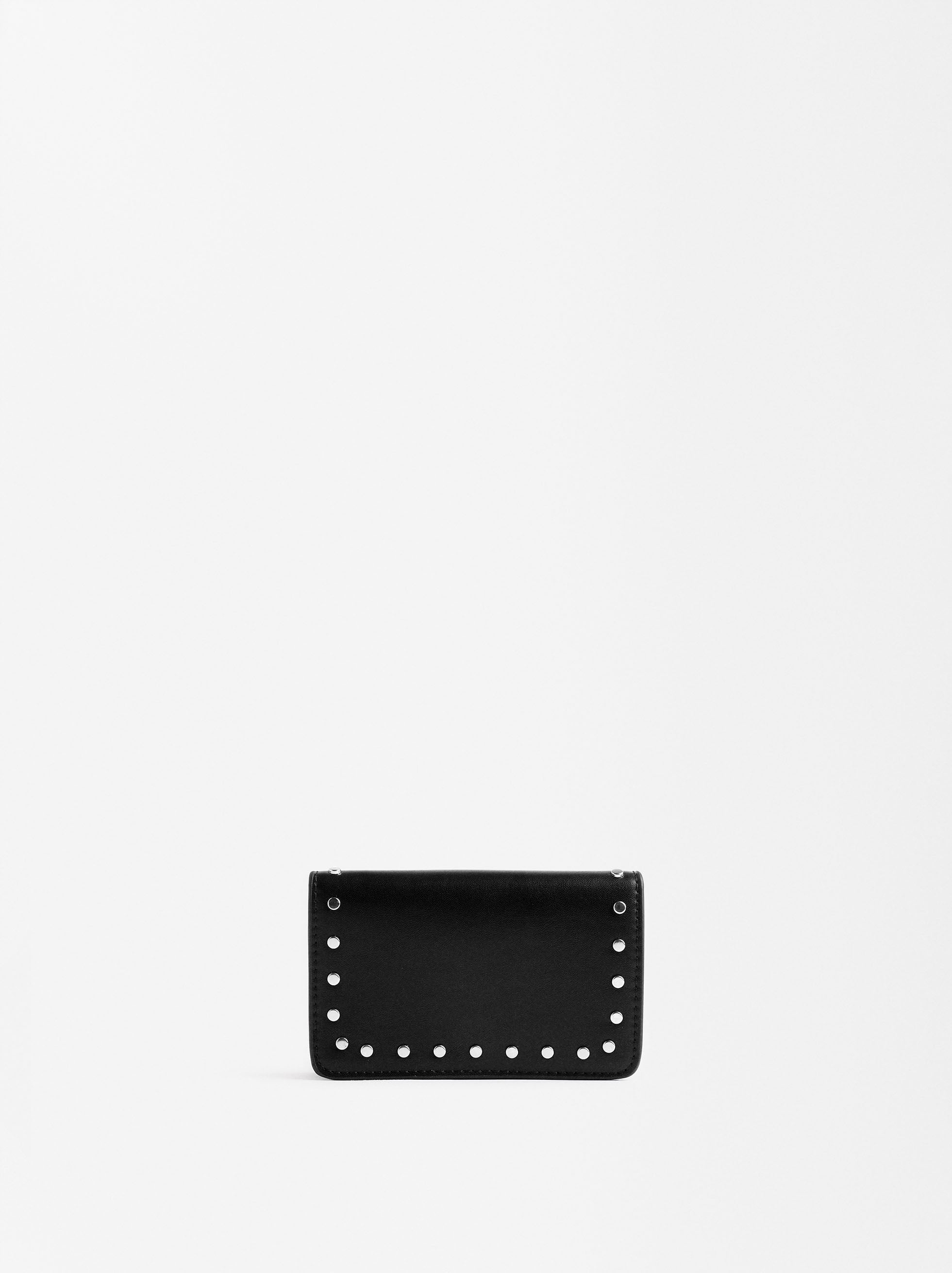 Cartera con tachuelas y cierre de botón. Ranuras para tarjetas y billetes. Bolsillo para monedas con cremallera.