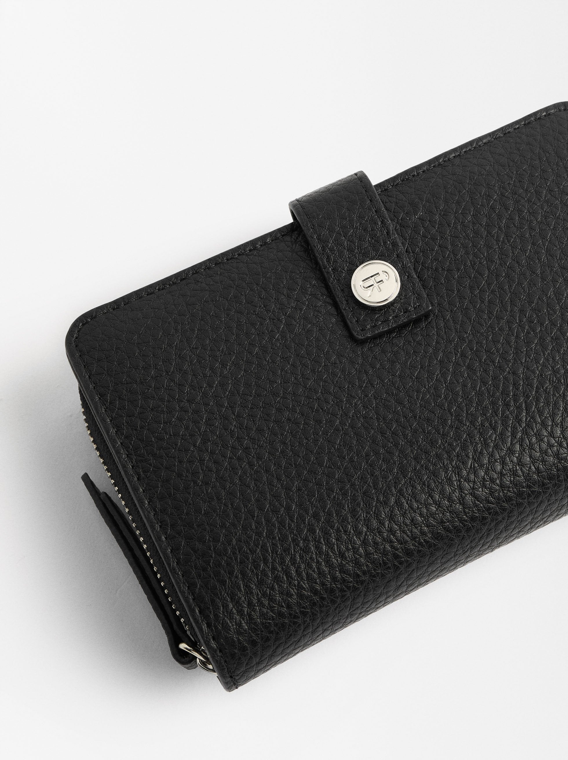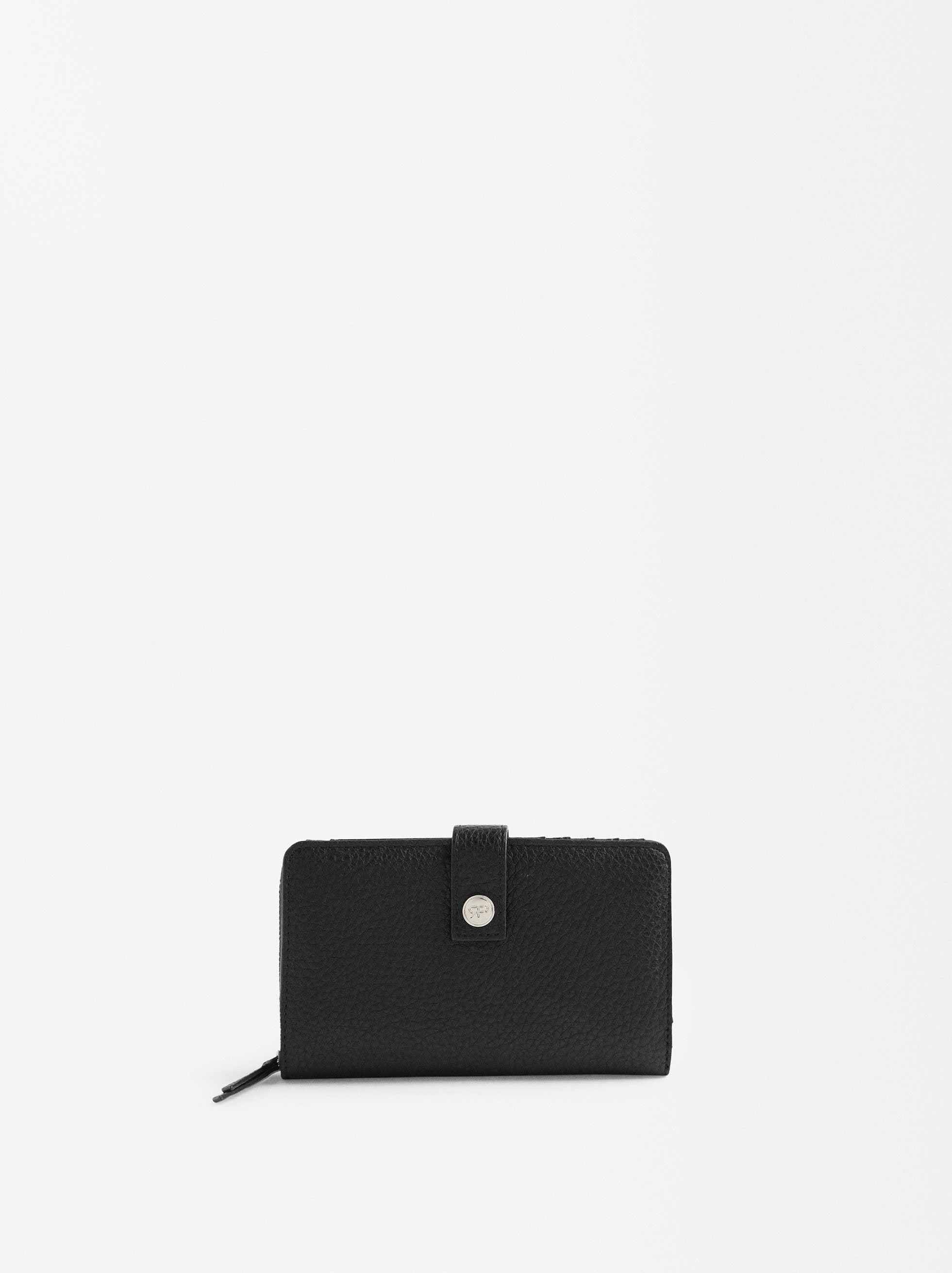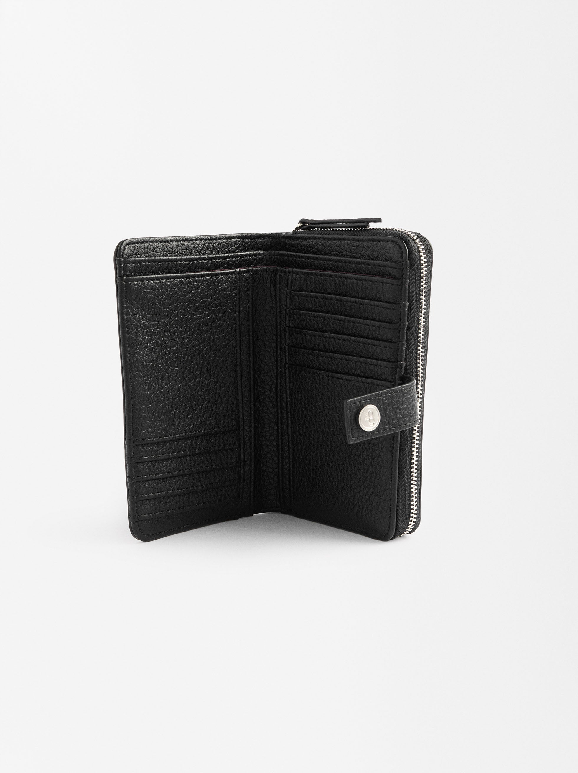 Cartera con textura de tamaño mediano. División con ranuras para tarjetas y billetes; cierre de botón a presión. Compartimento con cierre de cremallera para monedas.