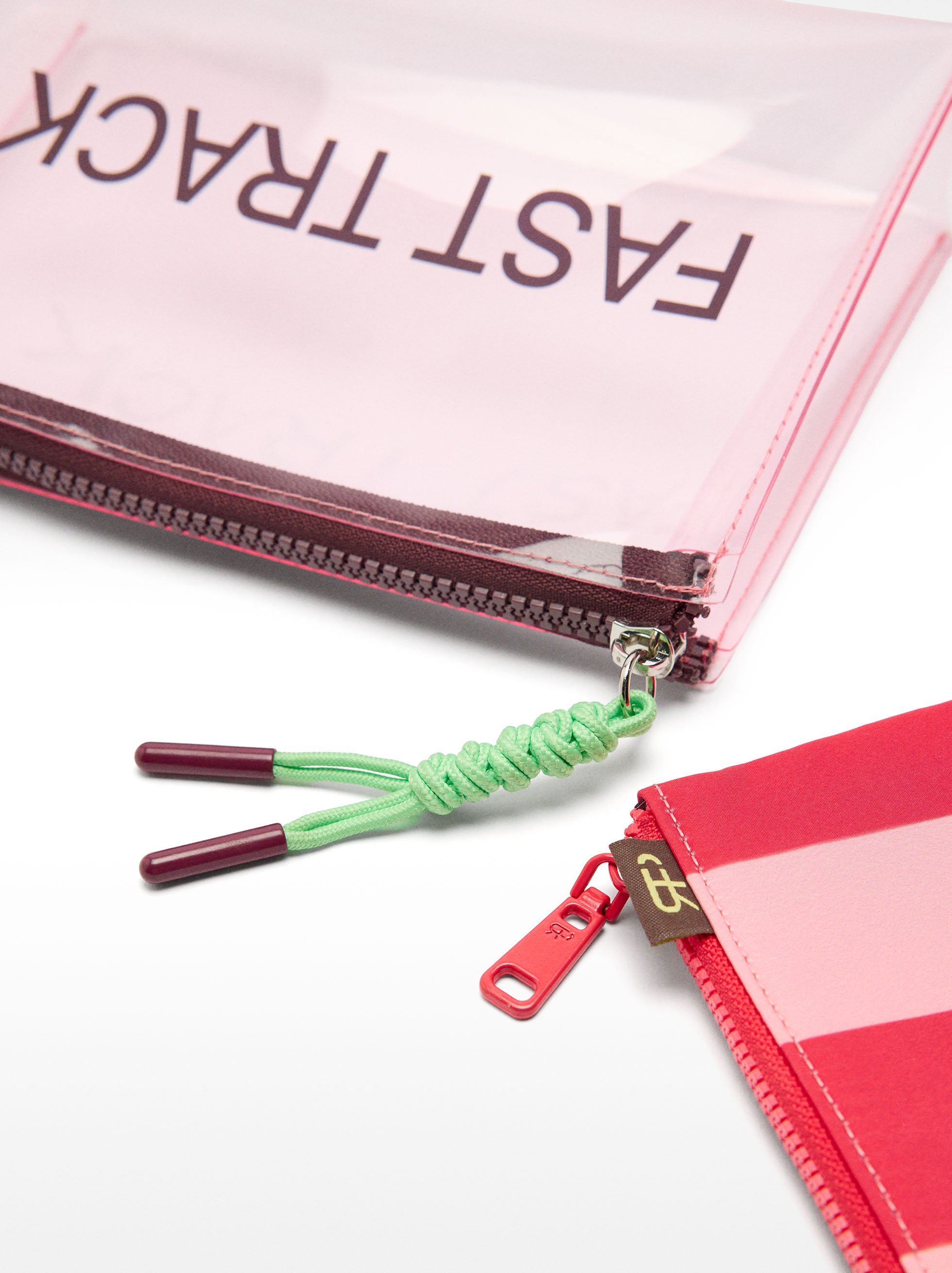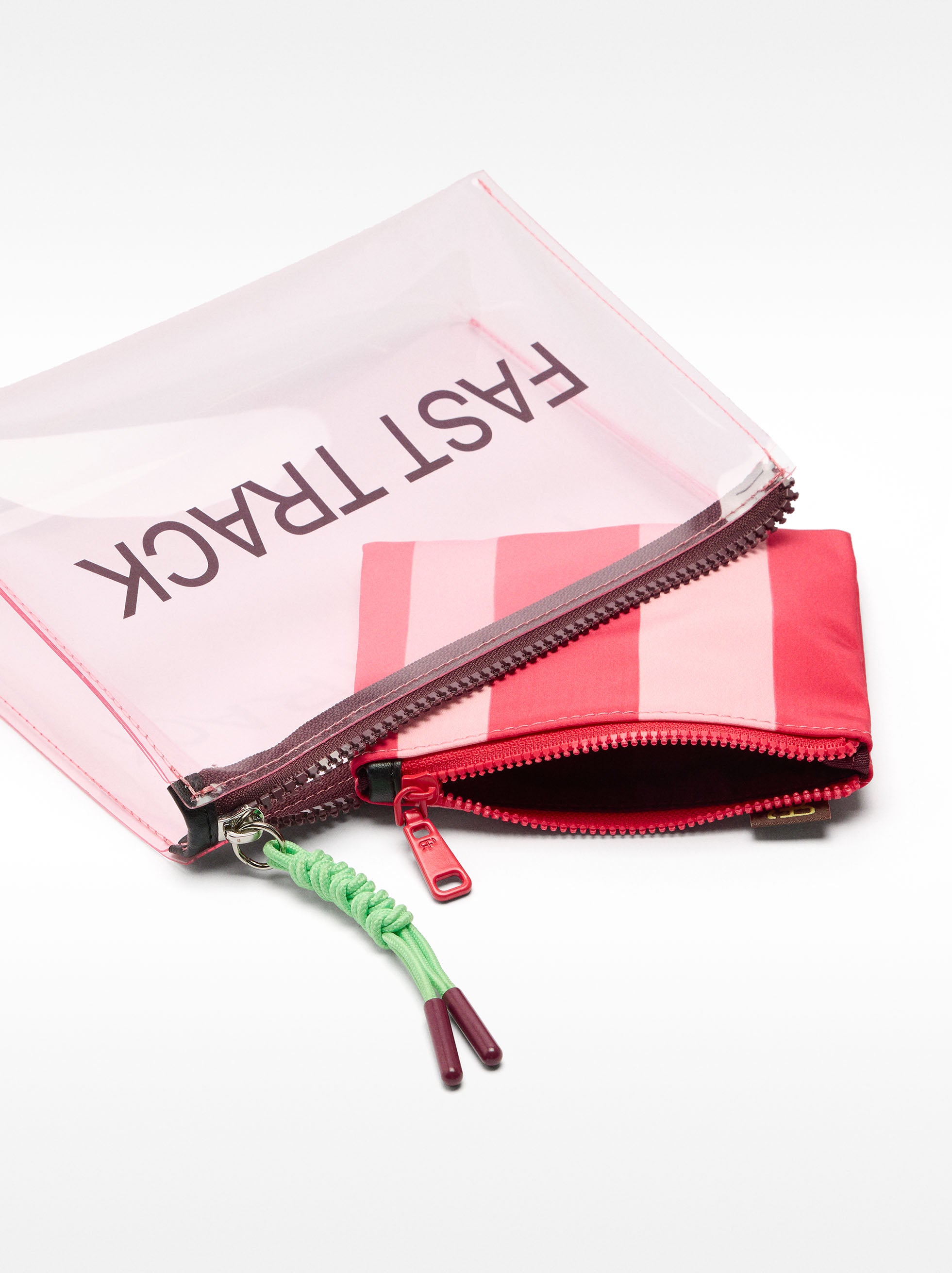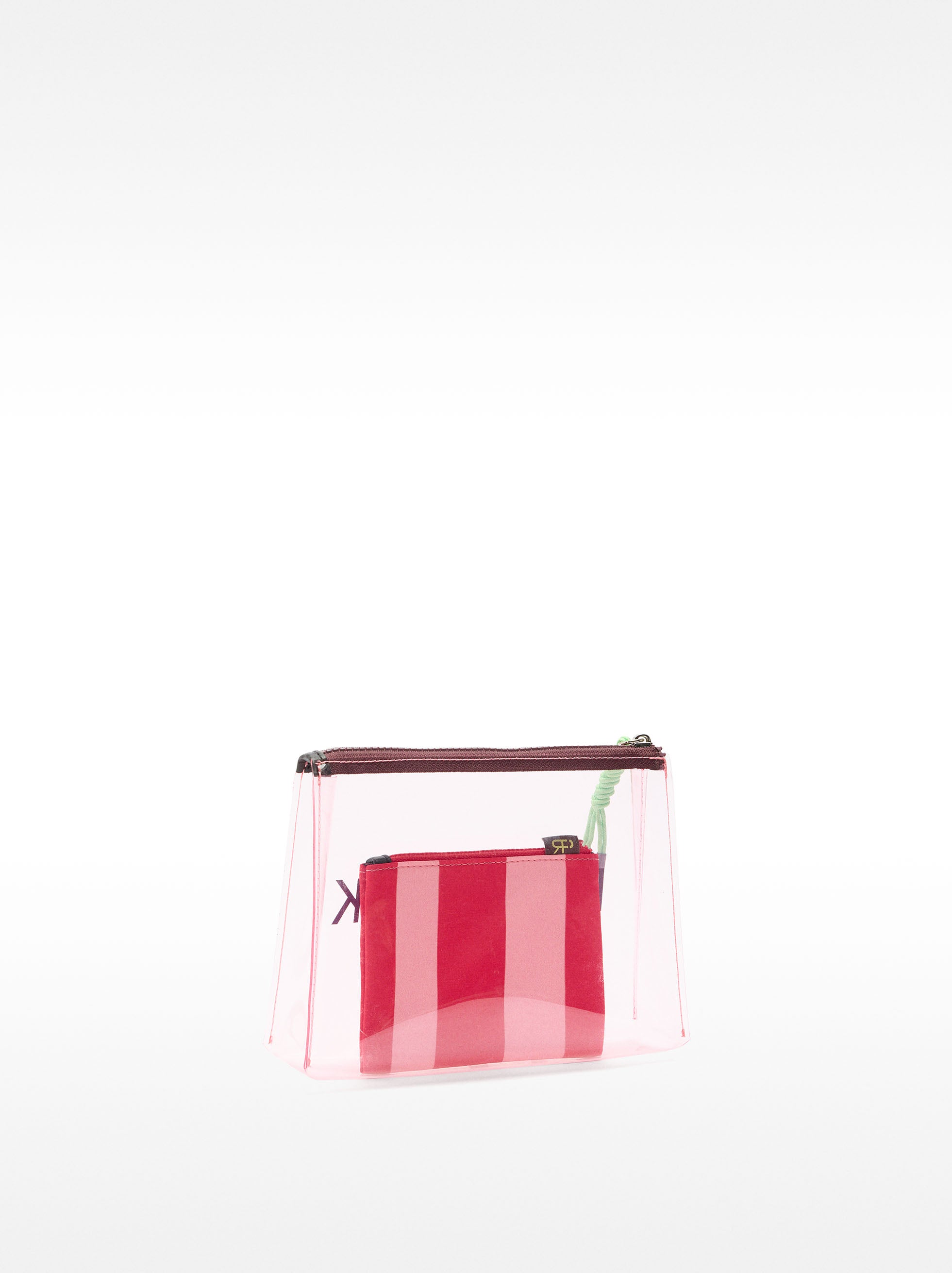 Neceser doble: uno pequeño a rayas y otro más grande transparente. Cierre de cremallera. Detalle de nudo.