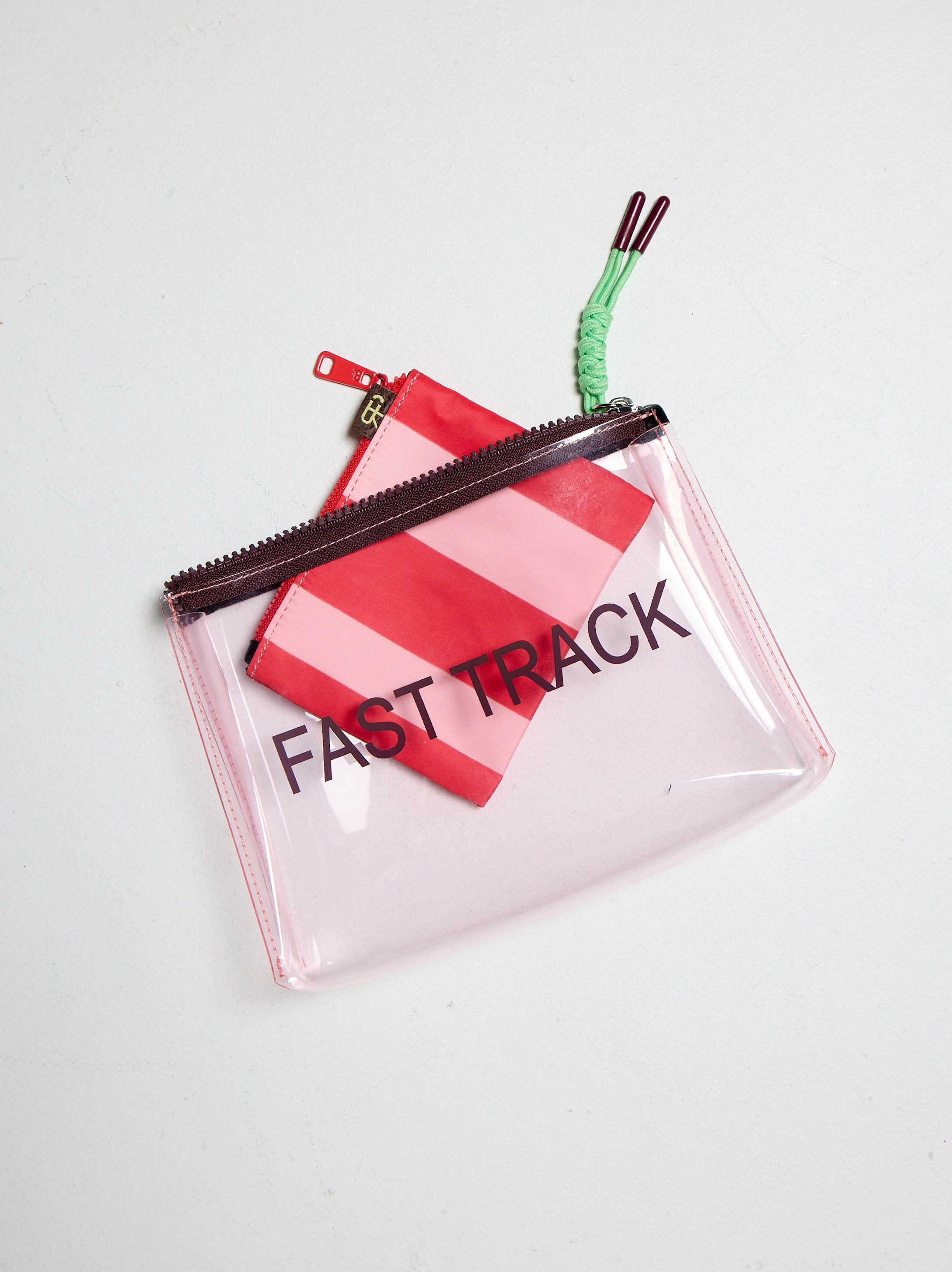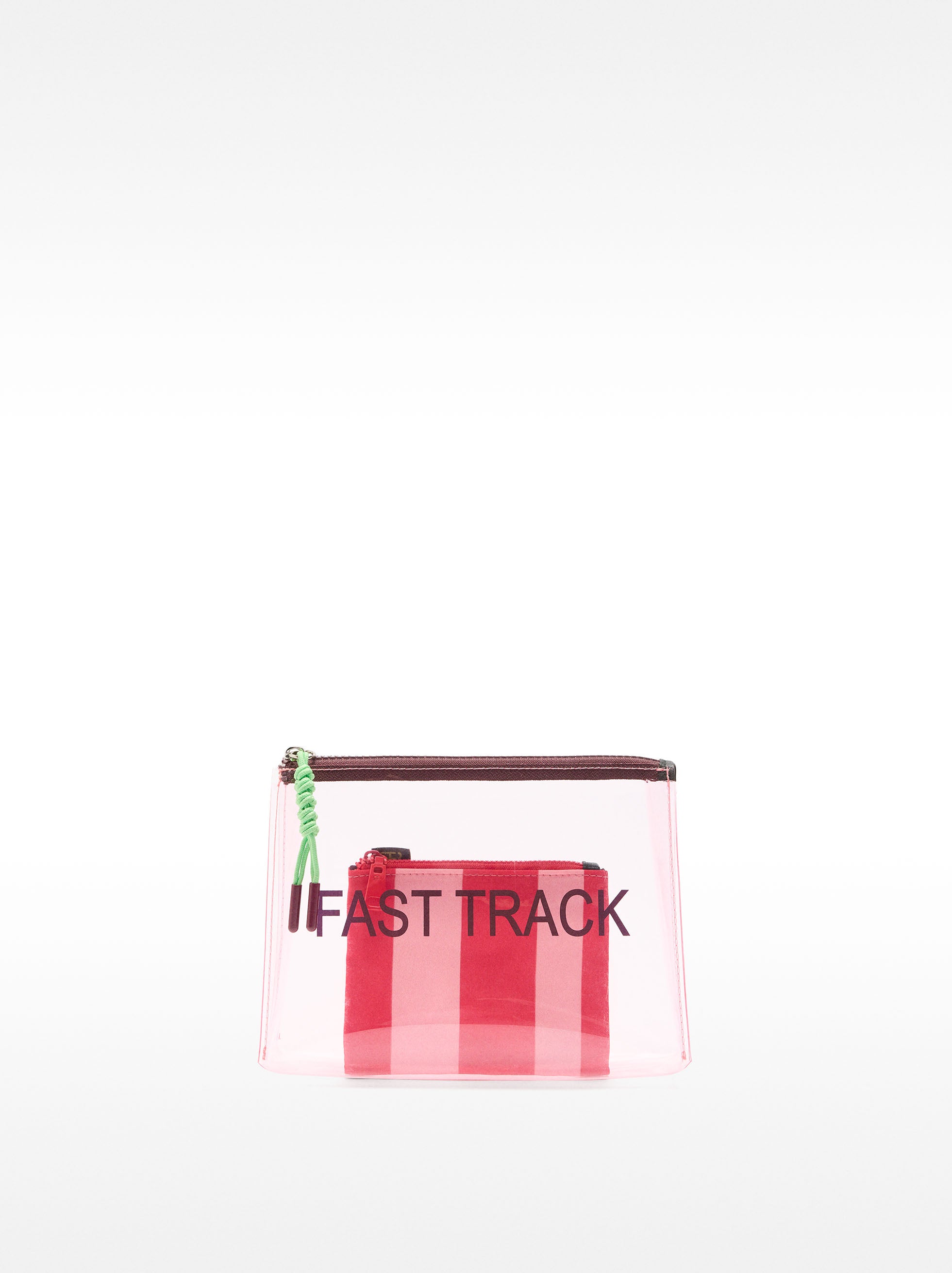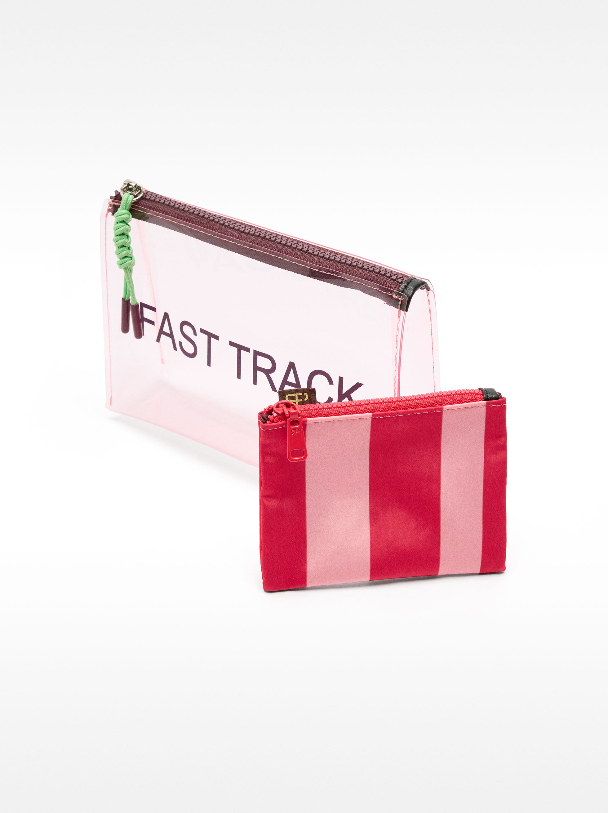 Neceser doble: uno pequeño a rayas y otro más grande transparente. Cierre de cremallera. Detalle de nudo.