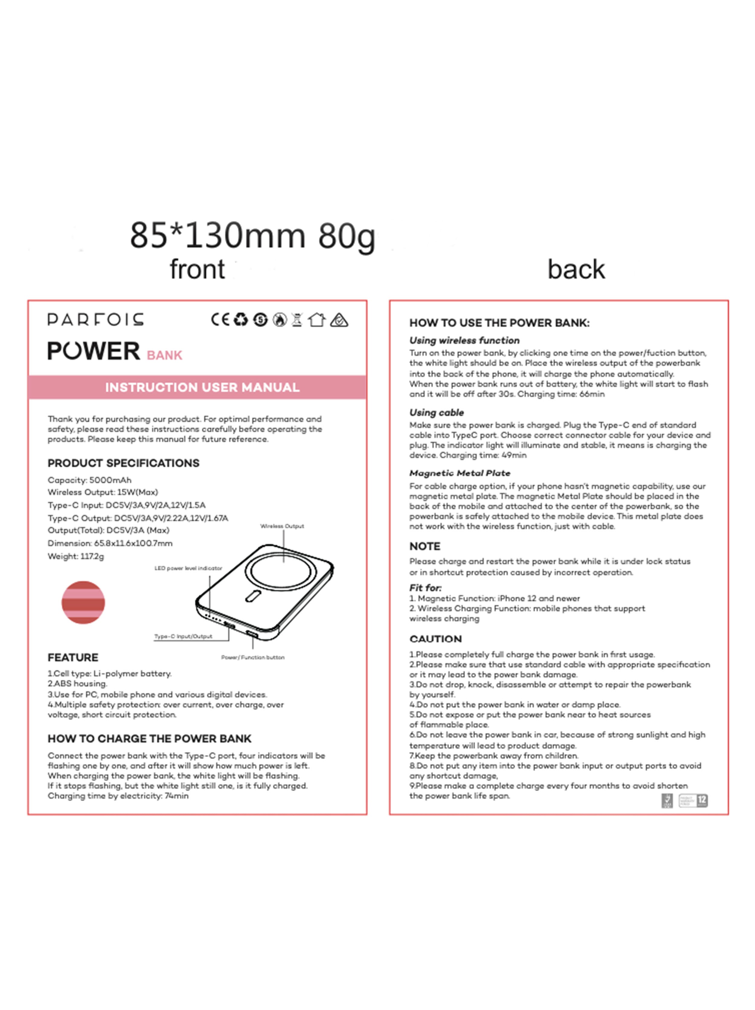 Power bank o batería portátil, que permite cargar dispositivos electrónicos en cualquier momento. Este modelo cuenta con una funda de ABS con estampado de rayas, brindando resistencia y estilo. Es compatible con todos los dispositivos digitales y ofrece carga tanto inalámbrica como por cable. Además, incorpora protección múltiple de seguridad contra sobrecarga, sobrecalentamiento y descargas eléctricas. Para encender, presione el botón una vez, y para apagar, presione dos veces.