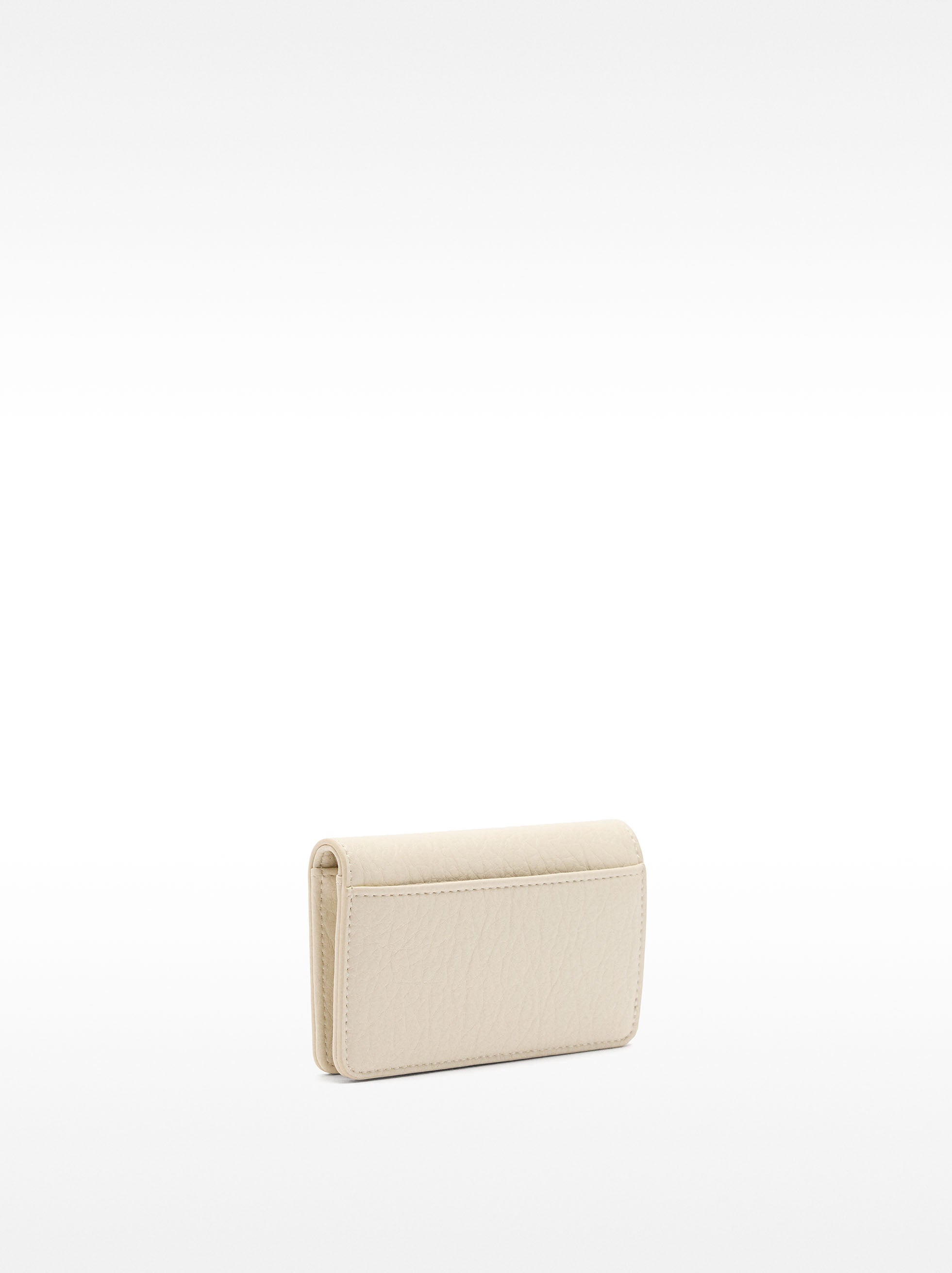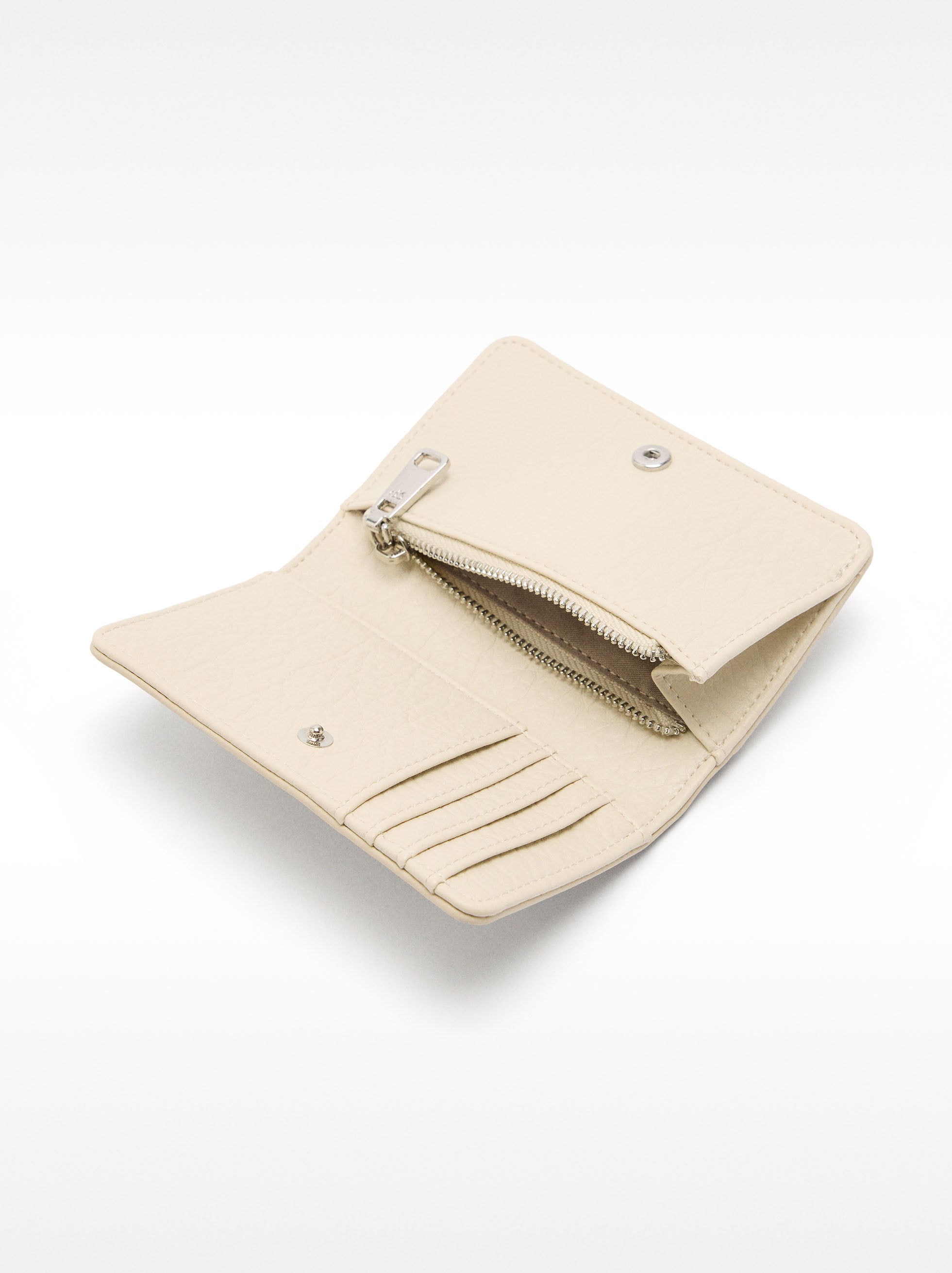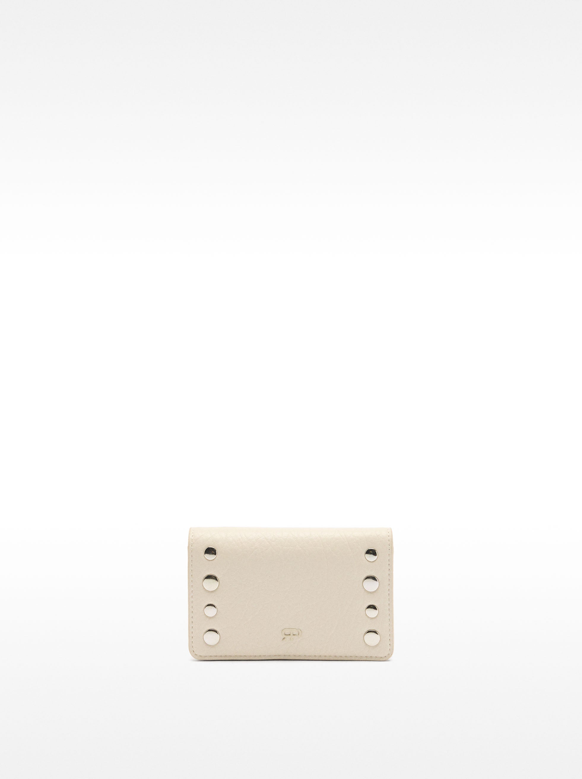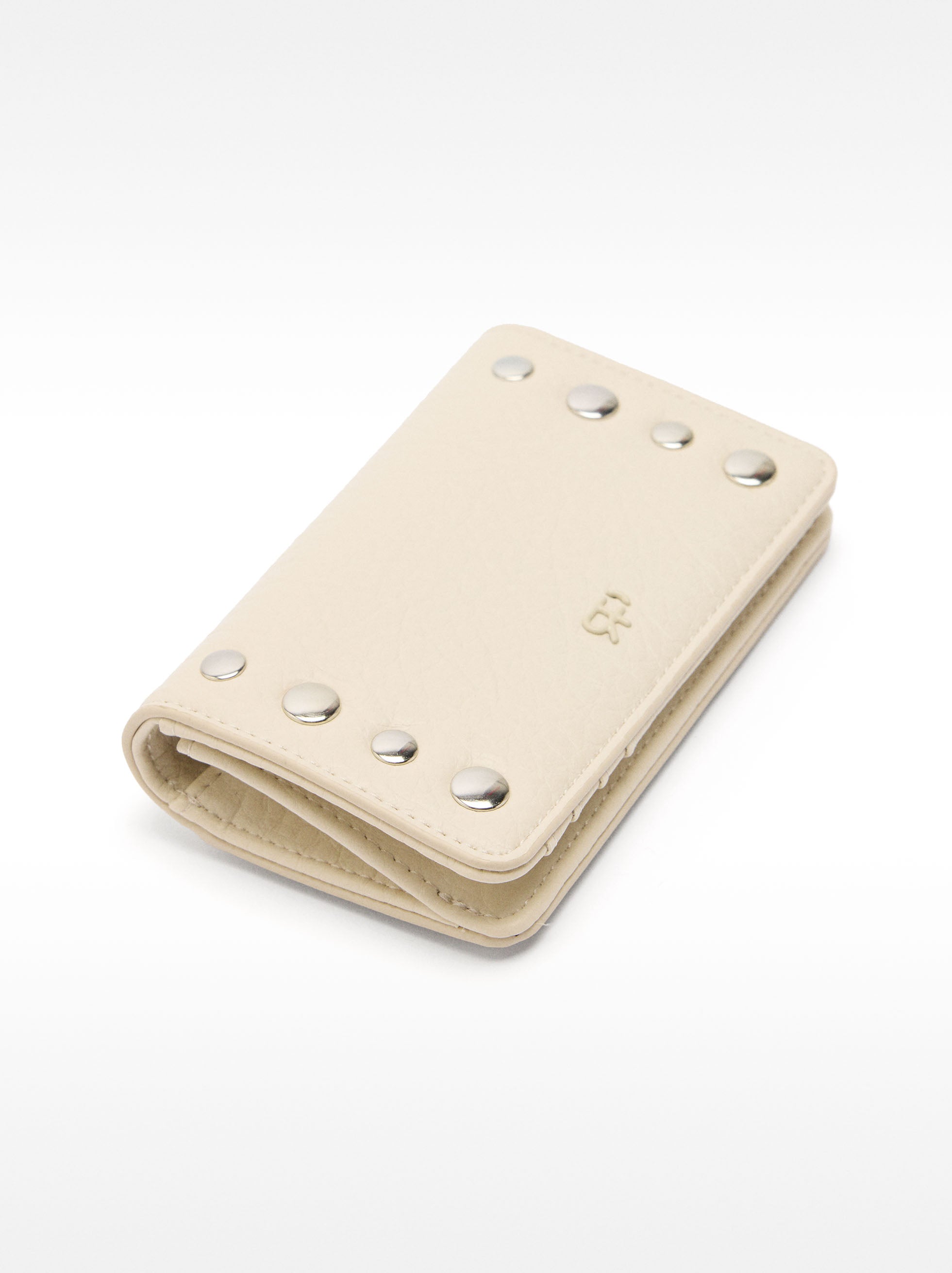 Tarjetero con textura y tachuelas en los laterales. Ranuras interiores y una exterior. Bolsillo con cierre de cremallera para monedas. Cierre con botón a presión.