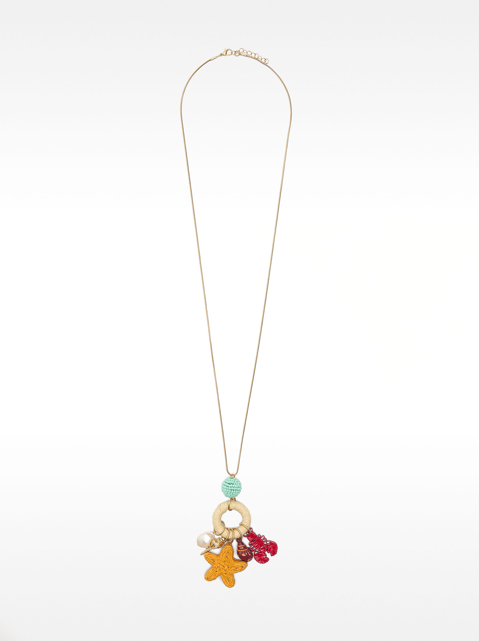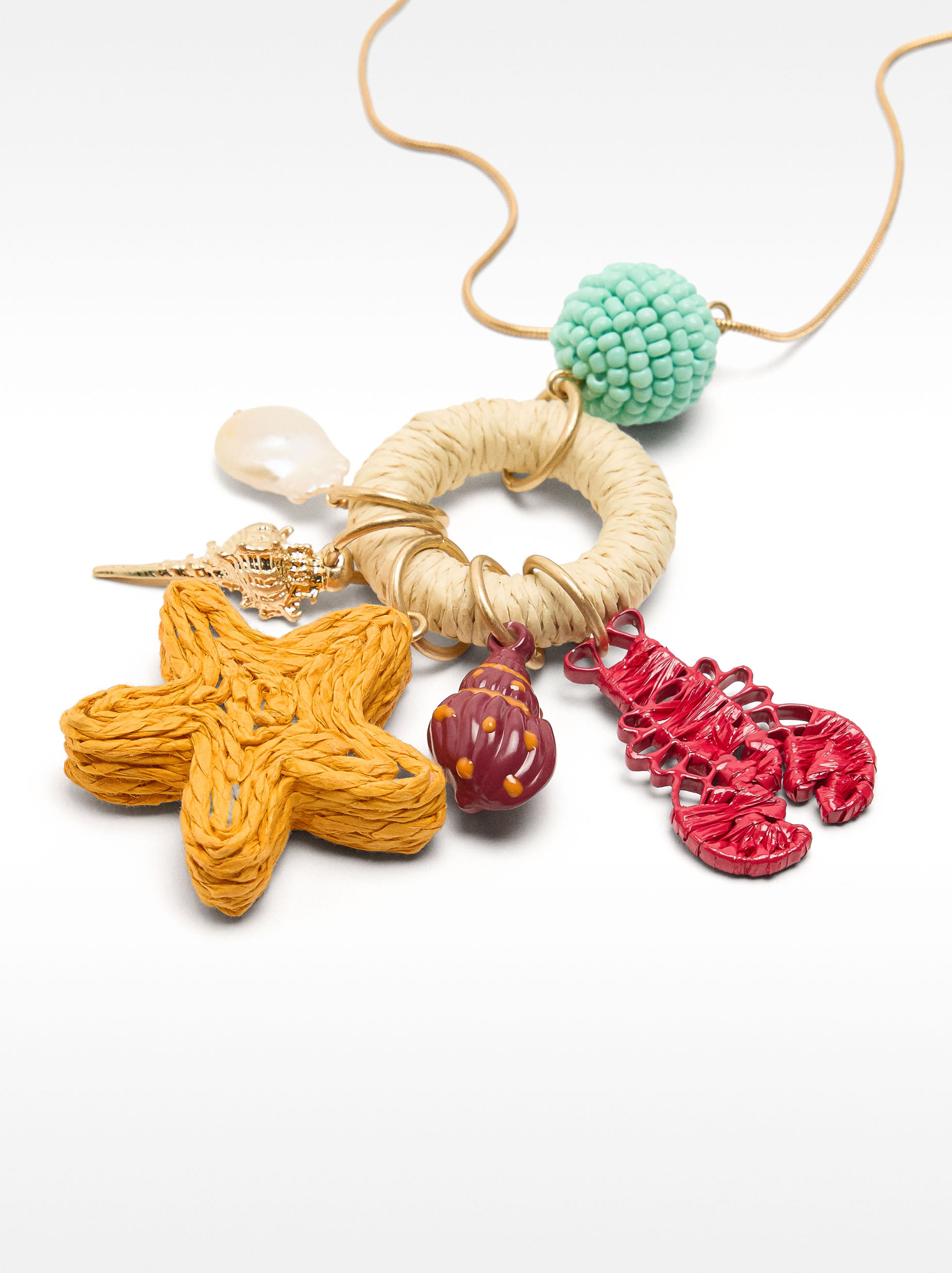 Collar largo con colgantes de rafia en forma de aro y estrella; langosta; conchas; esfera de cuentas y una perla de agua dulce. Acabado dorado.