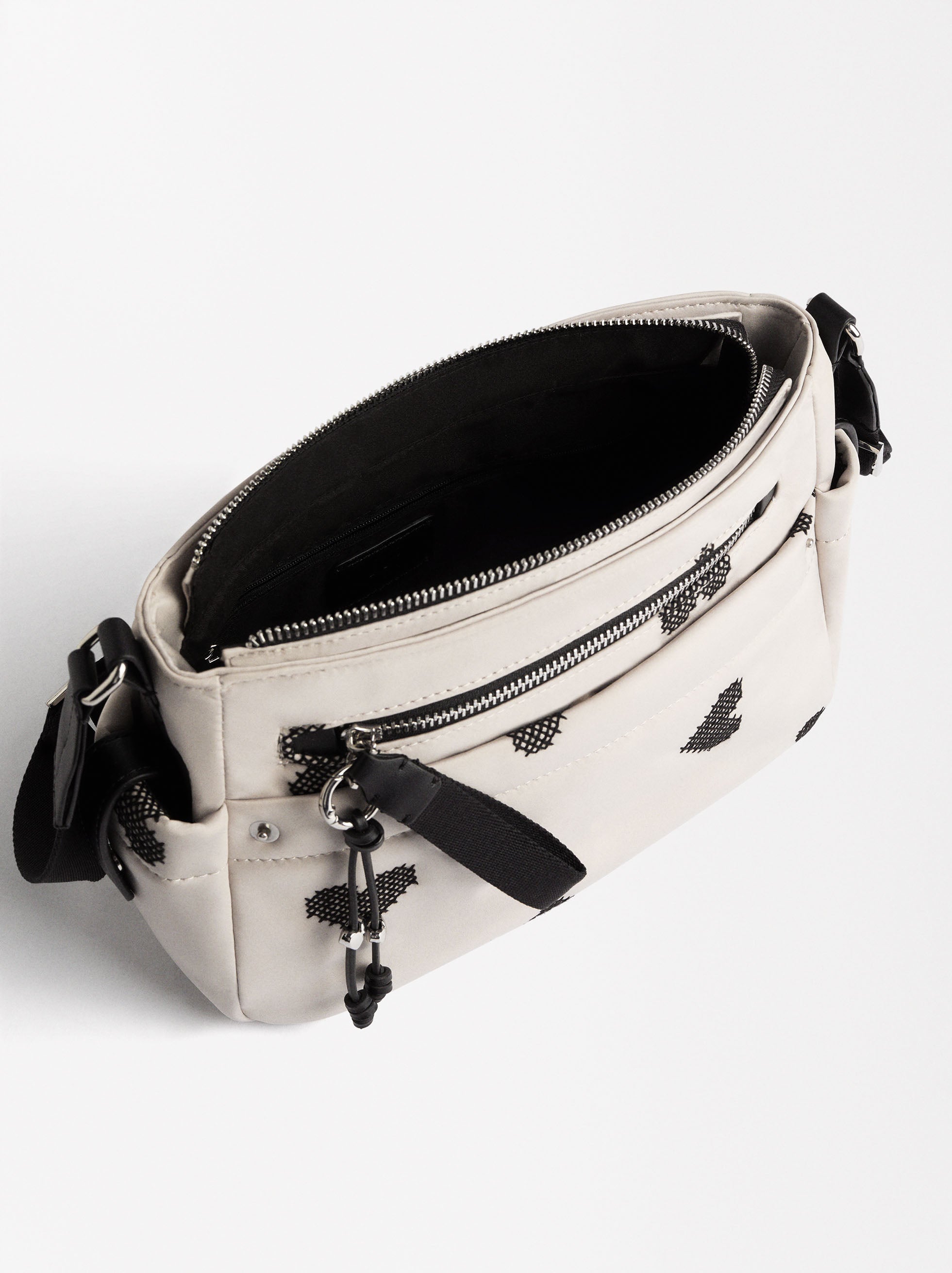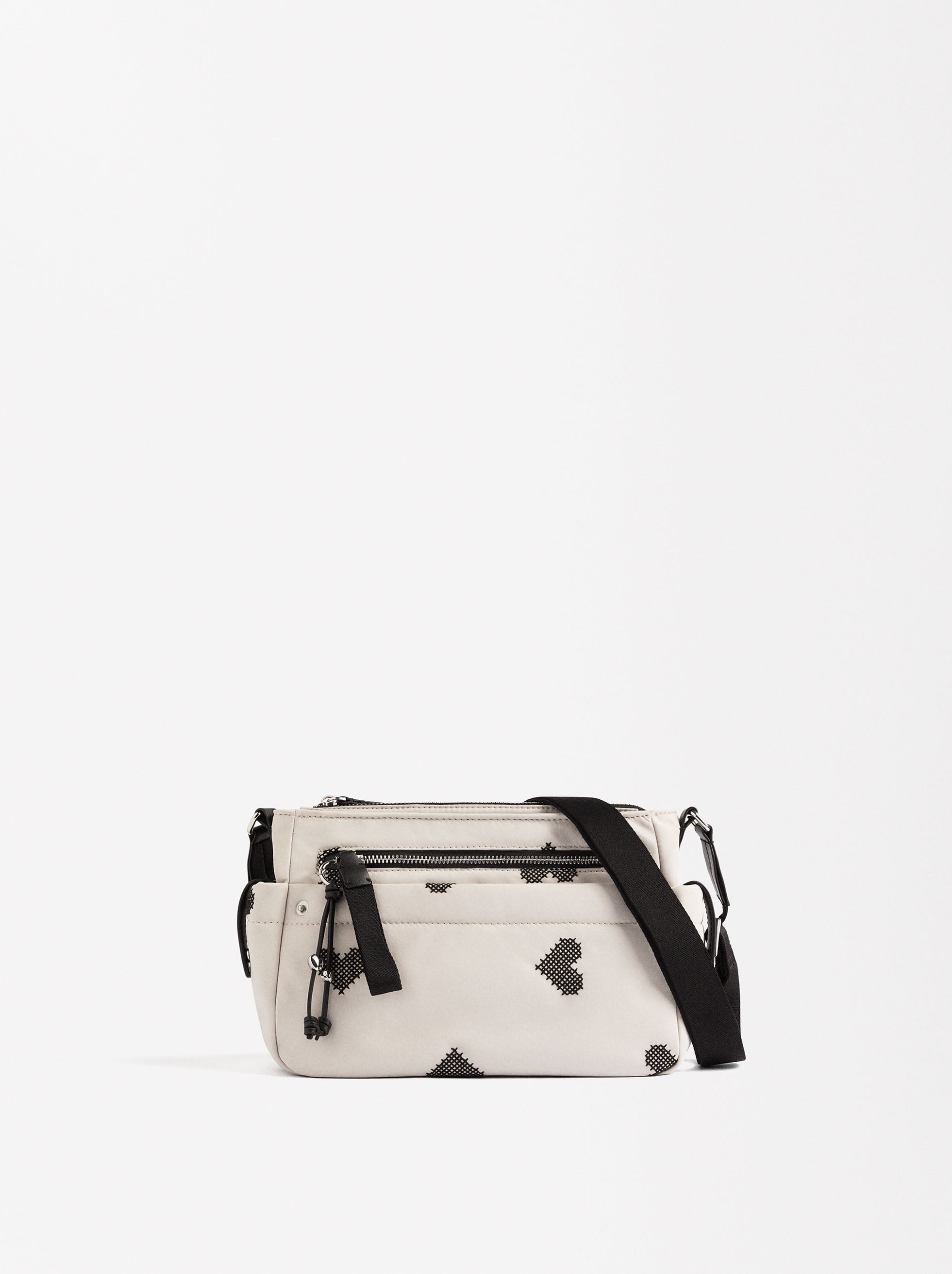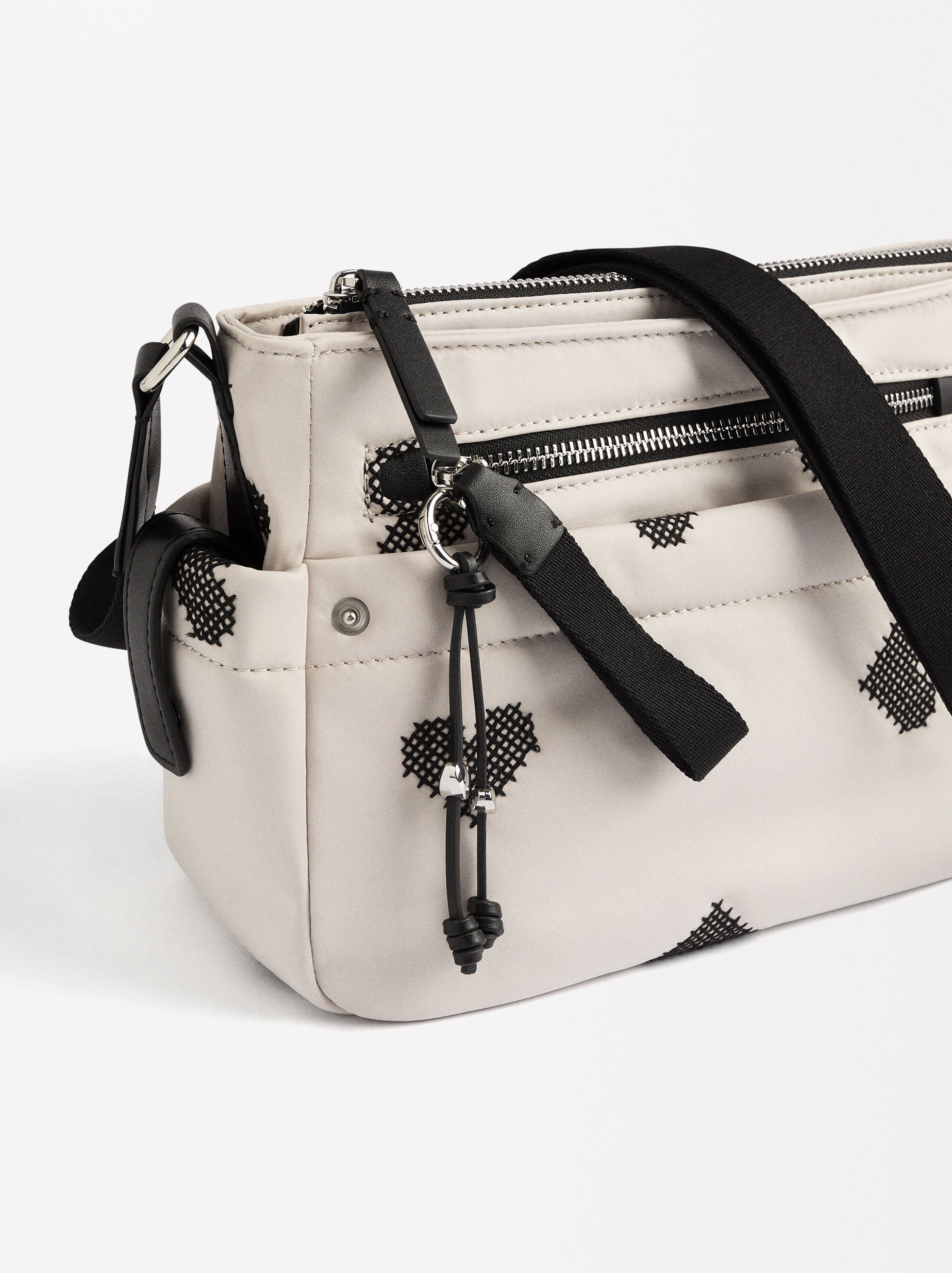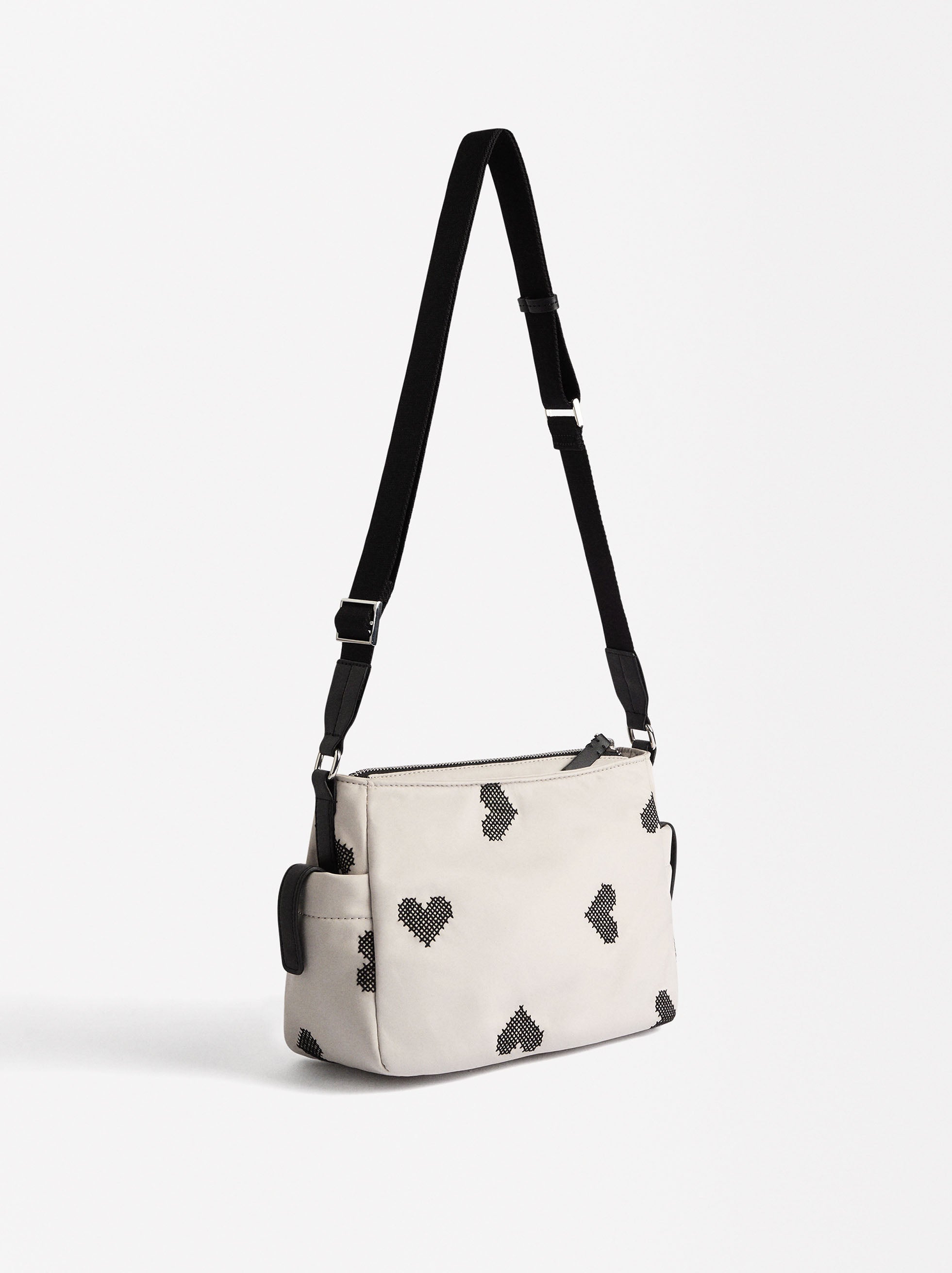 Bolso bandolera de nylon con bordado de corazones. Forro y bolsillo interior. Cierre de cremallera. Bolsillos exteriores. Asa fija y ajustable.