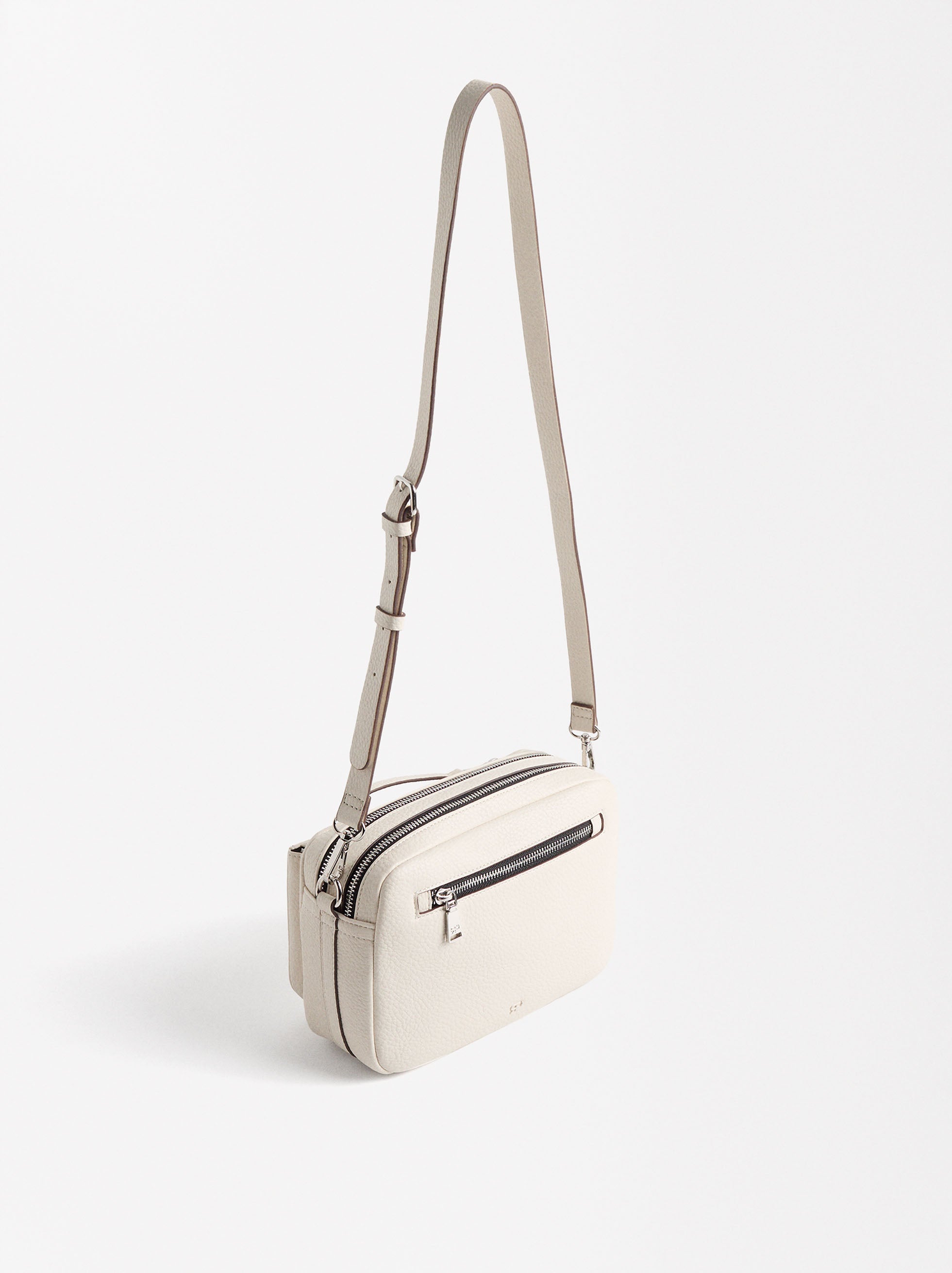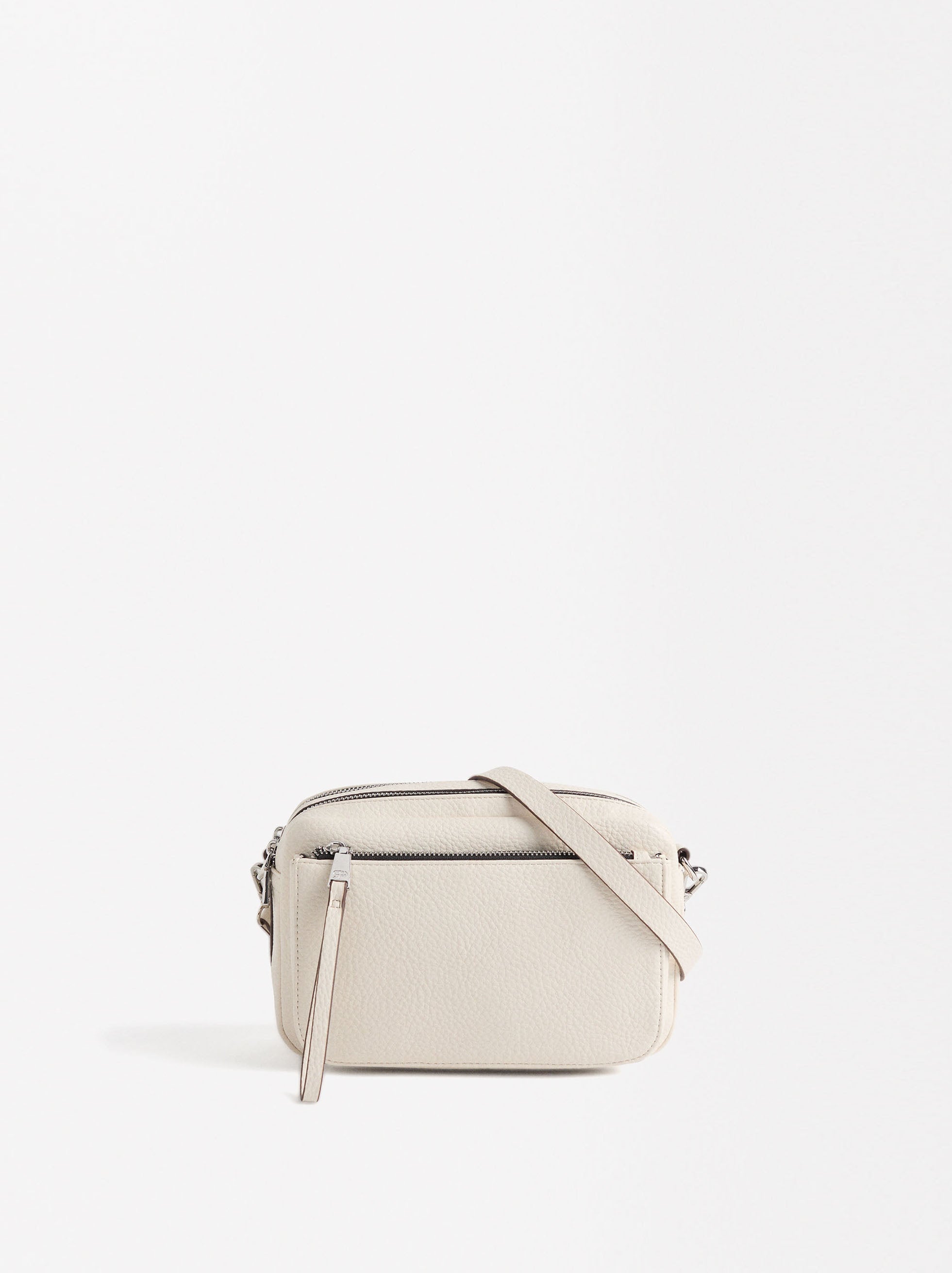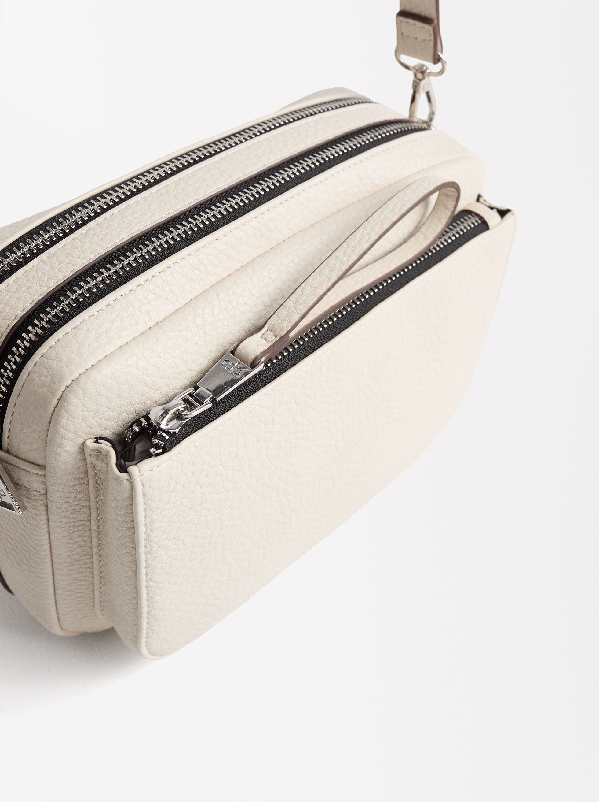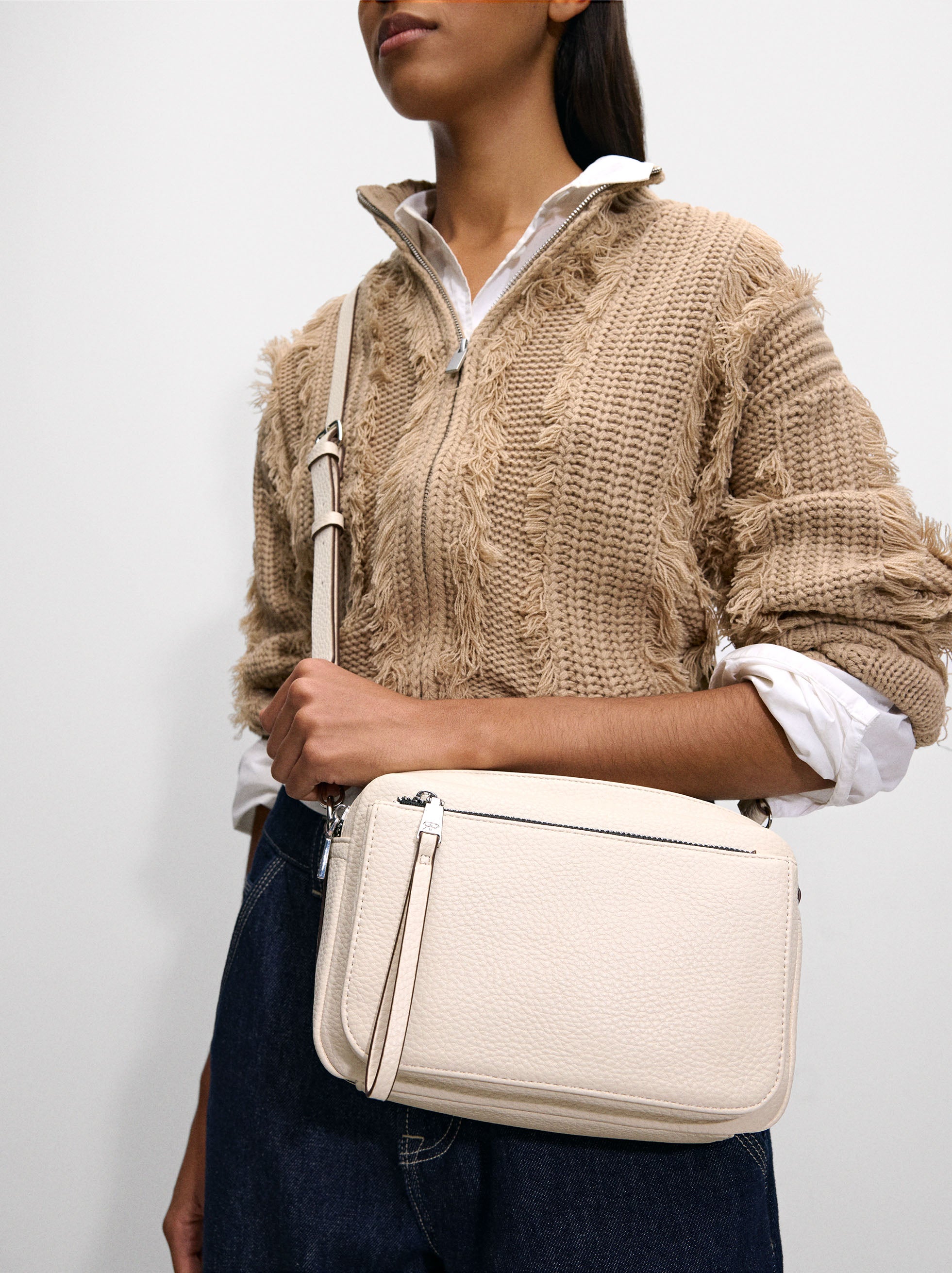 Bolso bandolera con textura. Doble cierre de cremallera. Bolsillo interior, en la parte frontal y trasera. Asa ajustable y removible.