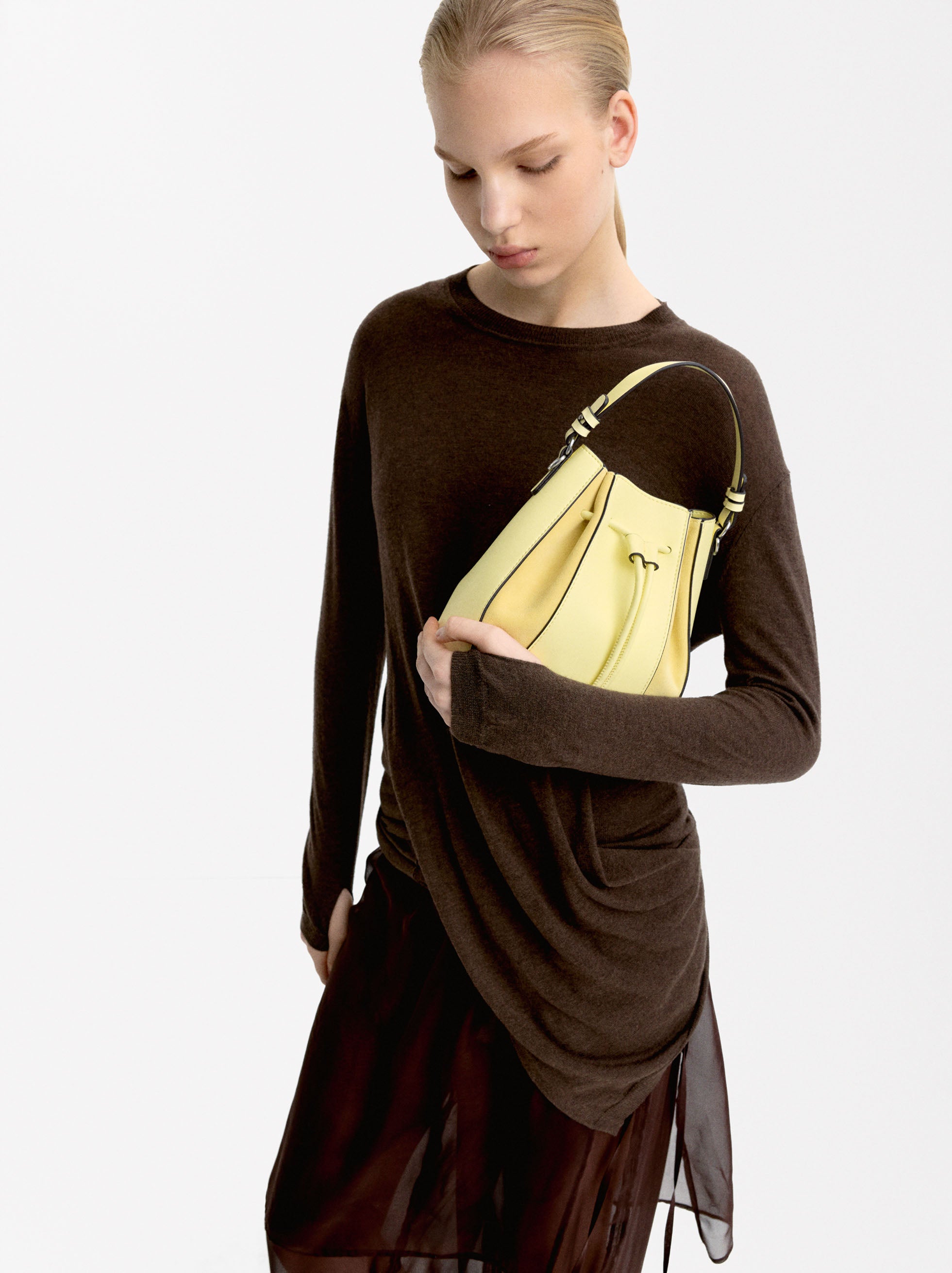 Cartera bombonera con segmentos en piel. Cierre con fruncido. Asa de mano fija. Asa bandolera ajustable y removible.