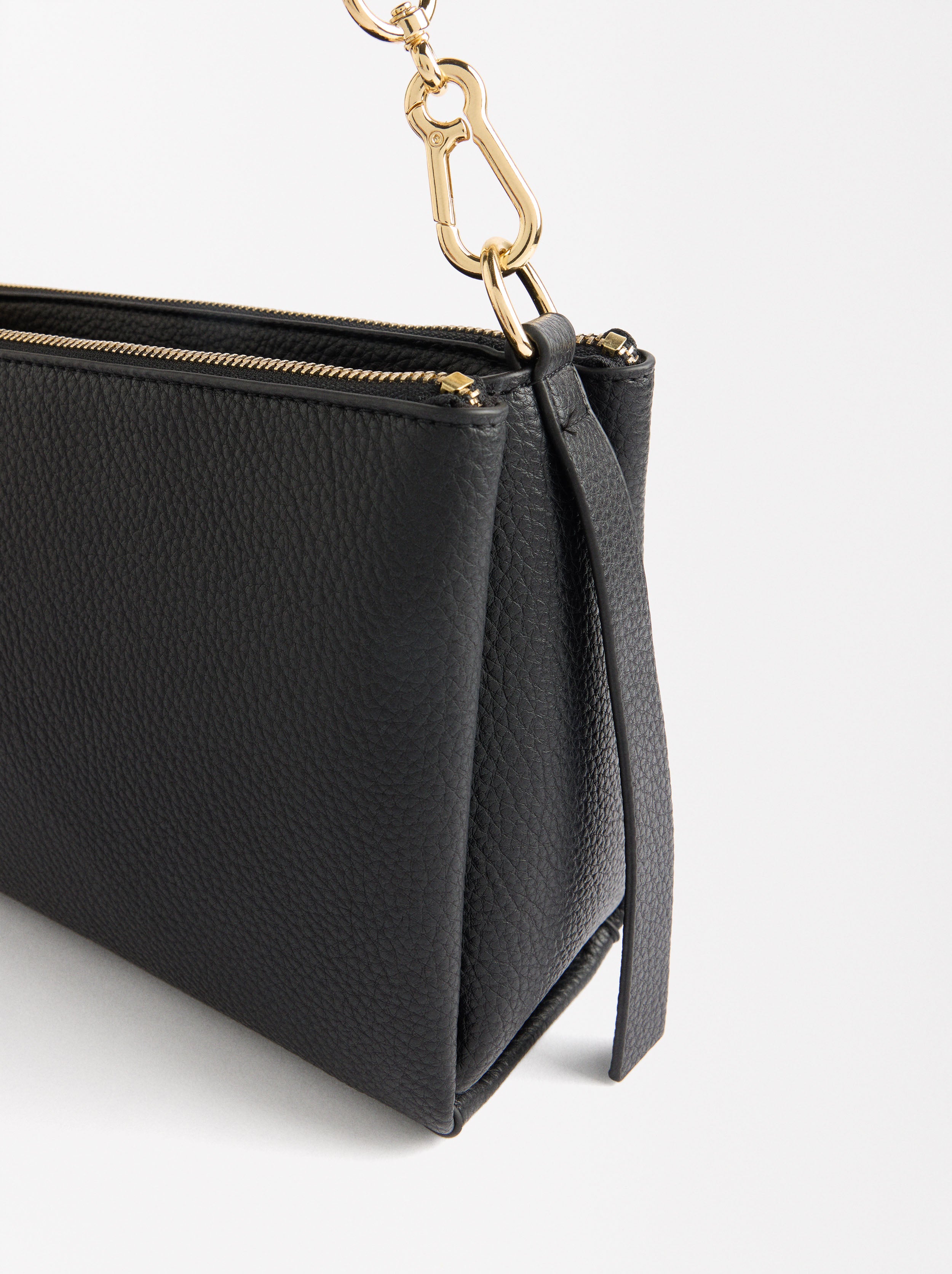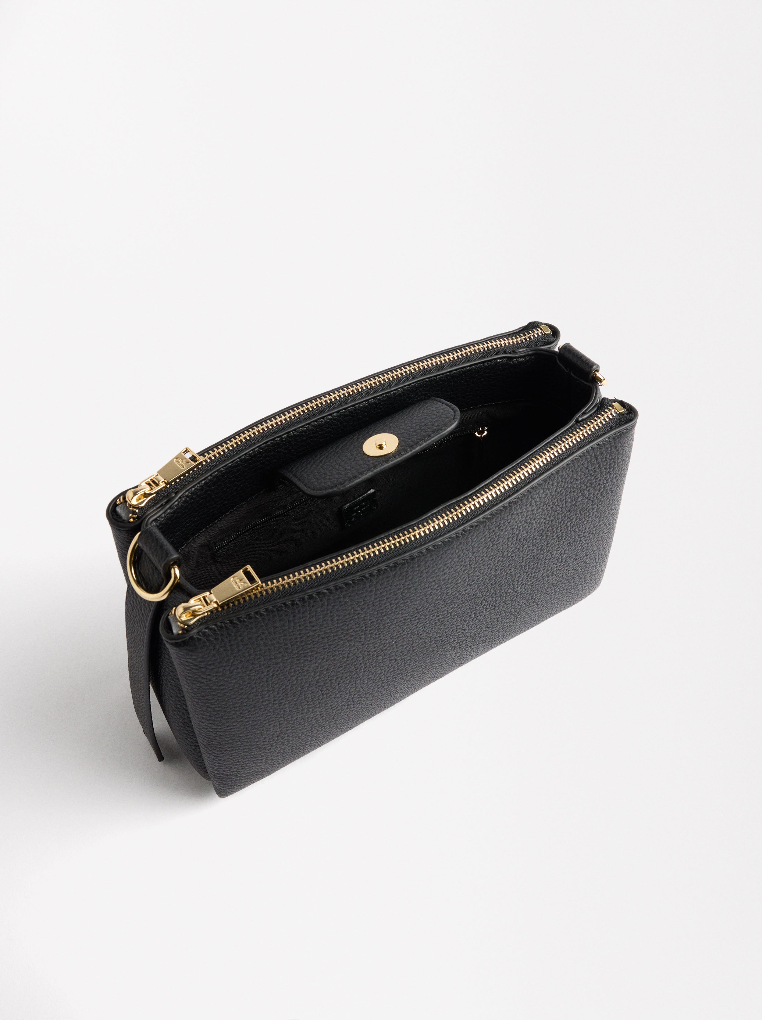 Bolso de hombro con bandolera y textura. Forro y bolsillo interior. Cierre principal con imán. Compartimentos laterales con cierre de cremallera. Asa de hombro removible. Asa bandolera ajustable y removible.