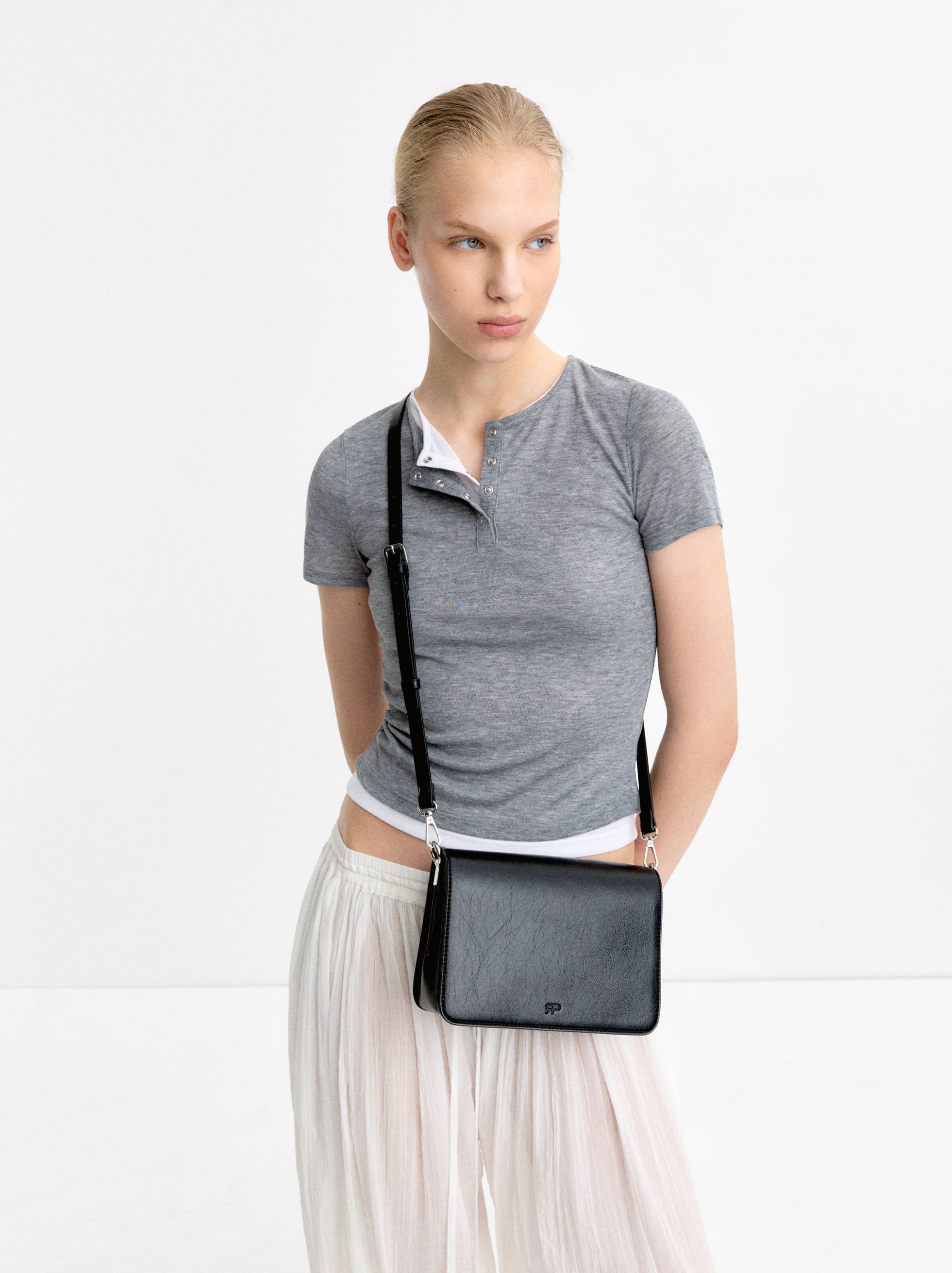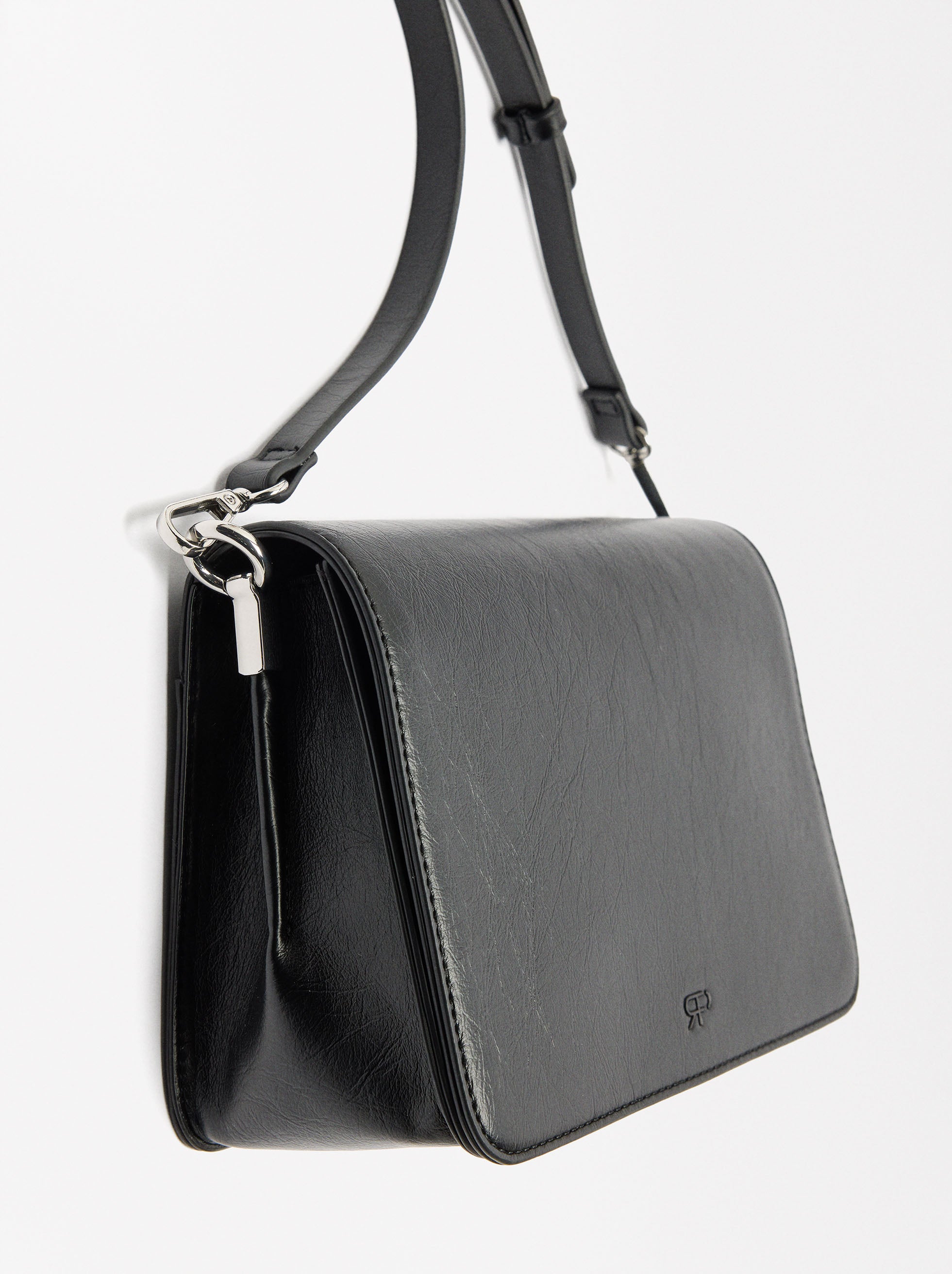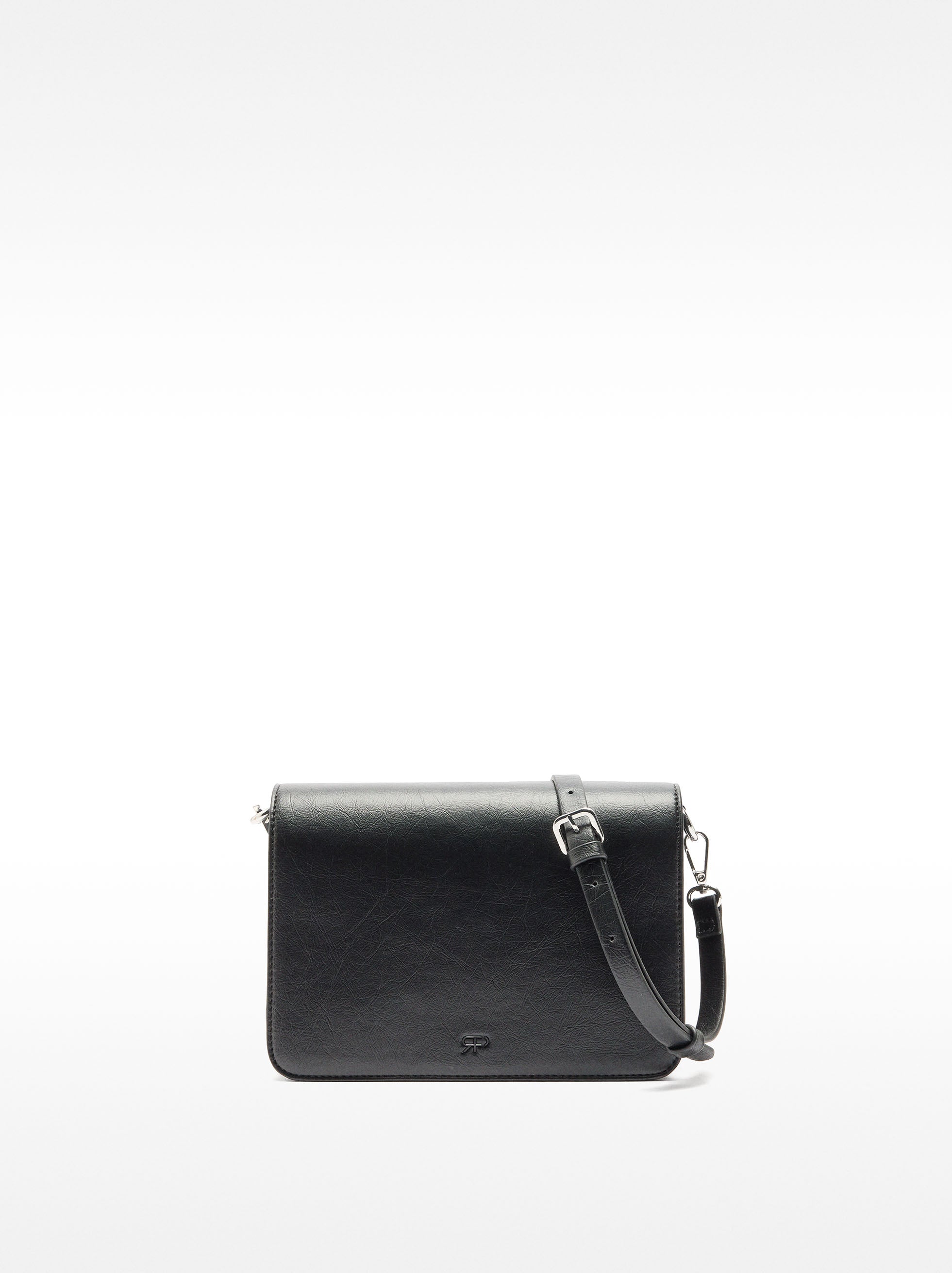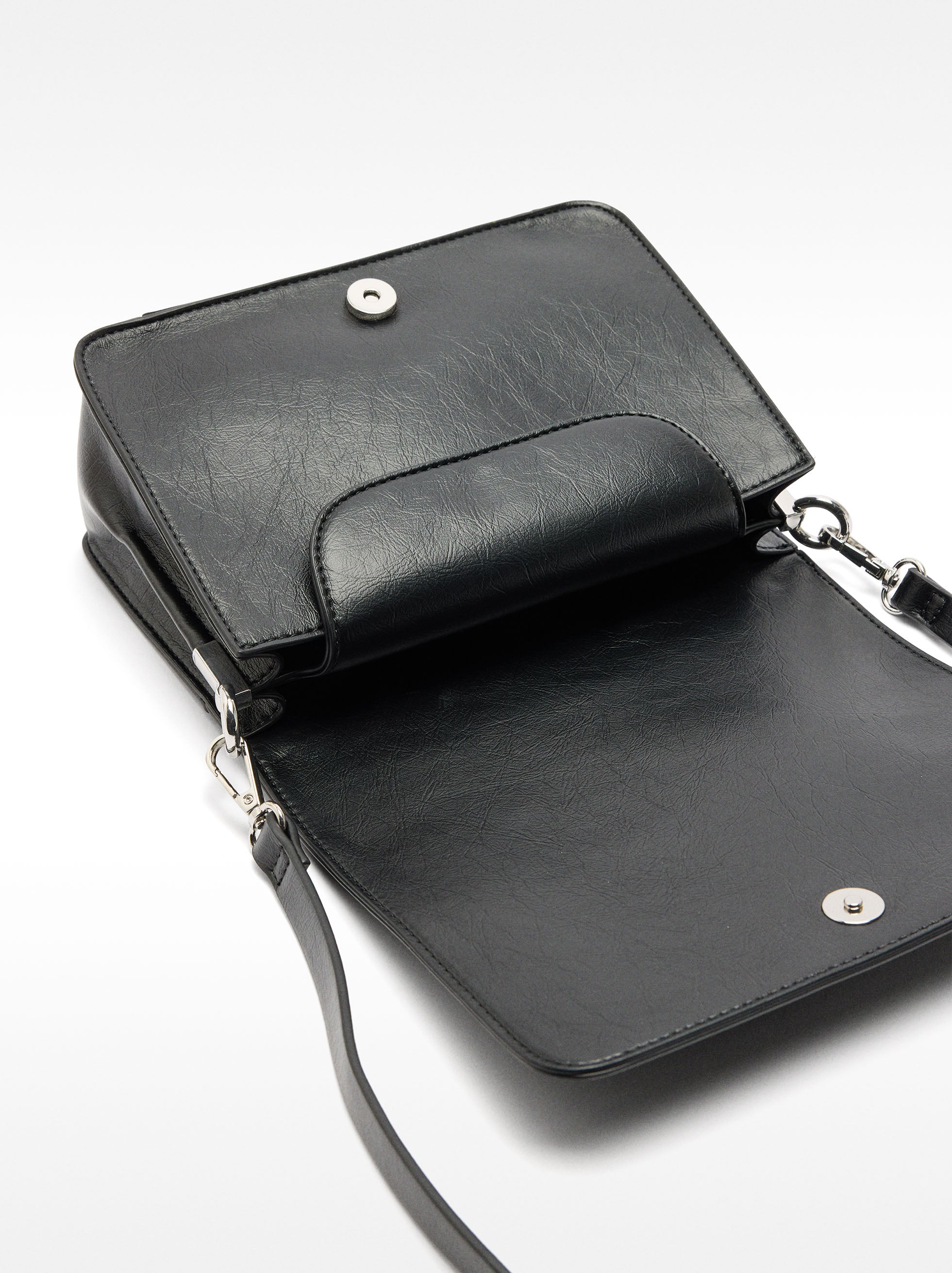 Cartera de hombro con cierre de solapa imantado. Dos compartimentos interiores. Forro interior. Efecto craquelado. Asa de hombro extraíble. Asa bandolera ajustable y extraíble.