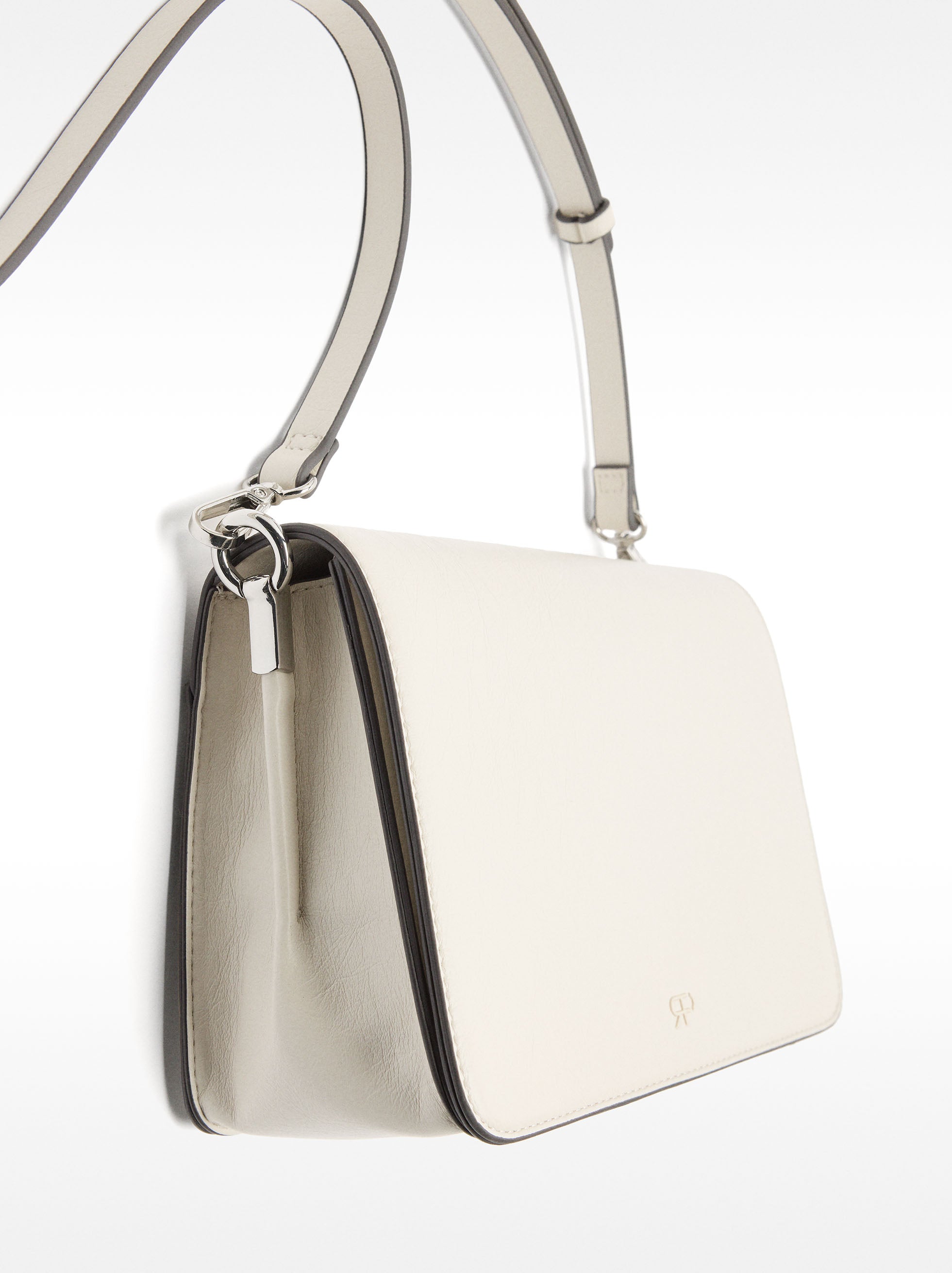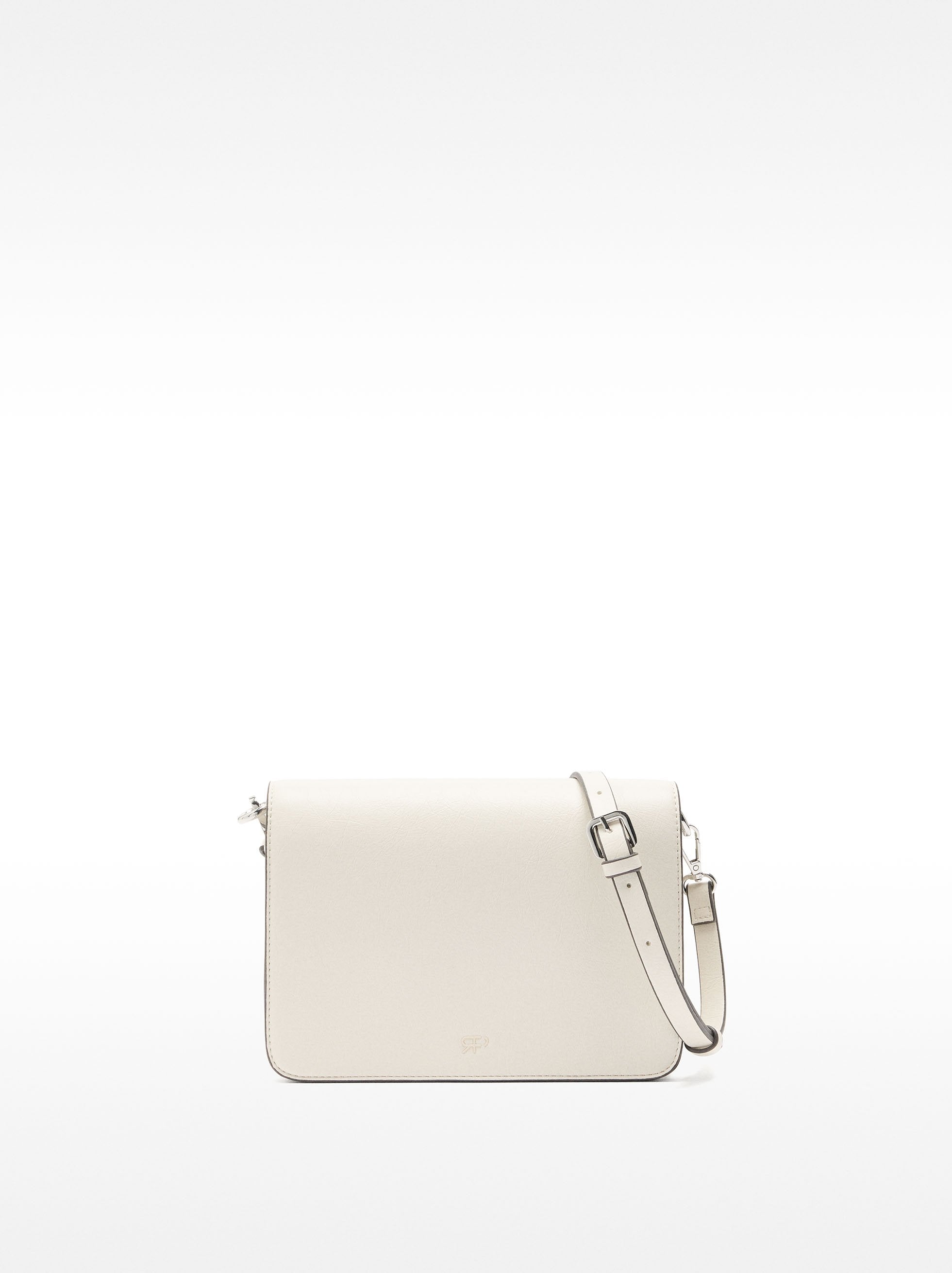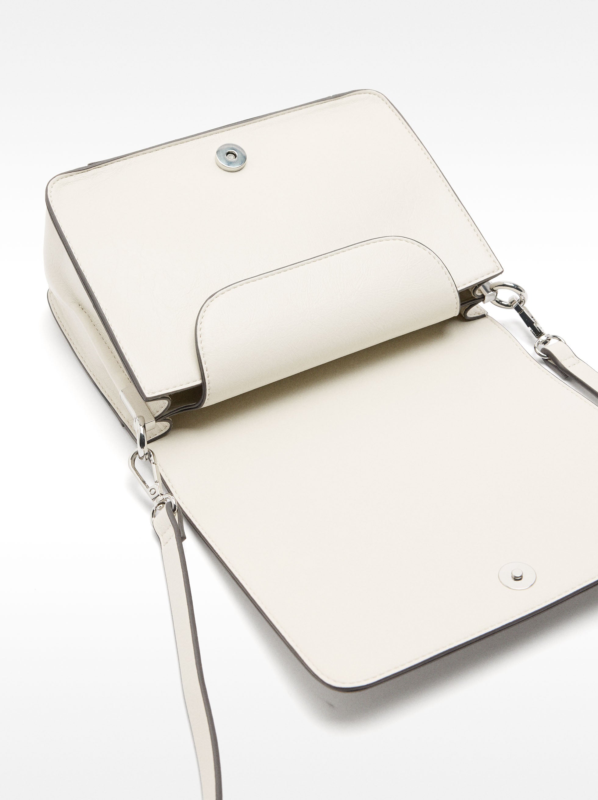 Cartera de hombro con cierre de solapa imantado. Dos compartimentos interiores. Forro interior. Efecto craquelado. Asa de hombro extraíble. Asa bandolera ajustable y extraíble.