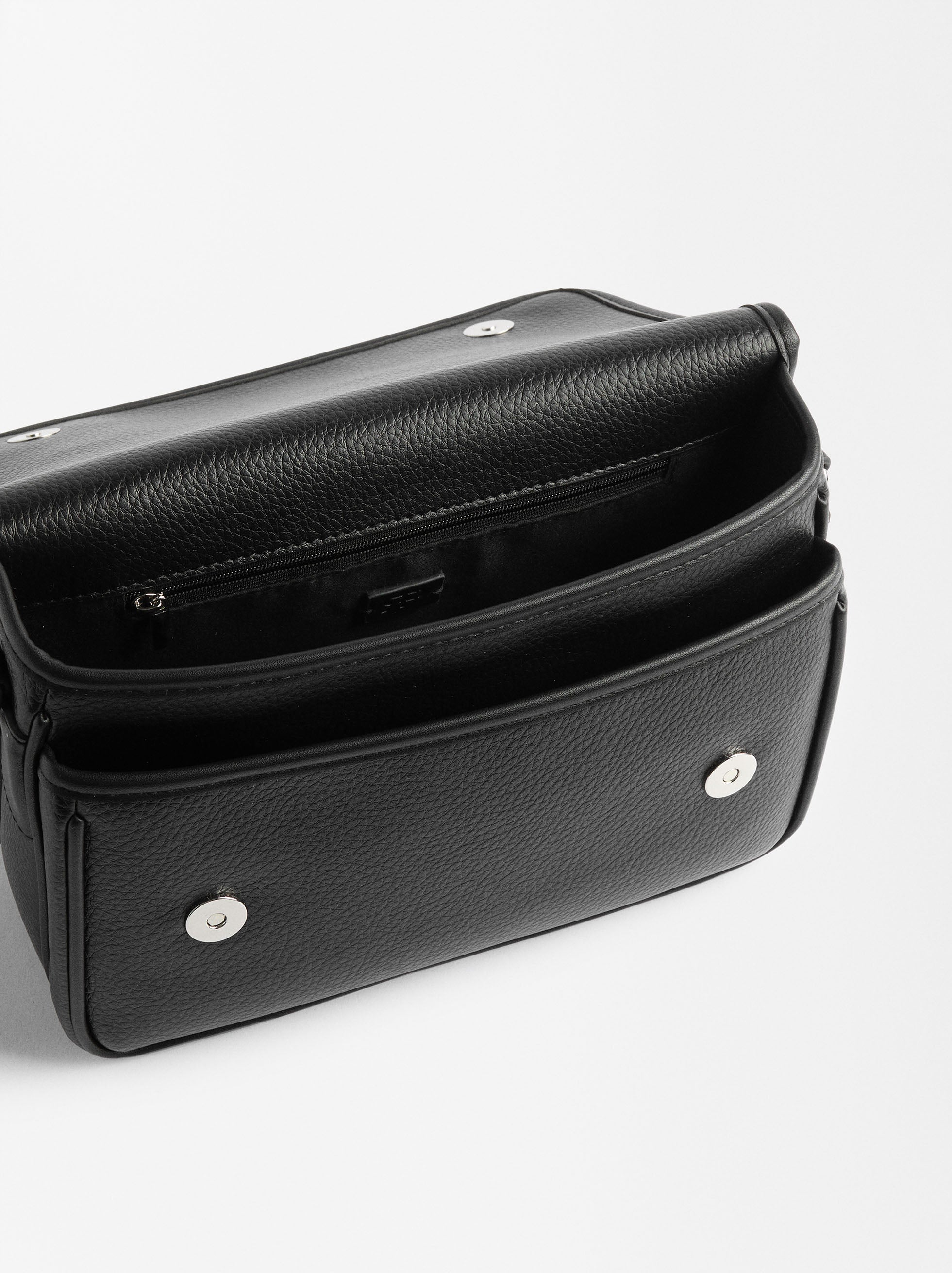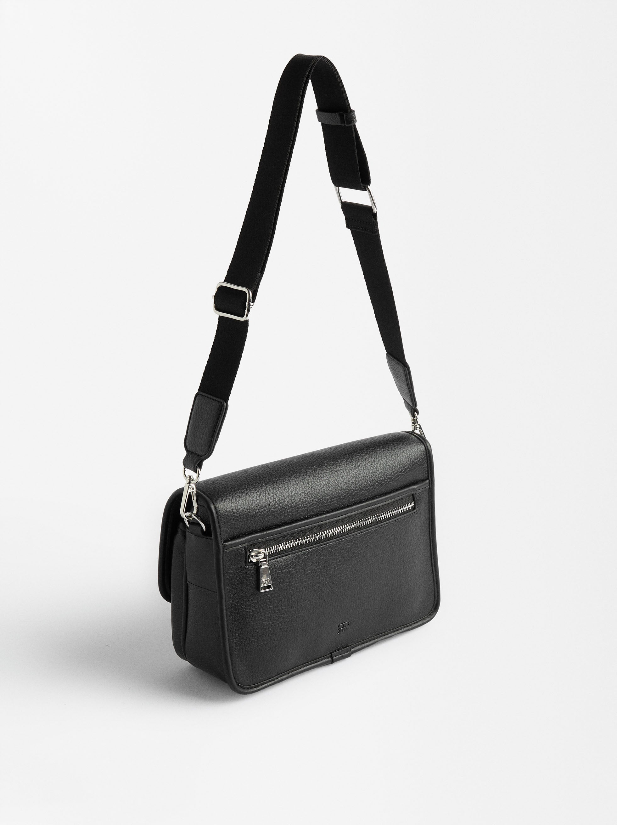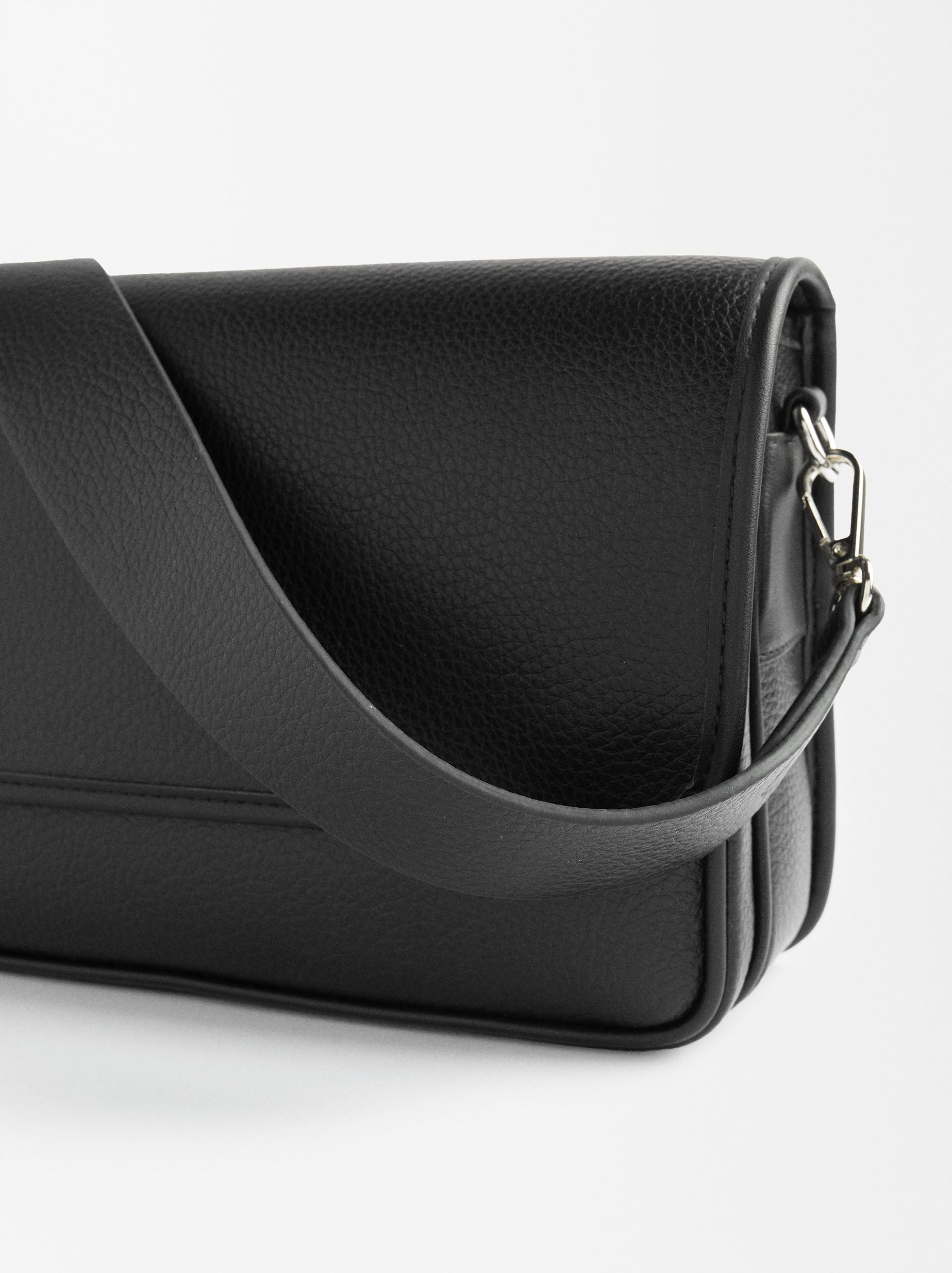 Bolsa de hombro con textura. Dos compartimentos. Cierre de solapa con imán. Bolsillo y forro interior. Bolsillo exterior. Asa de hombro removible. Asa bandolera ajustable y removible.