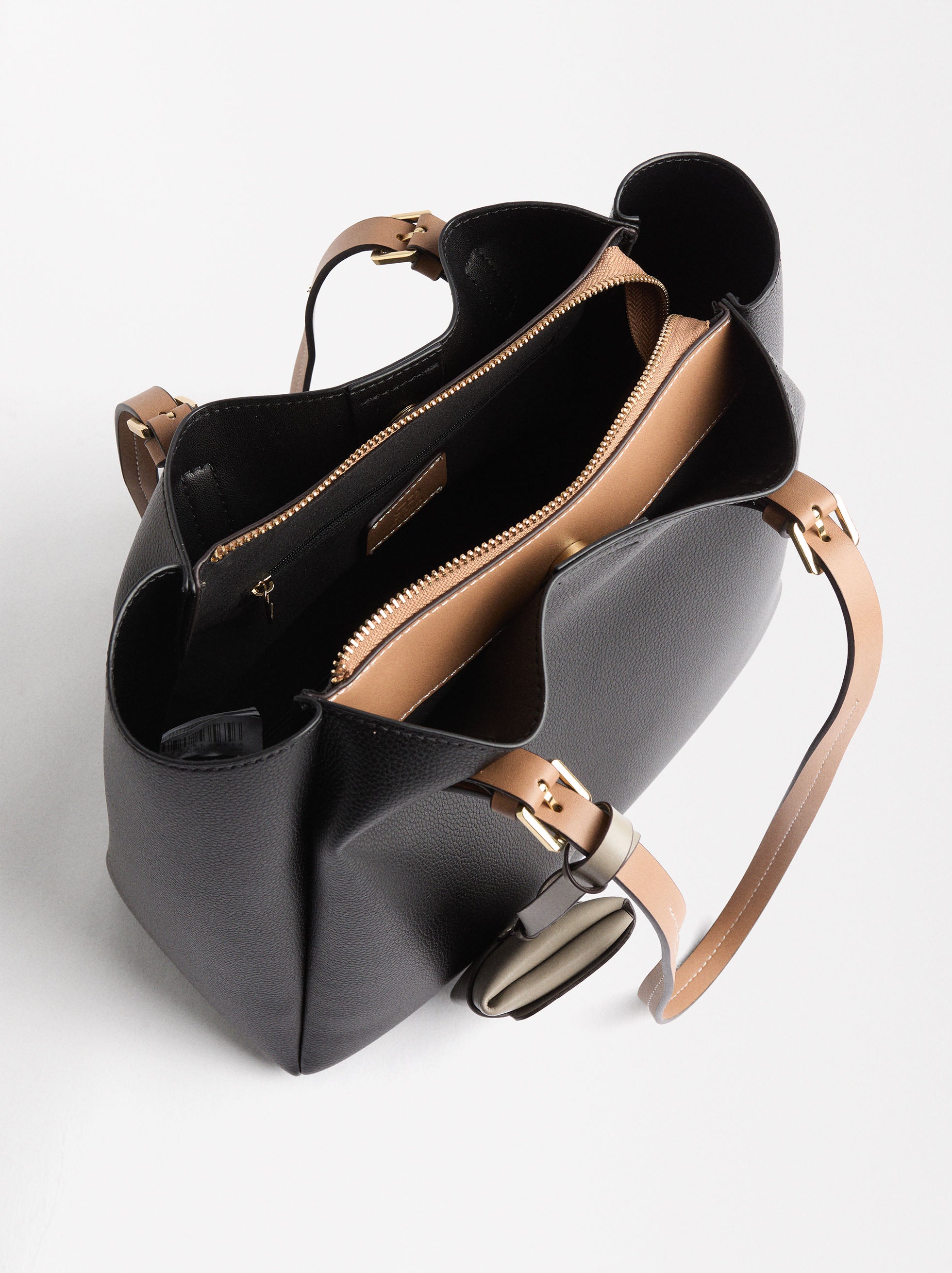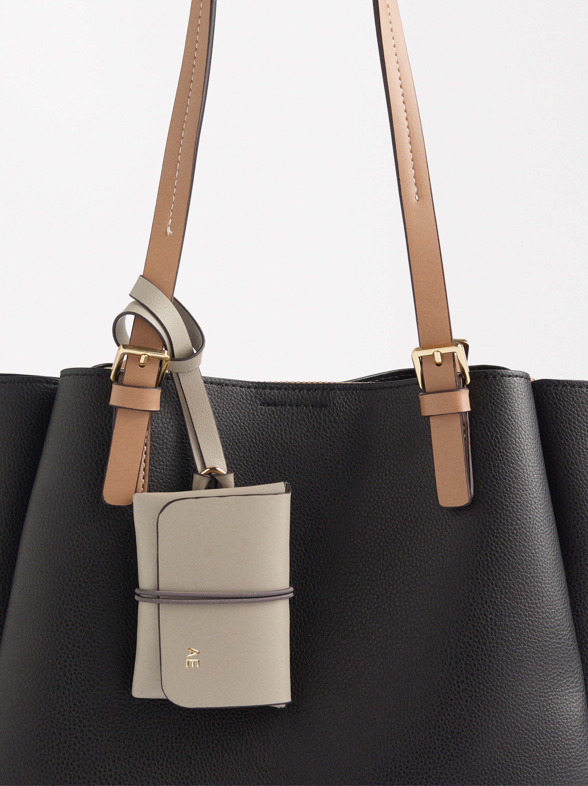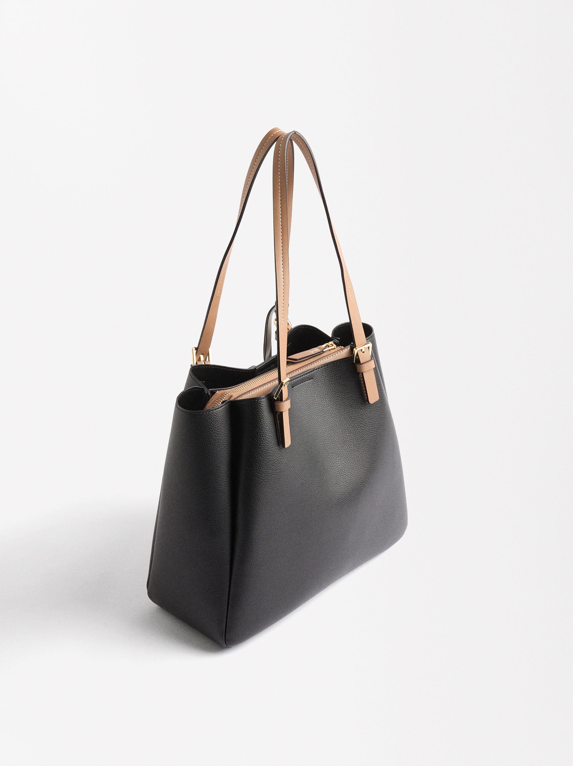 Bolso tote grande con textura. Compartimento central con cierre de cremallera. Forro y bolsillo interior. Compartimentos laterales con cierre magnético. Asas fijas para el hombro. Colgante personalizable.
