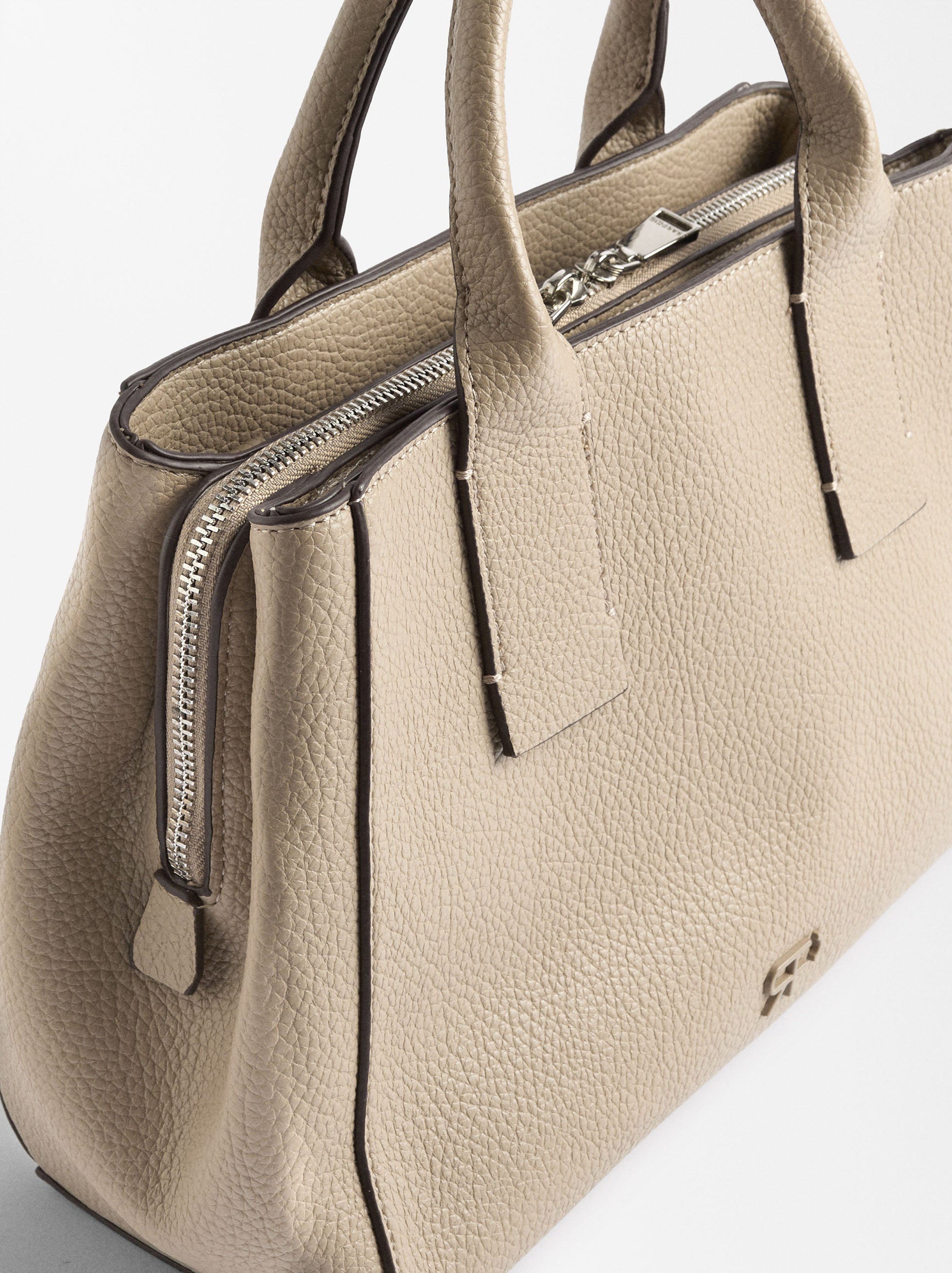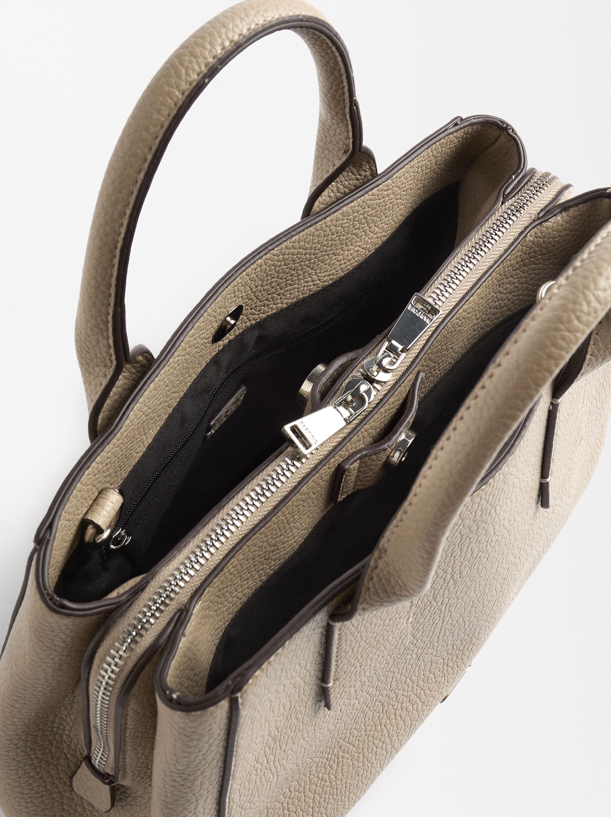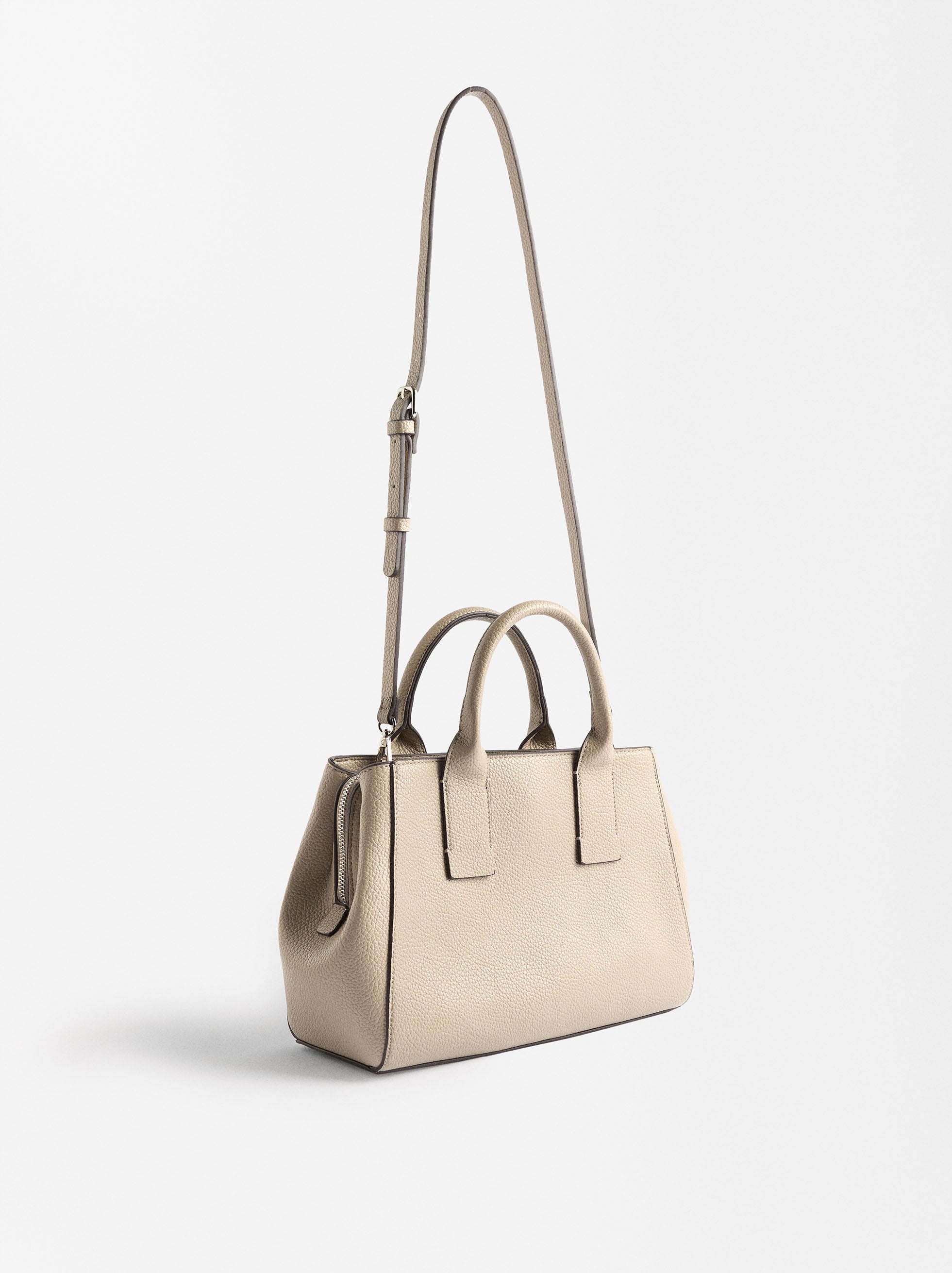 Bolso tote grande con textura y asa bandolera ajustable y extraíble. Asas de mano fijas. División central, bolsillo y forro interior; cierre de cremallera. Compartimentos laterales con cierre magnético.