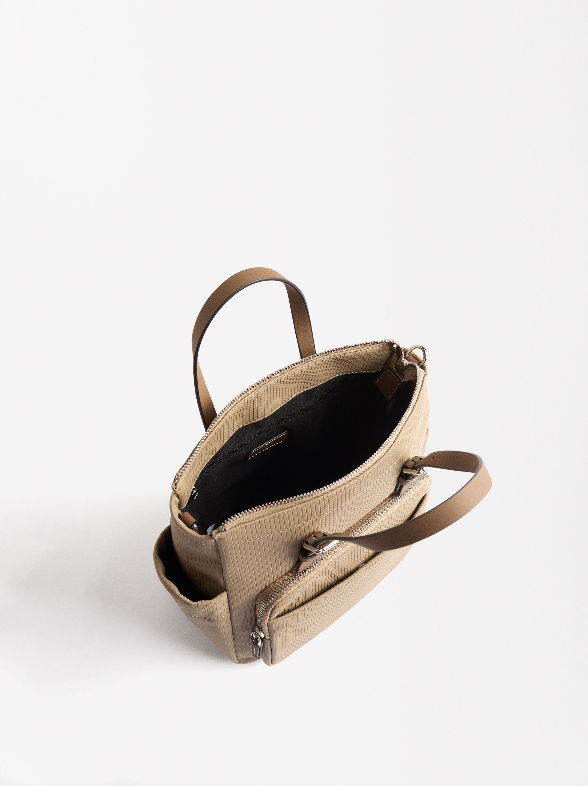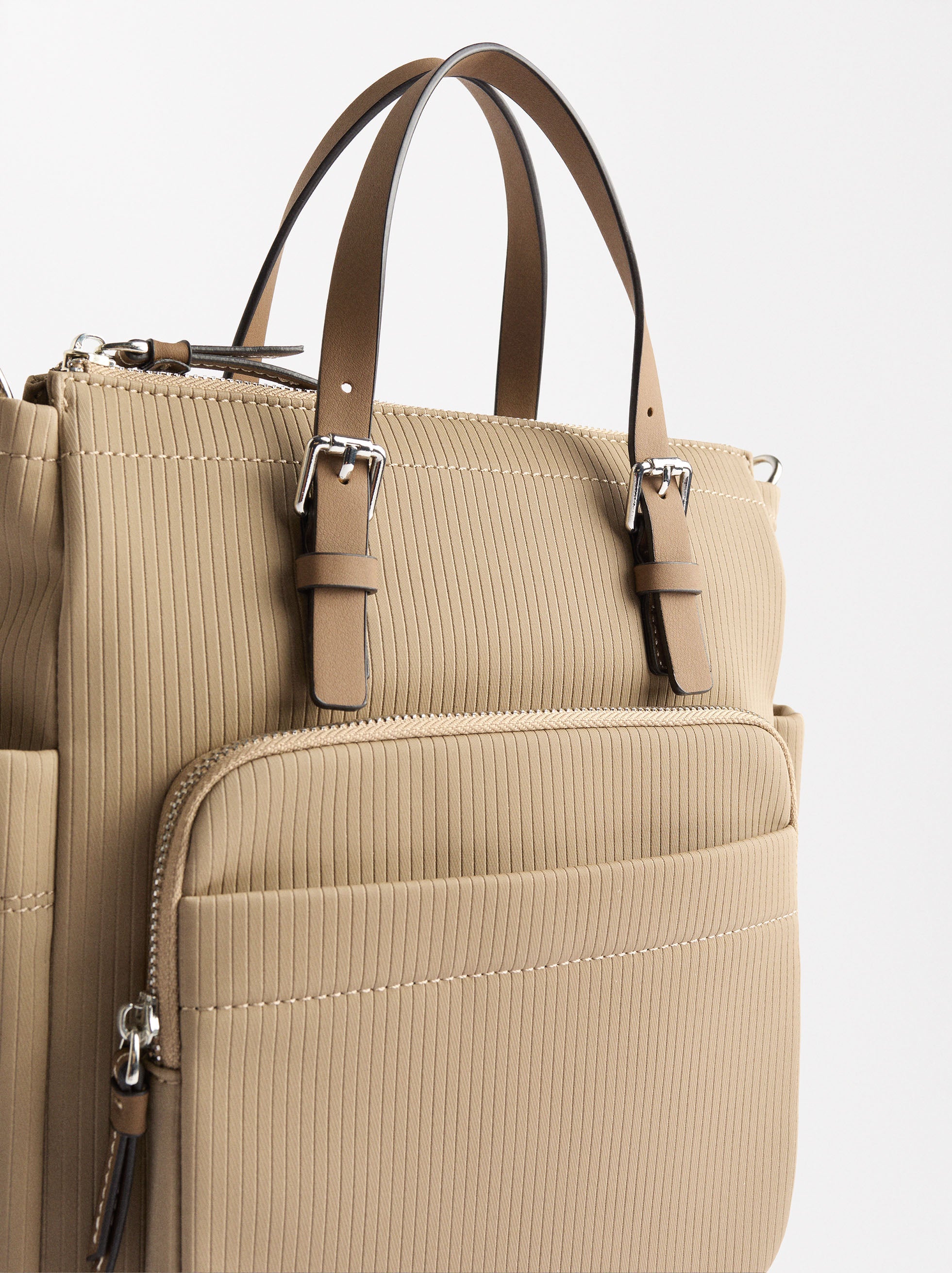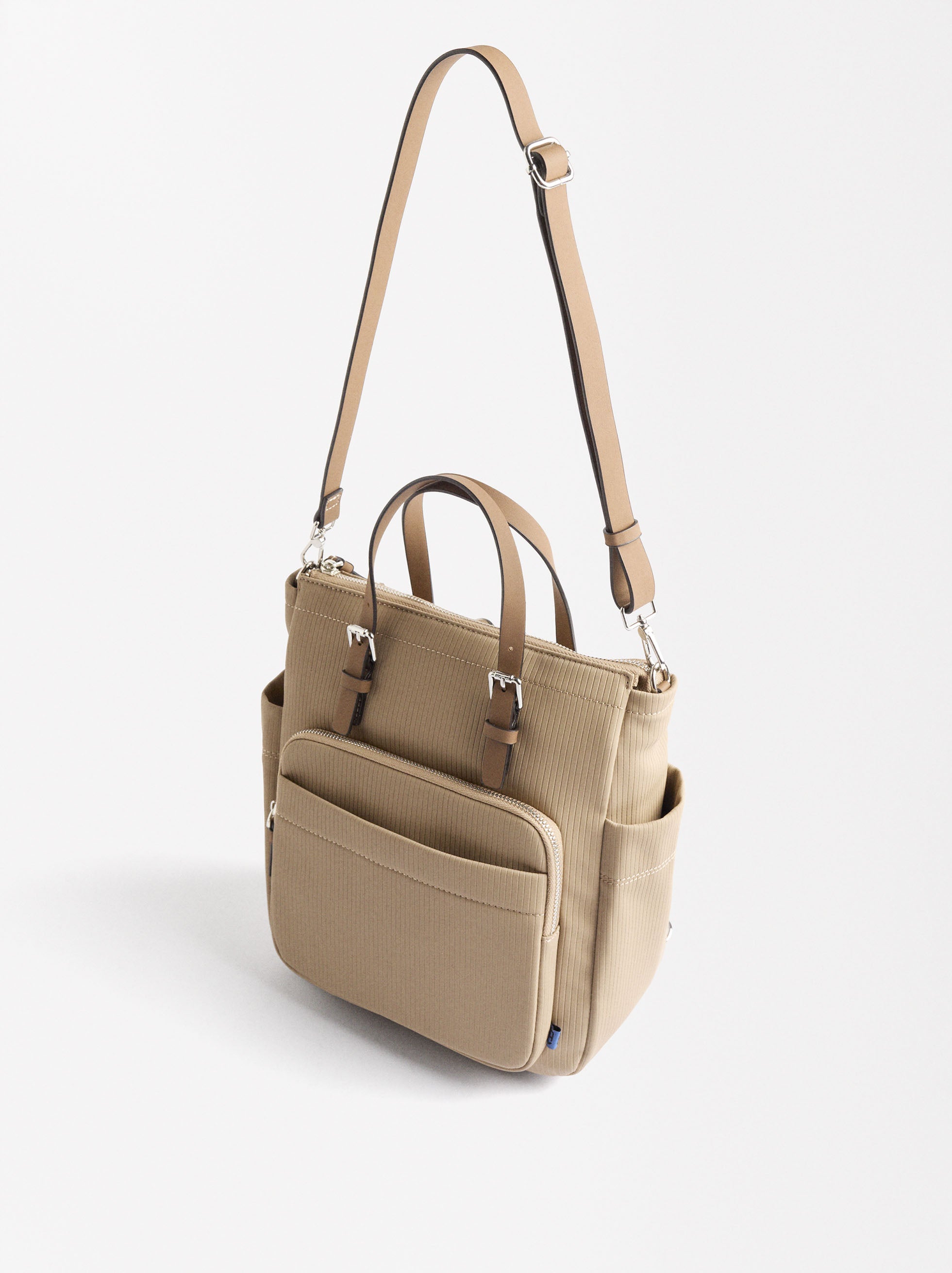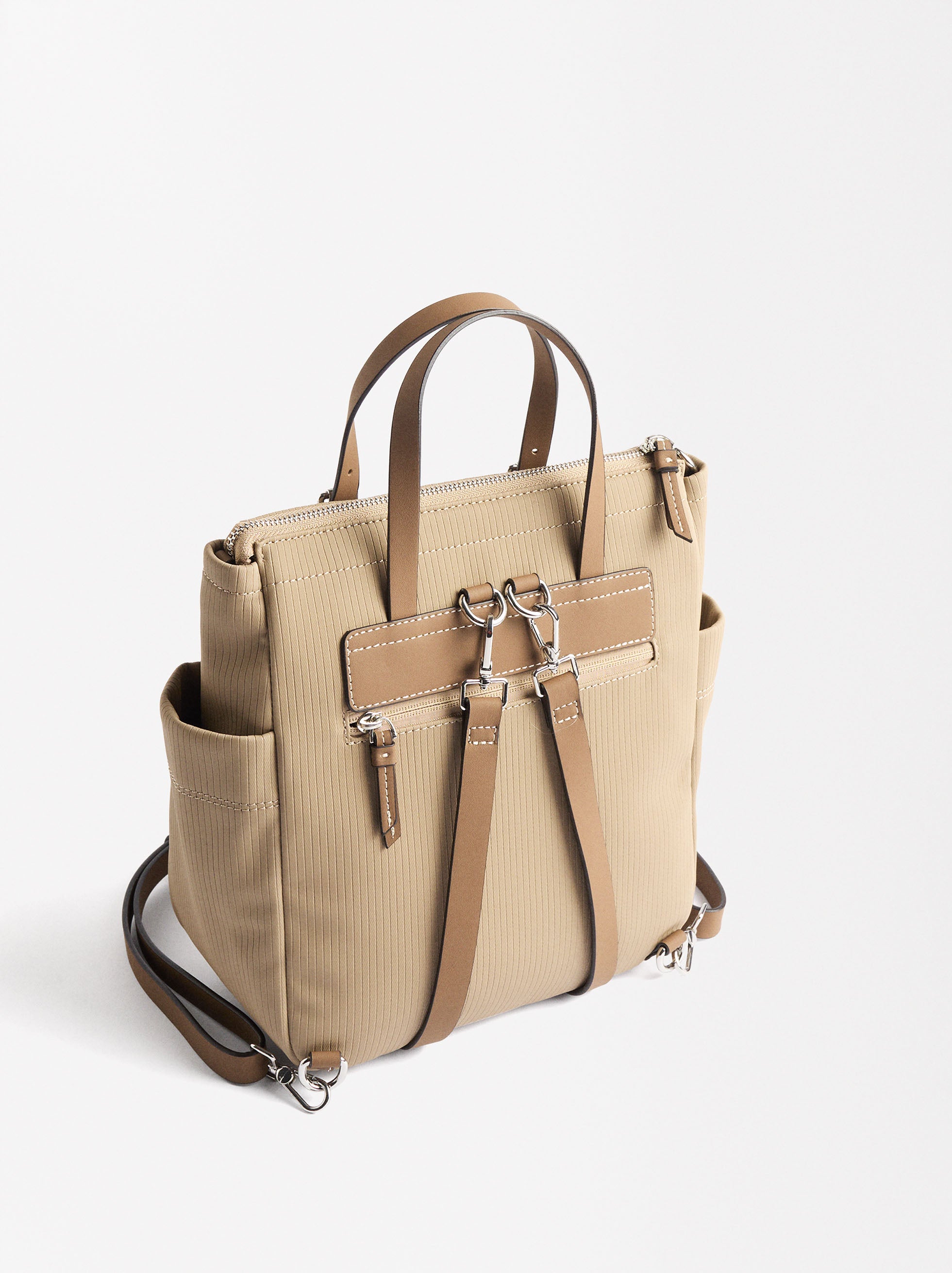 Mochila con textura canalada. Asas multifunción ajustables y removibles: asas de mano; asa bandolera; asas posteriores. Forro y bolsillo interior. Bolsillos laterales. Bolsillo frontal y posterior con cierre de cremallera.
