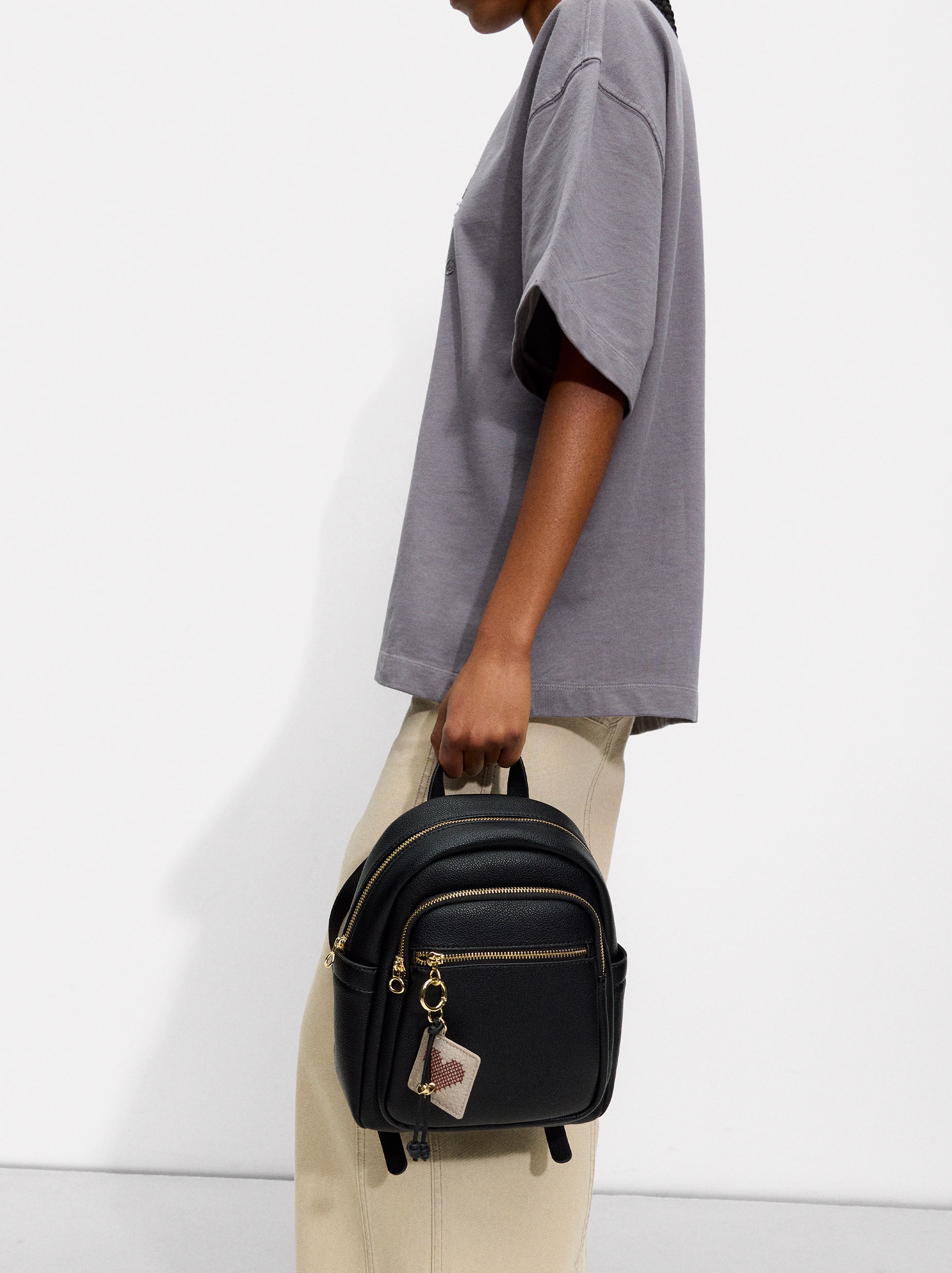 Mochila básica con textura. Forro y bolsillo interior. Colgante de corazón removible. Cierres de cremallera. Bolsillos exteriores. Asa de mano fija. Asas posteriores fijas y ajustables.