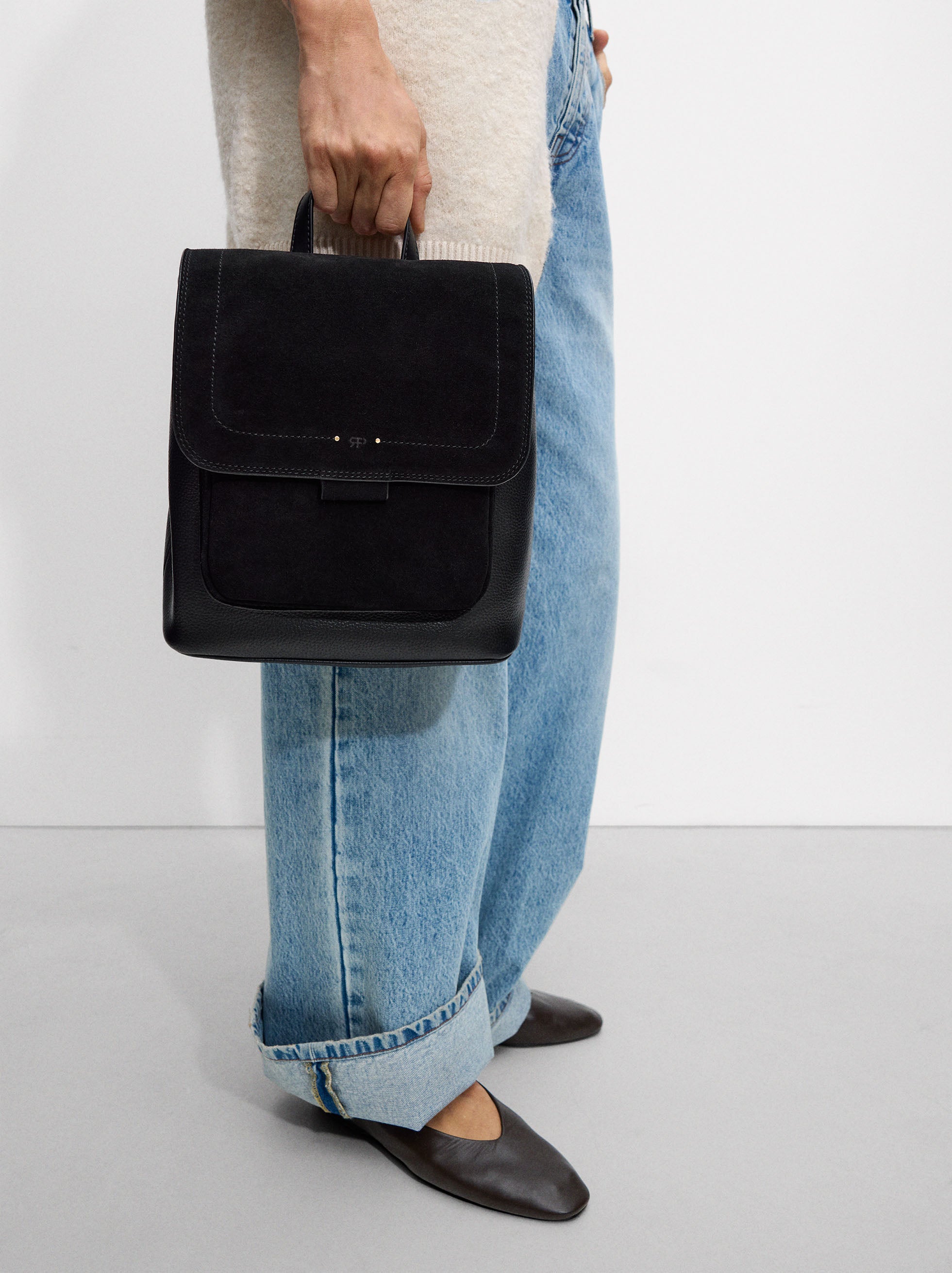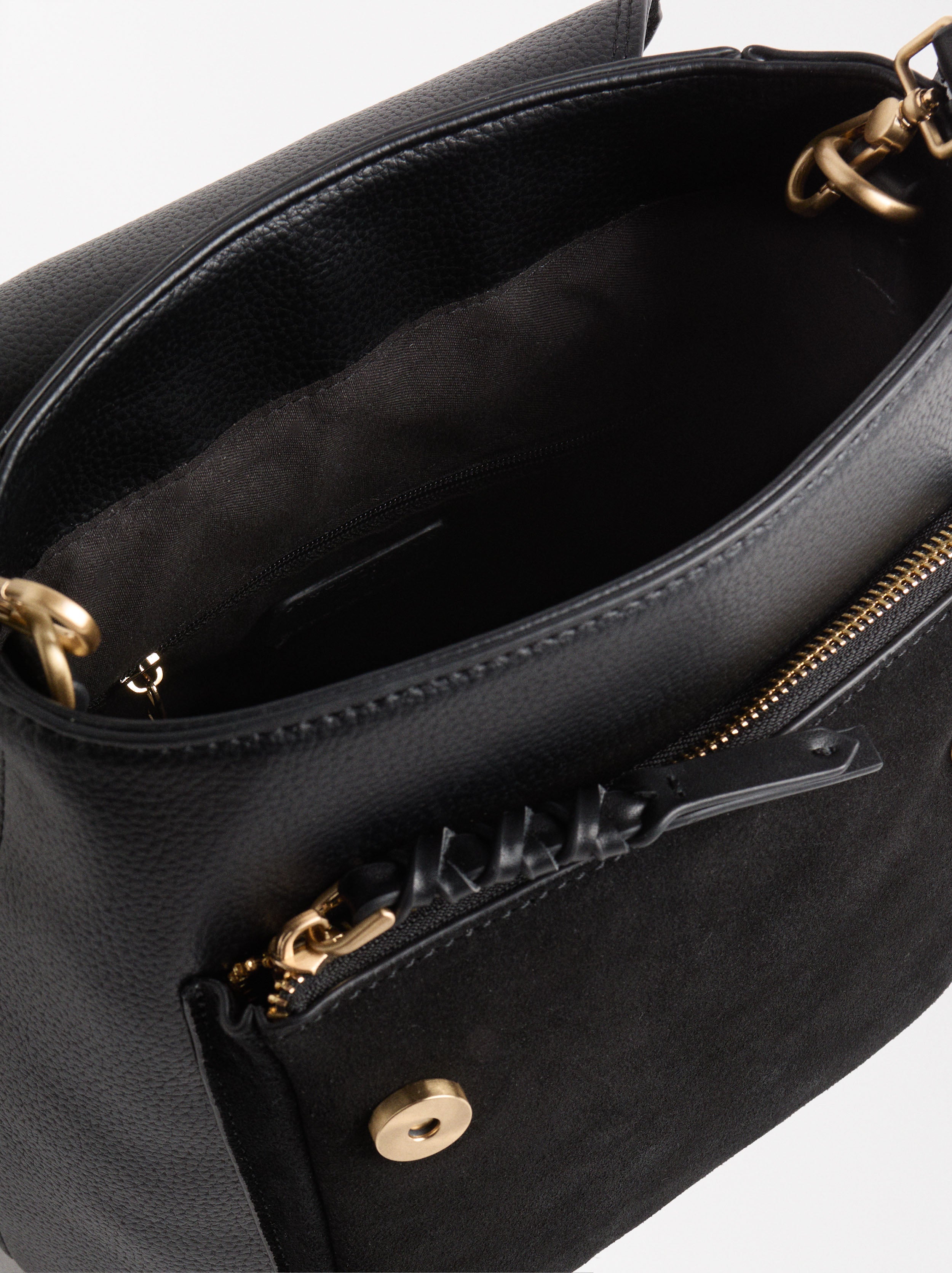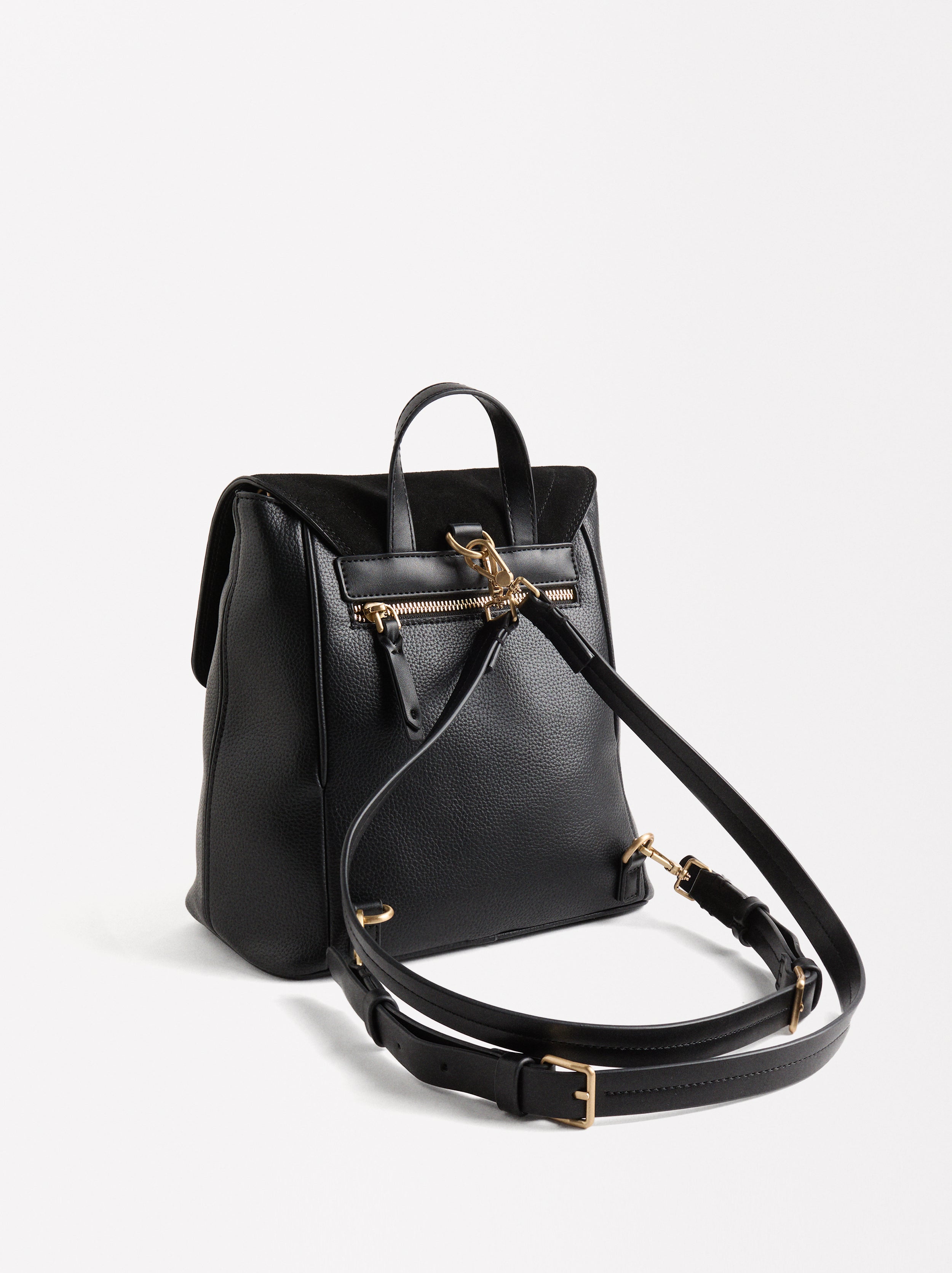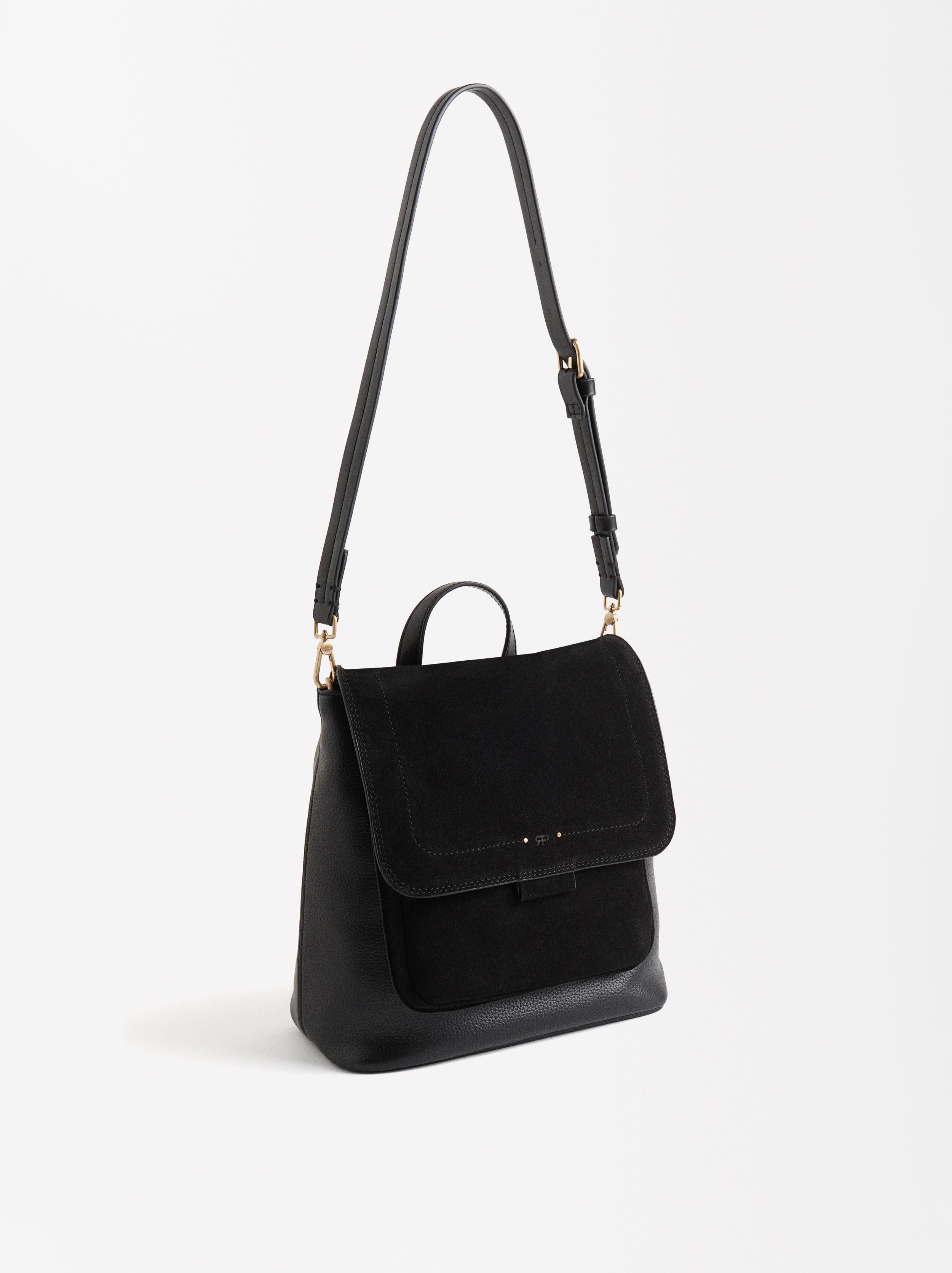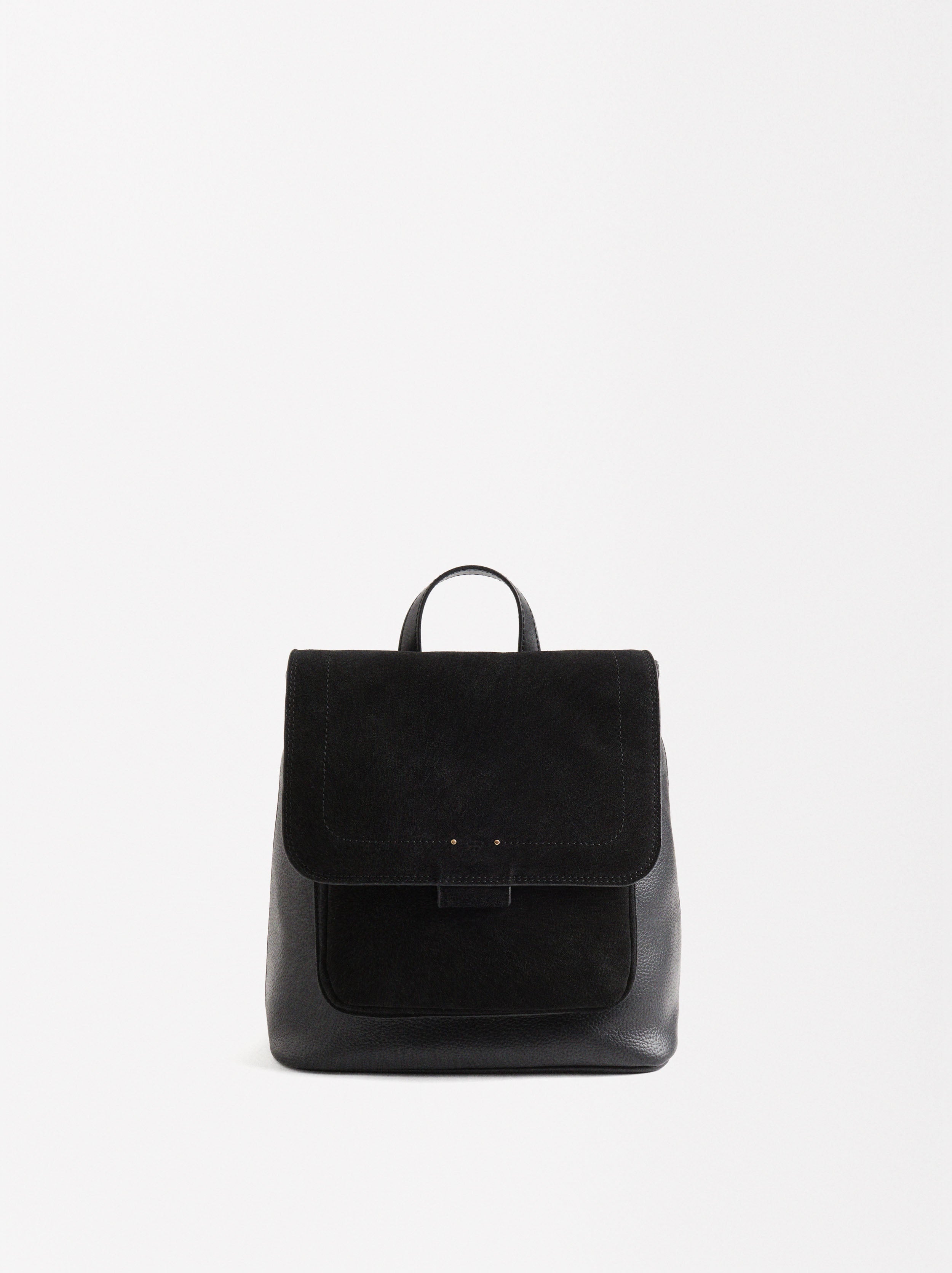 Mochila con piel. Forro y bolsillo interior. Bolsillo exterior con cierre de cremallera. Cierre principal de solapa con imán. Asas multifunción, ajustables y removibles. Asa fija superior.
