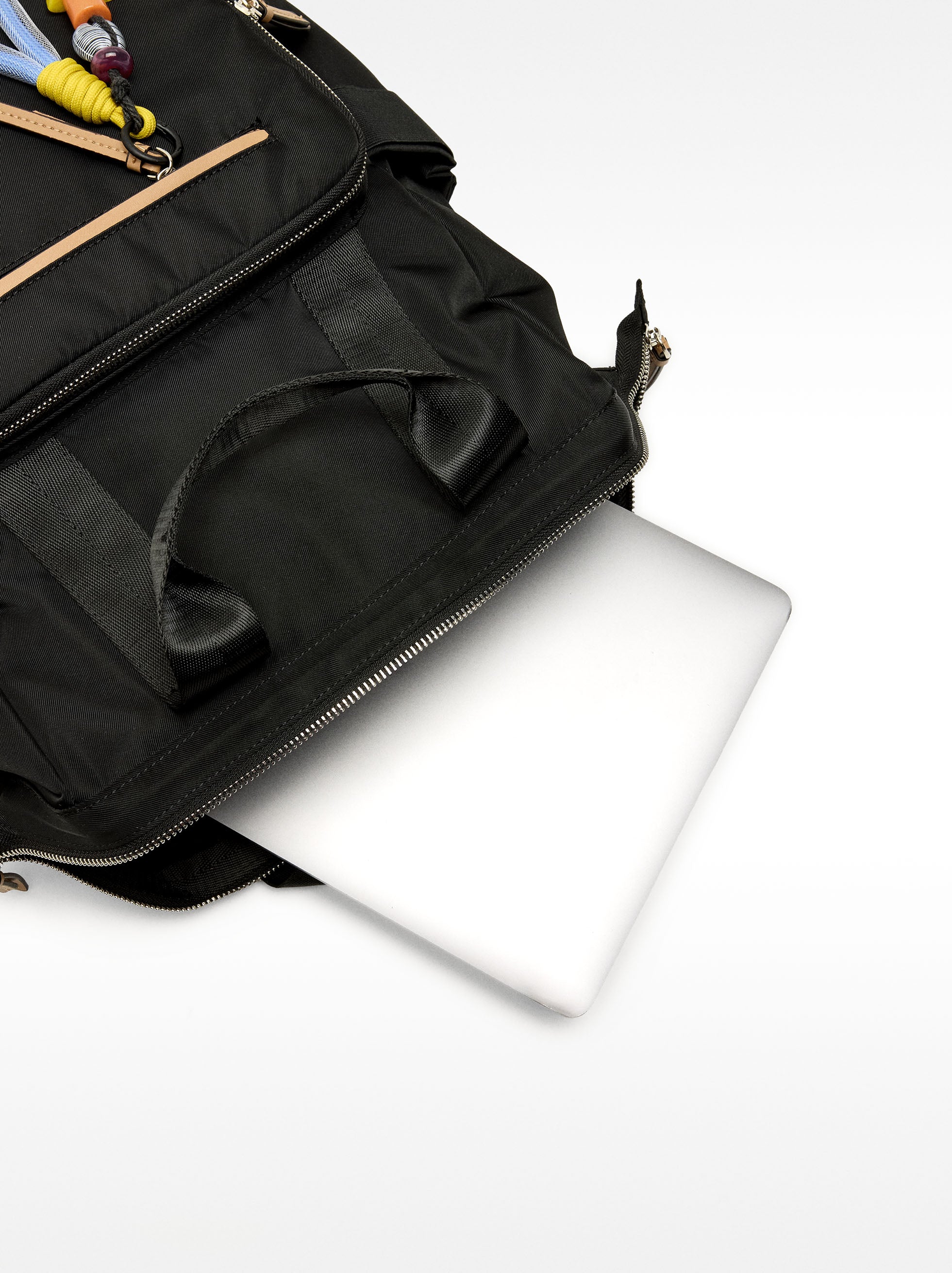 Mochila efecto nylon para portátil de 13". Forro interior y bolsillo interno. Bolsillo exterior con cremallera y colgante removible. Bolsillos laterales. Bolsillo trasero con cremallera. Asas de mano. Tirantes ajustables. Cierre de cremallera.