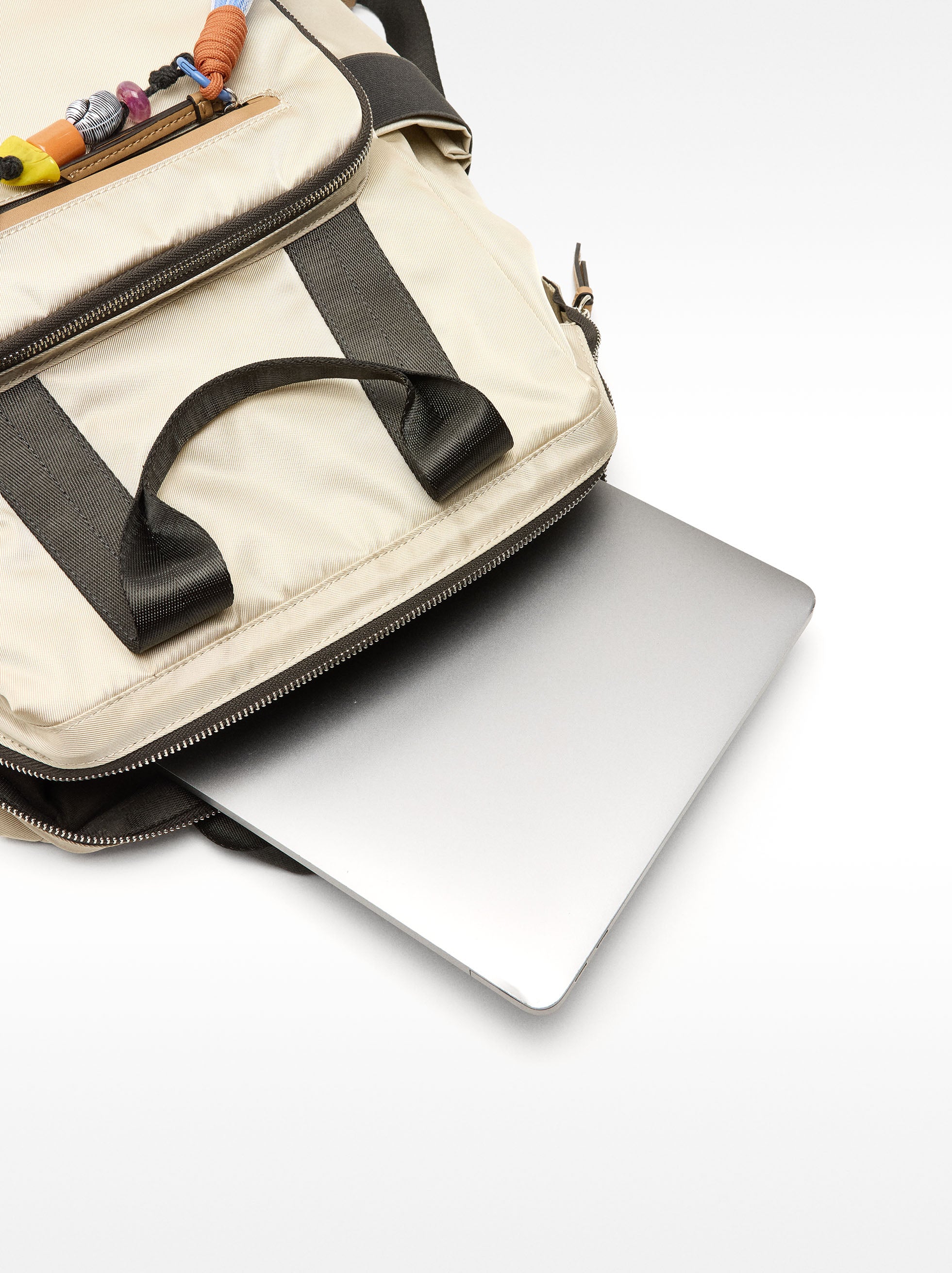 Mochila efecto nylon para portátil de 13". Forro interior y bolsillo interno. Bolsillo exterior con cremallera y colgante removible. Bolsillos laterales. Bolsillo trasero con cremallera. Asas de mano. Tirantes ajustables. Cierre de cremallera.