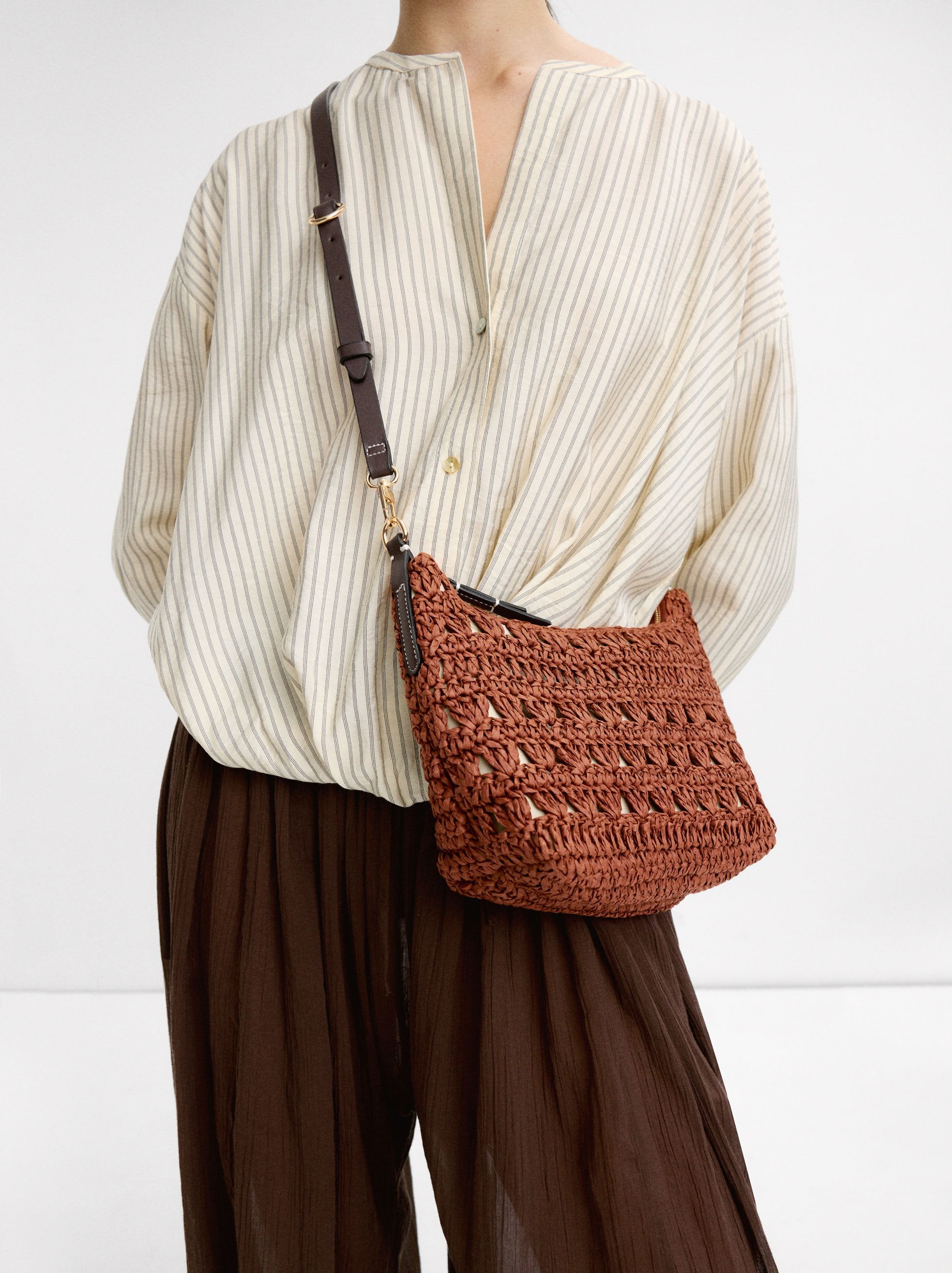 Bolso de hombro con efecto rafia y asa bandolera, ajustable y extraíble. Forro y bolsillo interior. Cierre de cremallera.