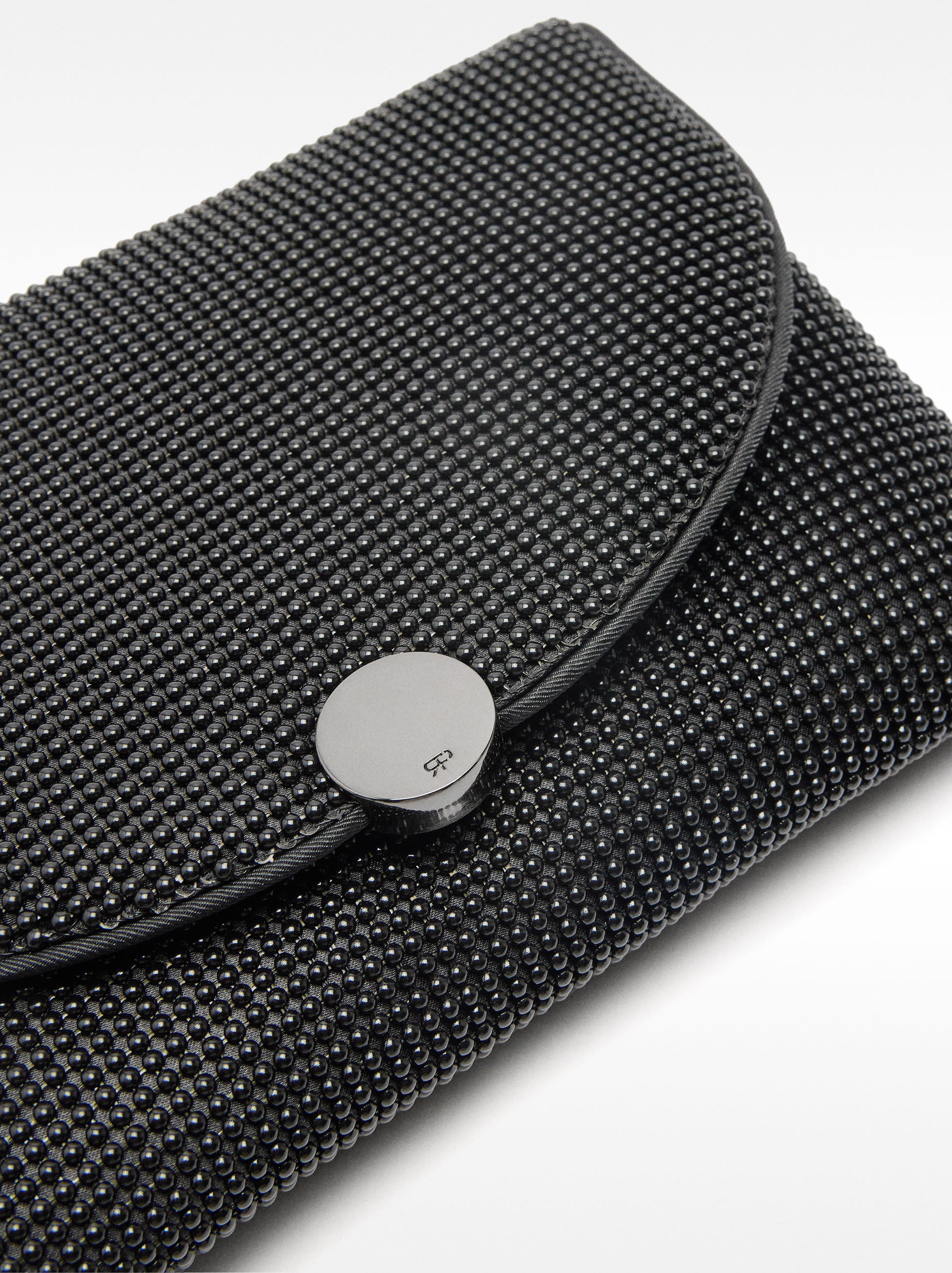 Bolso de fiesta tipo sobre con tejido de malla metálica. Forro y bolsillo interior. Asa de cadena removible. Asa de mano fija. Cierre de solapa magnética.