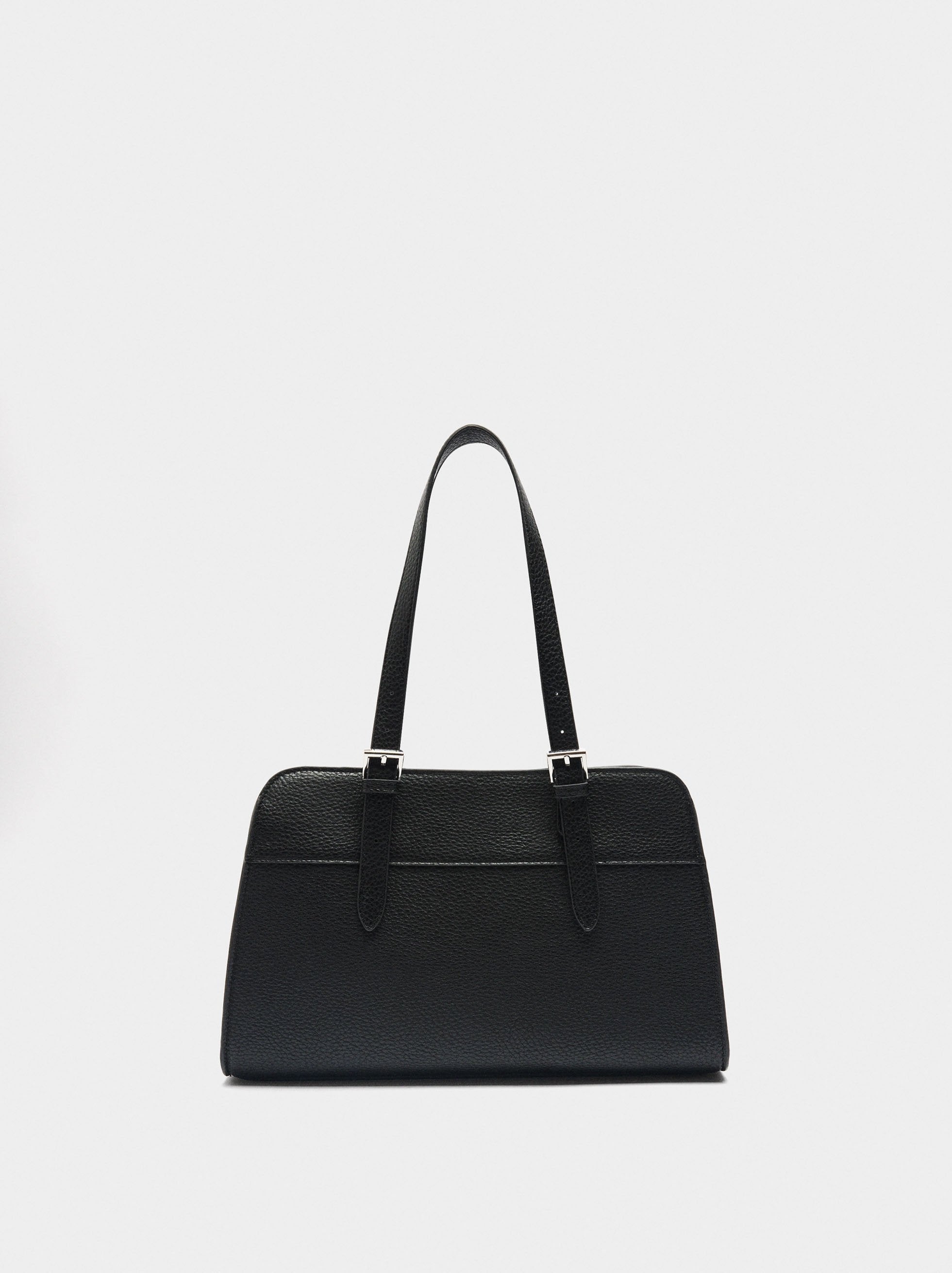 Bolso tote con textura. Tamaño mediano. Forro y bolsillo interior con cierre de cremallera. Cierre principal de imán. Detalle de hebillas en los laterales. Costuras marcadas en la parte delantera. Asas ajustables.
